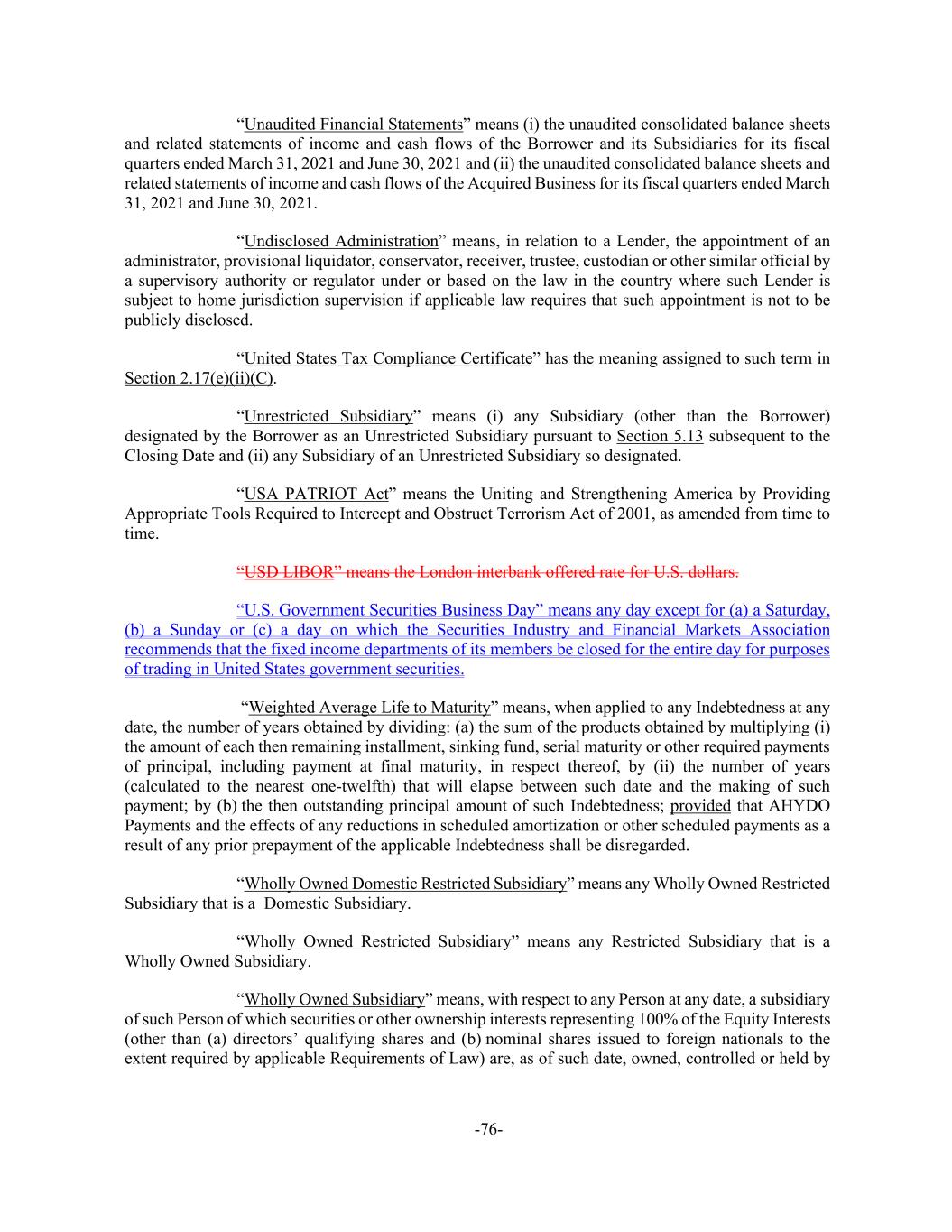 -76- “Unaudited Financial Statements” means (i) the unaudited consolidated balance sheets and related statements of income and cash flows of the Borrower and its Subsidiaries for its fiscal quarters ended March 31, 2021 and June 30, 2021 and (ii) the unaudited consolidated balance sheets and related statements of income and cash flows of the Acquired Business for its fiscal quarters ended March 31, 2021 and June 30, 2021. “Undisclosed Administration” means, in relation to a Lender, the appointment of an administrator, provisional liquidator, conservator, receiver, trustee, custodian or other similar official by a supervisory authority or regulator under or based on the law in the country where such Lender is subject to home jurisdiction supervision if applicable law requires that such appointment is not to be publicly disclosed. “United States Tax Compliance Certificate” has the meaning assigned to such term in Section 2.17(e)(ii)(C). “Unrestricted Subsidiary” means (i) any Subsidiary (other than the Borrower) designated by the Borrower as an Unrestricted Subsidiary pursuant to Section 5.13 subsequent to the Closing Date and (ii) any Subsidiary of an Unrestricted Subsidiary so designated. “USA PATRIOT Act” means the Uniting and Strengthening America by Providing Appropriate Tools Required to Intercept and Obstruct Terrorism Act of 2001, as amended from time to time. “USD LIBOR” means the London interbank offered rate for U.S. dollars. “U.S. Government Securities Business Day” means any day except for (a) a Saturday, (b) a Sunday or (c) a day on which the Securities Industry and Financial Markets Association recommends that the fixed income departments of its members be closed for the entire day for purposes of trading in United States government securities. “Weighted Average Life to Maturity” means, when applied to any Indebtedness at any date, the number of years obtained by dividing: (a) the sum of the products obtained by multiplying (i) the amount of each then remaining installment, sinking fund, serial maturity or other required payments of principal, including payment at final maturity, in respect thereof, by (ii) the number of years (calculated to the nearest one-twelfth) that will elapse between such date and the making of such payment; by (b) the then outstanding principal amount of such Indebtedness; provided that AHYDO Payments and the effects of any reductions in scheduled amortization or other scheduled payments as a result of any prior prepayment of the applicable Indebtedness shall be disregarded. “Wholly Owned Domestic Restricted Subsidiary” means any Wholly Owned Restricted Subsidiary that is a Domestic Subsidiary. “Wholly Owned Restricted Subsidiary” means any Restricted Subsidiary that is a Wholly Owned Subsidiary. “Wholly Owned Subsidiary” means, with respect to any Person at any date, a subsidiary of such Person of which securities or other ownership interests representing 100% of the Equity Interests (other than (a) directors’ qualifying shares and (b) nominal shares issued to foreign nationals to the extent required by applicable Requirements of Law) are, as of such date, owned, controlled or held by