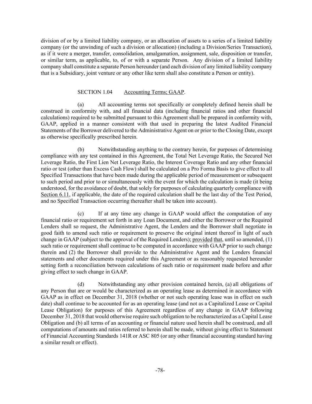 -78- division of or by a limited liability company, or an allocation of assets to a series of a limited liability company (or the unwinding of such a division or allocation) (including a Division/Series Transaction), as if it were a merger, transfer, consolidation, amalgamation, assignment, sale, disposition or transfer, or similar term, as applicable, to, of or with a separate Person. Any division of a limited liability company shall constitute a separate Person hereunder (and each division of any limited liability company that is a Subsidiary, joint venture or any other like term shall also constitute a Person or entity). SECTION 1.04 Accounting Terms; GAAP. (a) All accounting terms not specifically or completely defined herein shall be construed in conformity with, and all financial data (including financial ratios and other financial calculations) required to be submitted pursuant to this Agreement shall be prepared in conformity with, GAAP, applied in a manner consistent with that used in preparing the latest Audited Financial Statements of the Borrower delivered to the Administrative Agent on or prior to the Closing Date, except as otherwise specifically prescribed herein. (b) Notwithstanding anything to the contrary herein, for purposes of determining compliance with any test contained in this Agreement, the Total Net Leverage Ratio, the Secured Net Leverage Ratio, the First Lien Net Leverage Ratio, the Interest Coverage Ratio and any other financial ratio or test (other than Excess Cash Flow) shall be calculated on a Pro Forma Basis to give effect to all Specified Transactions that have been made during the applicable period of measurement or subsequent to such period and prior to or simultaneously with the event for which the calculation is made (it being understood, for the avoidance of doubt, that solely for purposes of calculating quarterly compliance with Section 6.11, if applicable, the date of the required calculation shall be the last day of the Test Period, and no Specified Transaction occurring thereafter shall be taken into account). (c) If at any time any change in GAAP would affect the computation of any financial ratio or requirement set forth in any Loan Document, and either the Borrower or the Required Lenders shall so request, the Administrative Agent, the Lenders and the Borrower shall negotiate in good faith to amend such ratio or requirement to preserve the original intent thereof in light of such change in GAAP (subject to the approval of the Required Lenders); provided that, until so amended, (1) such ratio or requirement shall continue to be computed in accordance with GAAP prior to such change therein and (2) the Borrower shall provide to the Administrative Agent and the Lenders financial statements and other documents required under this Agreement or as reasonably requested hereunder setting forth a reconciliation between calculations of such ratio or requirement made before and after giving effect to such change in GAAP. (d) Notwithstanding any other provision contained herein, (a) all obligations of any Person that are or would be characterized as an operating lease as determined in accordance with GAAP as in effect on December 31, 2018 (whether or not such operating lease was in effect on such date) shall continue to be accounted for as an operating lease (and not as a Capitalized Lease or Capital Lease Obligation) for purposes of this Agreement regardless of any change in GAAP following December 31, 2018 that would otherwise require such obligation to be recharacterized as a Capital Lease Obligation and (b) all terms of an accounting or financial nature used herein shall be construed, and all computations of amounts and ratios referred to herein shall be made, without giving effect to Statement of Financial Accounting Standards 141R or ASC 805 (or any other financial accounting standard having a similar result or effect).