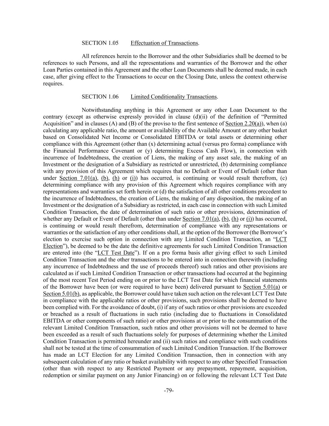 -79- SECTION 1.05 Effectuation of Transactions. All references herein to the Borrower and the other Subsidiaries shall be deemed to be references to such Persons, and all the representations and warranties of the Borrower and the other Loan Parties contained in this Agreement and the other Loan Documents shall be deemed made, in each case, after giving effect to the Transactions to occur on the Closing Date, unless the context otherwise requires. SECTION 1.06 Limited Conditionality Transactions. Notwithstanding anything in this Agreement or any other Loan Document to the contrary (except as otherwise expressly provided in clause (d)(ii) of the definition of “Permitted Acquisition” and in clauses (A) and (B) of the proviso to the first sentence of Section 2.20(a)), when (a) calculating any applicable ratio, the amount or availability of the Available Amount or any other basket based on Consolidated Net Income or Consolidated EBITDA or total assets or determining other compliance with this Agreement (other than (x) determining actual (versus pro forma) compliance with the Financial Performance Covenant or (y) determining Excess Cash Flow), in connection with incurrence of Indebtedness, the creation of Liens, the making of any asset sale, the making of an Investment or the designation of a Subsidiary as restricted or unrestricted, (b) determining compliance with any provision of this Agreement which requires that no Default or Event of Default (other than under Section 7.01(a), (b), (h) or (i)) has occurred, is continuing or would result therefrom, (c) determining compliance with any provision of this Agreement which requires compliance with any representations and warranties set forth herein or (d) the satisfaction of all other conditions precedent to the incurrence of Indebtedness, the creation of Liens, the making of any disposition, the making of an Investment or the designation of a Subsidiary as restricted, in each case in connection with such Limited Condition Transaction, the date of determination of such ratio or other provisions, determination of whether any Default or Event of Default (other than under Section 7.01(a), (b), (h) or (i)) has occurred, is continuing or would result therefrom, determination of compliance with any representations or warranties or the satisfaction of any other conditions shall, at the option of the Borrower (the Borrower’s election to exercise such option in connection with any Limited Condition Transaction, an “LCT Election”), be deemed to be the date the definitive agreements for such Limited Condition Transaction are entered into (the “LCT Test Date”). If on a pro forma basis after giving effect to such Limited Condition Transaction and the other transactions to be entered into in connection therewith (including any incurrence of Indebtedness and the use of proceeds thereof) such ratios and other provisions are calculated as if such Limited Condition Transaction or other transactions had occurred at the beginning of the most recent Test Period ending on or prior to the LCT Test Date for which financial statements of the Borrower have been (or were required to have been) delivered pursuant to Section 5.01(a) or Section 5.01(b), as applicable, the Borrower could have taken such action on the relevant LCT Test Date in compliance with the applicable ratios or other provisions, such provisions shall be deemed to have been complied with. For the avoidance of doubt, (i) if any of such ratios or other provisions are exceeded or breached as a result of fluctuations in such ratio (including due to fluctuations in Consolidated EBITDA or other components of such ratio) or other provisions at or prior to the consummation of the relevant Limited Condition Transaction, such ratios and other provisions will not be deemed to have been exceeded as a result of such fluctuations solely for purposes of determining whether the Limited Condition Transaction is permitted hereunder and (ii) such ratios and compliance with such conditions shall not be tested at the time of consummation of such Limited Condition Transaction. If the Borrower has made an LCT Election for any Limited Condition Transaction, then in connection with any subsequent calculation of any ratio or basket availability with respect to any other Specified Transaction (other than with respect to any Restricted Payment or any prepayment, repayment, acquisition, redemption or similar payment on any Junior Financing) on or following the relevant LCT Test Date