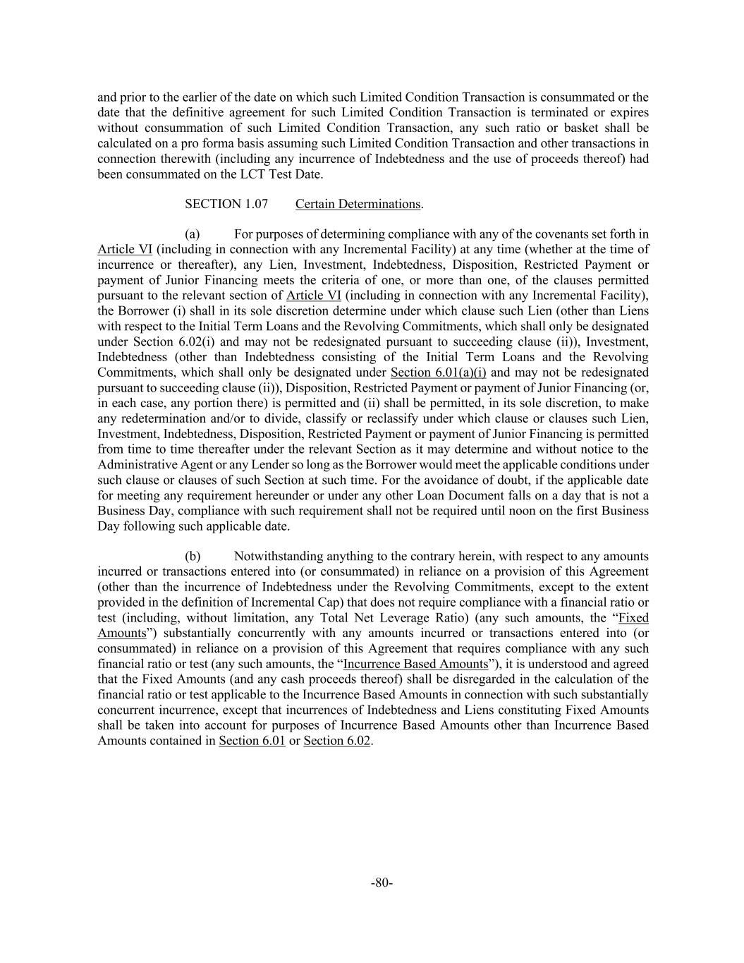 -80- and prior to the earlier of the date on which such Limited Condition Transaction is consummated or the date that the definitive agreement for such Limited Condition Transaction is terminated or expires without consummation of such Limited Condition Transaction, any such ratio or basket shall be calculated on a pro forma basis assuming such Limited Condition Transaction and other transactions in connection therewith (including any incurrence of Indebtedness and the use of proceeds thereof) had been consummated on the LCT Test Date. SECTION 1.07 Certain Determinations. (a) For purposes of determining compliance with any of the covenants set forth in Article VI (including in connection with any Incremental Facility) at any time (whether at the time of incurrence or thereafter), any Lien, Investment, Indebtedness, Disposition, Restricted Payment or payment of Junior Financing meets the criteria of one, or more than one, of the clauses permitted pursuant to the relevant section of Article VI (including in connection with any Incremental Facility), the Borrower (i) shall in its sole discretion determine under which clause such Lien (other than Liens with respect to the Initial Term Loans and the Revolving Commitments, which shall only be designated under Section 6.02(i) and may not be redesignated pursuant to succeeding clause (ii)), Investment, Indebtedness (other than Indebtedness consisting of the Initial Term Loans and the Revolving Commitments, which shall only be designated under Section 6.01(a)(i) and may not be redesignated pursuant to succeeding clause (ii)), Disposition, Restricted Payment or payment of Junior Financing (or, in each case, any portion there) is permitted and (ii) shall be permitted, in its sole discretion, to make any redetermination and/or to divide, classify or reclassify under which clause or clauses such Lien, Investment, Indebtedness, Disposition, Restricted Payment or payment of Junior Financing is permitted from time to time thereafter under the relevant Section as it may determine and without notice to the Administrative Agent or any Lender so long as the Borrower would meet the applicable conditions under such clause or clauses of such Section at such time. For the avoidance of doubt, if the applicable date for meeting any requirement hereunder or under any other Loan Document falls on a day that is not a Business Day, compliance with such requirement shall not be required until noon on the first Business Day following such applicable date. (b) Notwithstanding anything to the contrary herein, with respect to any amounts incurred or transactions entered into (or consummated) in reliance on a provision of this Agreement (other than the incurrence of Indebtedness under the Revolving Commitments, except to the extent provided in the definition of Incremental Cap) that does not require compliance with a financial ratio or test (including, without limitation, any Total Net Leverage Ratio) (any such amounts, the “Fixed Amounts”) substantially concurrently with any amounts incurred or transactions entered into (or consummated) in reliance on a provision of this Agreement that requires compliance with any such financial ratio or test (any such amounts, the “Incurrence Based Amounts”), it is understood and agreed that the Fixed Amounts (and any cash proceeds thereof) shall be disregarded in the calculation of the financial ratio or test applicable to the Incurrence Based Amounts in connection with such substantially concurrent incurrence, except that incurrences of Indebtedness and Liens constituting Fixed Amounts shall be taken into account for purposes of Incurrence Based Amounts other than Incurrence Based Amounts contained in Section 6.01 or Section 6.02.