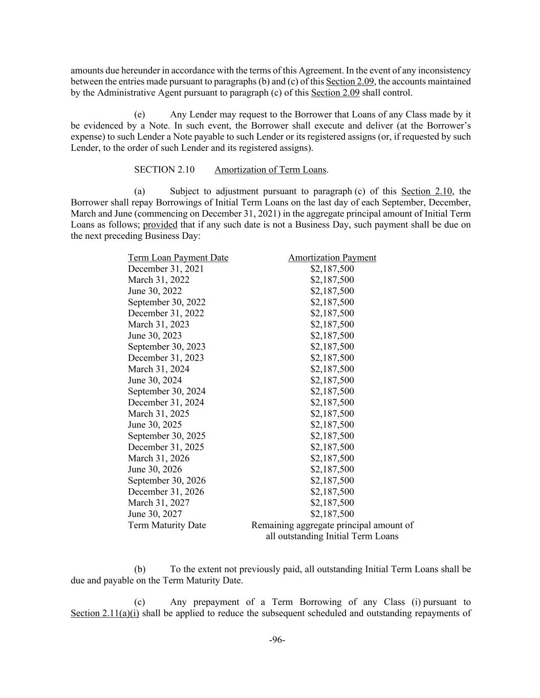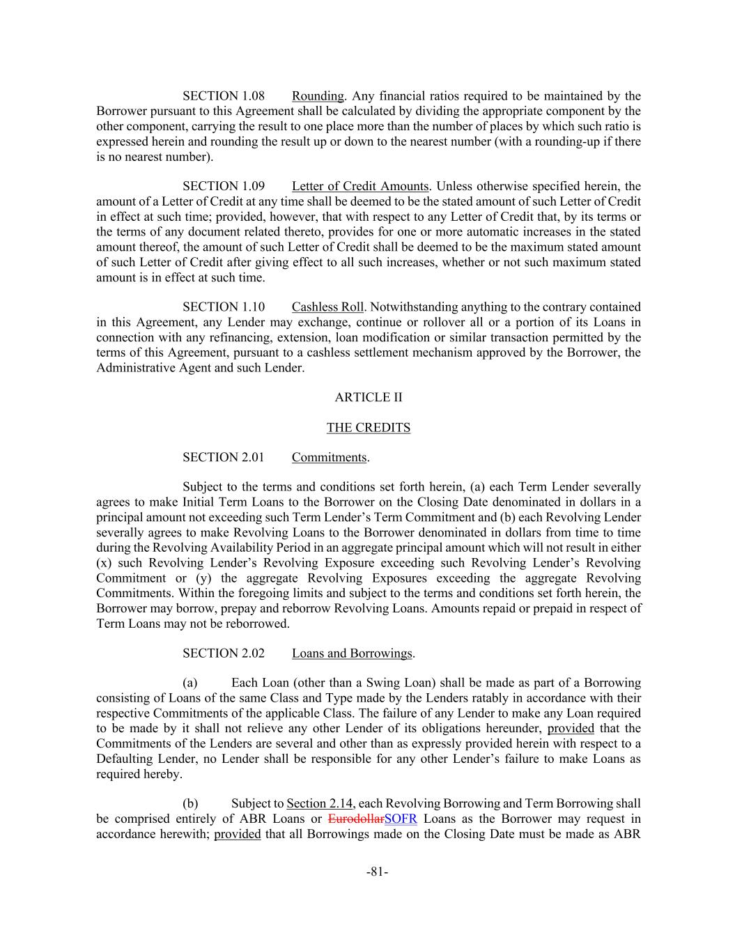-81- SECTION 1.08 Rounding. Any financial ratios required to be maintained by the Borrower pursuant to this Agreement shall be calculated by dividing the appropriate component by the other component, carrying the result to one place more than the number of places by which such ratio is expressed herein and rounding the result up or down to the nearest number (with a rounding-up if there is no nearest number). SECTION 1.09 Letter of Credit Amounts. Unless otherwise specified herein, the amount of a Letter of Credit at any time shall be deemed to be the stated amount of such Letter of Credit in effect at such time; provided, however, that with respect to any Letter of Credit that, by its terms or the terms of any document related thereto, provides for one or more automatic increases in the stated amount thereof, the amount of such Letter of Credit shall be deemed to be the maximum stated amount of such Letter of Credit after giving effect to all such increases, whether or not such maximum stated amount is in effect at such time. SECTION 1.10 Cashless Roll. Notwithstanding anything to the contrary contained in this Agreement, any Lender may exchange, continue or rollover all or a portion of its Loans in connection with any refinancing, extension, loan modification or similar transaction permitted by the terms of this Agreement, pursuant to a cashless settlement mechanism approved by the Borrower, the Administrative Agent and such Lender. ARTICLE II THE CREDITS SECTION 2.01 Commitments. Subject to the terms and conditions set forth herein, (a) each Term Lender severally agrees to make Initial Term Loans to the Borrower on the Closing Date denominated in dollars in a principal amount not exceeding such Term Lender’s Term Commitment and (b) each Revolving Lender severally agrees to make Revolving Loans to the Borrower denominated in dollars from time to time during the Revolving Availability Period in an aggregate principal amount which will not result in either (x) such Revolving Lender’s Revolving Exposure exceeding such Revolving Lender’s Revolving Commitment or (y) the aggregate Revolving Exposures exceeding the aggregate Revolving Commitments. Within the foregoing limits and subject to the terms and conditions set forth herein, the Borrower may borrow, prepay and reborrow Revolving Loans. Amounts repaid or prepaid in respect of Term Loans may not be reborrowed. SECTION 2.02 Loans and Borrowings. (a) Each Loan (other than a Swing Loan) shall be made as part of a Borrowing consisting of Loans of the same Class and Type made by the Lenders ratably in accordance with their respective Commitments of the applicable Class. The failure of any Lender to make any Loan required to be made by it shall not relieve any other Lender of its obligations hereunder, provided that the Commitments of the Lenders are several and other than as expressly provided herein with respect to a Defaulting Lender, no Lender shall be responsible for any other Lender’s failure to make Loans as required hereby. (b) Subject to Section 2.14, each Revolving Borrowing and Term Borrowing shall be comprised entirely of ABR Loans or EurodollarSOFR Loans as the Borrower may request in accordance herewith; provided that all Borrowings made on the Closing Date must be made as ABR