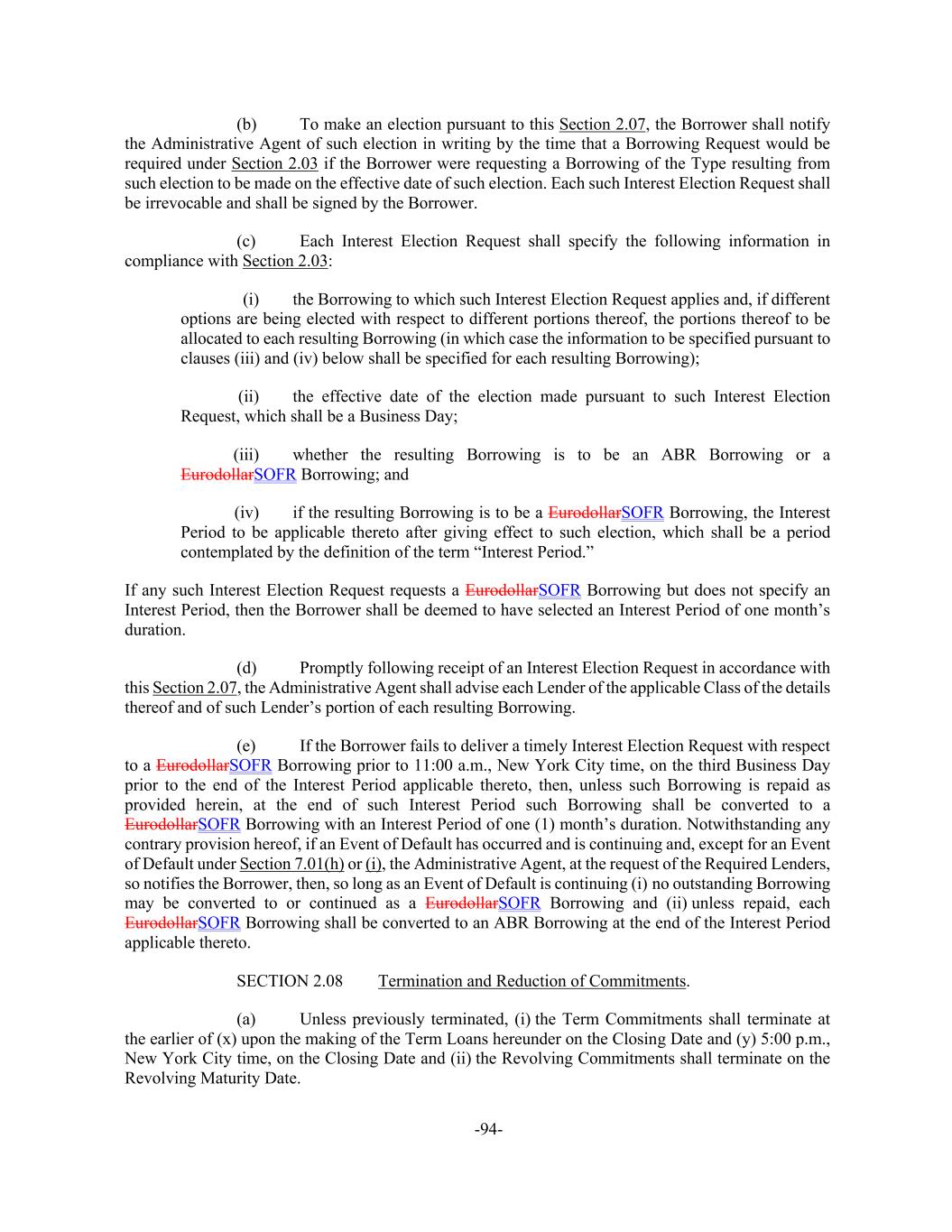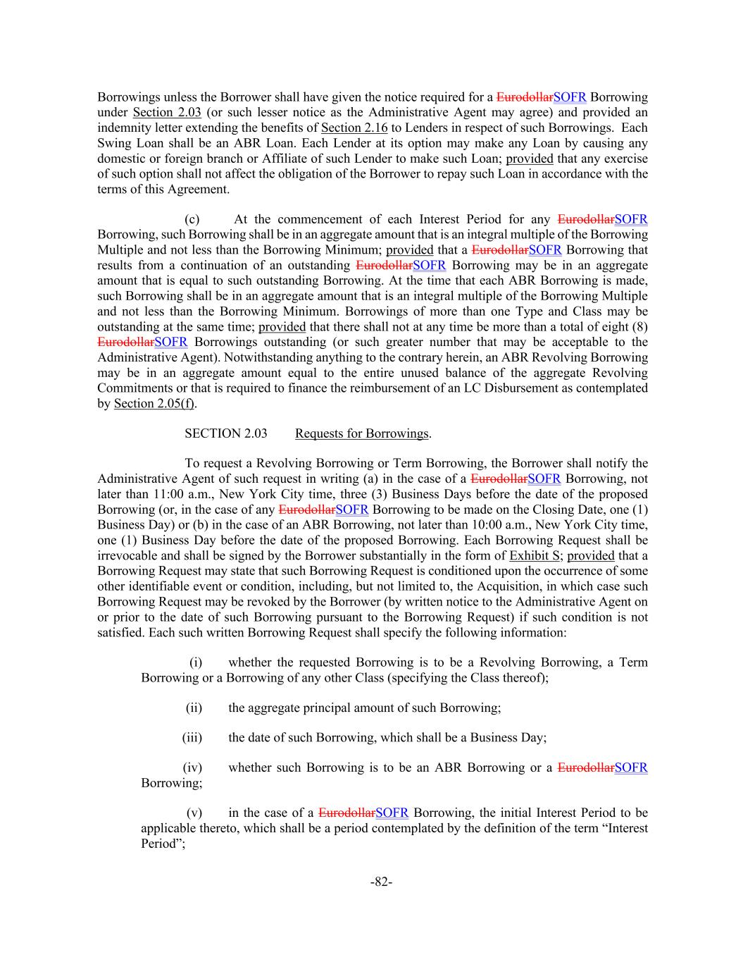 -82- Borrowings unless the Borrower shall have given the notice required for a EurodollarSOFR Borrowing under Section 2.03 (or such lesser notice as the Administrative Agent may agree) and provided an indemnity letter extending the benefits of Section 2.16 to Lenders in respect of such Borrowings. Each Swing Loan shall be an ABR Loan. Each Lender at its option may make any Loan by causing any domestic or foreign branch or Affiliate of such Lender to make such Loan; provided that any exercise of such option shall not affect the obligation of the Borrower to repay such Loan in accordance with the terms of this Agreement. (c) At the commencement of each Interest Period for any EurodollarSOFR Borrowing, such Borrowing shall be in an aggregate amount that is an integral multiple of the Borrowing Multiple and not less than the Borrowing Minimum; provided that a EurodollarSOFR Borrowing that results from a continuation of an outstanding EurodollarSOFR Borrowing may be in an aggregate amount that is equal to such outstanding Borrowing. At the time that each ABR Borrowing is made, such Borrowing shall be in an aggregate amount that is an integral multiple of the Borrowing Multiple and not less than the Borrowing Minimum. Borrowings of more than one Type and Class may be outstanding at the same time; provided that there shall not at any time be more than a total of eight (8) EurodollarSOFR Borrowings outstanding (or such greater number that may be acceptable to the Administrative Agent). Notwithstanding anything to the contrary herein, an ABR Revolving Borrowing may be in an aggregate amount equal to the entire unused balance of the aggregate Revolving Commitments or that is required to finance the reimbursement of an LC Disbursement as contemplated by Section 2.05(f). SECTION 2.03 Requests for Borrowings. To request a Revolving Borrowing or Term Borrowing, the Borrower shall notify the Administrative Agent of such request in writing (a) in the case of a EurodollarSOFR Borrowing, not later than 11:00 a.m., New York City time, three (3) Business Days before the date of the proposed Borrowing (or, in the case of any EurodollarSOFR Borrowing to be made on the Closing Date, one (1) Business Day) or (b) in the case of an ABR Borrowing, not later than 10:00 a.m., New York City time, one (1) Business Day before the date of the proposed Borrowing. Each Borrowing Request shall be irrevocable and shall be signed by the Borrower substantially in the form of Exhibit S; provided that a Borrowing Request may state that such Borrowing Request is conditioned upon the occurrence of some other identifiable event or condition, including, but not limited to, the Acquisition, in which case such Borrowing Request may be revoked by the Borrower (by written notice to the Administrative Agent on or prior to the date of such Borrowing pursuant to the Borrowing Request) if such condition is not satisfied. Each such written Borrowing Request shall specify the following information: (i) whether the requested Borrowing is to be a Revolving Borrowing, a Term Borrowing or a Borrowing of any other Class (specifying the Class thereof); (ii) the aggregate principal amount of such Borrowing; (iii) the date of such Borrowing, which shall be a Business Day; (iv) whether such Borrowing is to be an ABR Borrowing or a EurodollarSOFR Borrowing; (v) in the case of a EurodollarSOFR Borrowing, the initial Interest Period to be applicable thereto, which shall be a period contemplated by the definition of the term “Interest Period”;