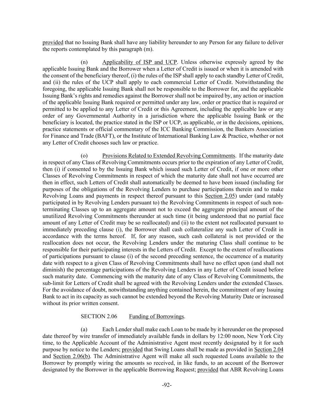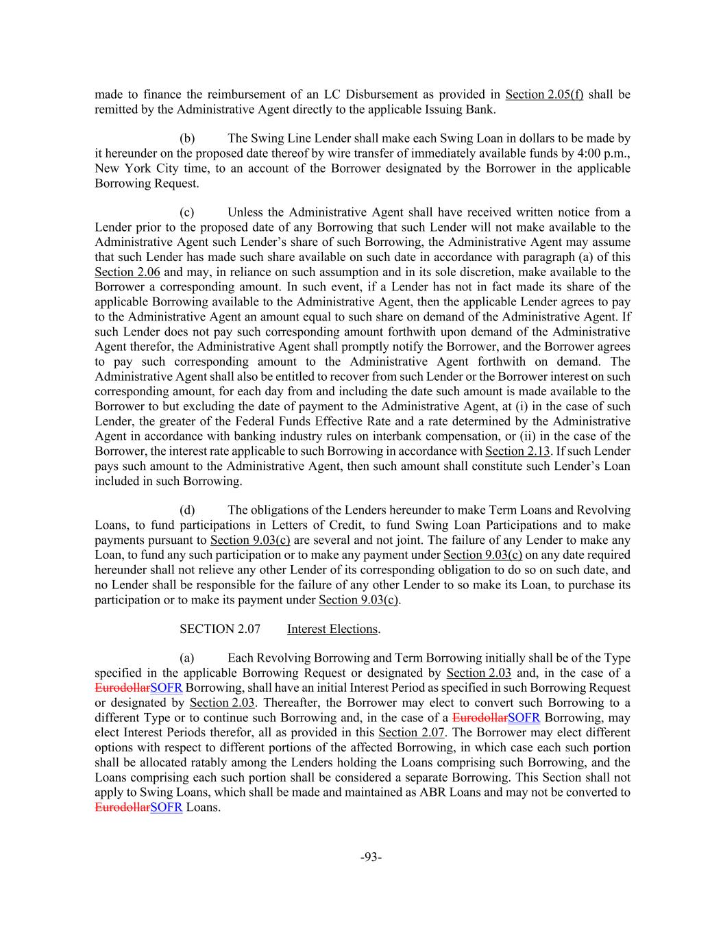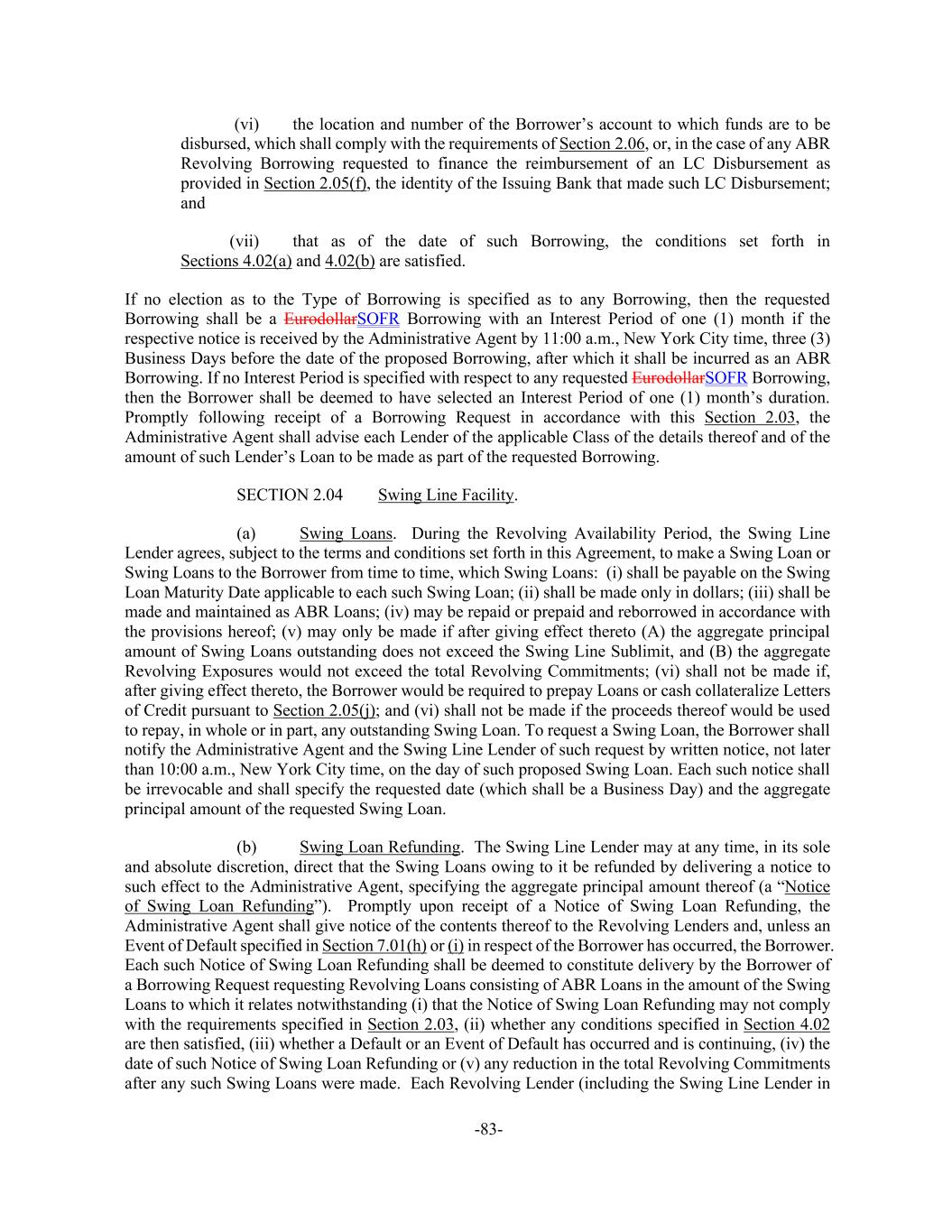 -83- (vi) the location and number of the Borrower’s account to which funds are to be disbursed, which shall comply with the requirements of Section 2.06, or, in the case of any ABR Revolving Borrowing requested to finance the reimbursement of an LC Disbursement as provided in Section 2.05(f), the identity of the Issuing Bank that made such LC Disbursement; and (vii) that as of the date of such Borrowing, the conditions set forth in Sections 4.02(a) and 4.02(b) are satisfied. If no election as to the Type of Borrowing is specified as to any Borrowing, then the requested Borrowing shall be a EurodollarSOFR Borrowing with an Interest Period of one (1) month if the respective notice is received by the Administrative Agent by 11:00 a.m., New York City time, three (3) Business Days before the date of the proposed Borrowing, after which it shall be incurred as an ABR Borrowing. If no Interest Period is specified with respect to any requested EurodollarSOFR Borrowing, then the Borrower shall be deemed to have selected an Interest Period of one (1) month’s duration. Promptly following receipt of a Borrowing Request in accordance with this Section 2.03, the Administrative Agent shall advise each Lender of the applicable Class of the details thereof and of the amount of such Lender’s Loan to be made as part of the requested Borrowing. SECTION 2.04 Swing Line Facility. (a) Swing Loans. During the Revolving Availability Period, the Swing Line Lender agrees, subject to the terms and conditions set forth in this Agreement, to make a Swing Loan or Swing Loans to the Borrower from time to time, which Swing Loans: (i) shall be payable on the Swing Loan Maturity Date applicable to each such Swing Loan; (ii) shall be made only in dollars; (iii) shall be made and maintained as ABR Loans; (iv) may be repaid or prepaid and reborrowed in accordance with the provisions hereof; (v) may only be made if after giving effect thereto (A) the aggregate principal amount of Swing Loans outstanding does not exceed the Swing Line Sublimit, and (B) the aggregate Revolving Exposures would not exceed the total Revolving Commitments; (vi) shall not be made if, after giving effect thereto, the Borrower would be required to prepay Loans or cash collateralize Letters of Credit pursuant to Section 2.05(j); and (vi) shall not be made if the proceeds thereof would be used to repay, in whole or in part, any outstanding Swing Loan. To request a Swing Loan, the Borrower shall notify the Administrative Agent and the Swing Line Lender of such request by written notice, not later than 10:00 a.m., New York City time, on the day of such proposed Swing Loan. Each such notice shall be irrevocable and shall specify the requested date (which shall be a Business Day) and the aggregate principal amount of the requested Swing Loan. (b) Swing Loan Refunding. The Swing Line Lender may at any time, in its sole and absolute discretion, direct that the Swing Loans owing to it be refunded by delivering a notice to such effect to the Administrative Agent, specifying the aggregate principal amount thereof (a “Notice of Swing Loan Refunding”). Promptly upon receipt of a Notice of Swing Loan Refunding, the Administrative Agent shall give notice of the contents thereof to the Revolving Lenders and, unless an Event of Default specified in Section 7.01(h) or (i) in respect of the Borrower has occurred, the Borrower. Each such Notice of Swing Loan Refunding shall be deemed to constitute delivery by the Borrower of a Borrowing Request requesting Revolving Loans consisting of ABR Loans in the amount of the Swing Loans to which it relates notwithstanding (i) that the Notice of Swing Loan Refunding may not comply with the requirements specified in Section 2.03, (ii) whether any conditions specified in Section 4.02 are then satisfied, (iii) whether a Default or an Event of Default has occurred and is continuing, (iv) the date of such Notice of Swing Loan Refunding or (v) any reduction in the total Revolving Commitments after any such Swing Loans were made. Each Revolving Lender (including the Swing Line Lender in