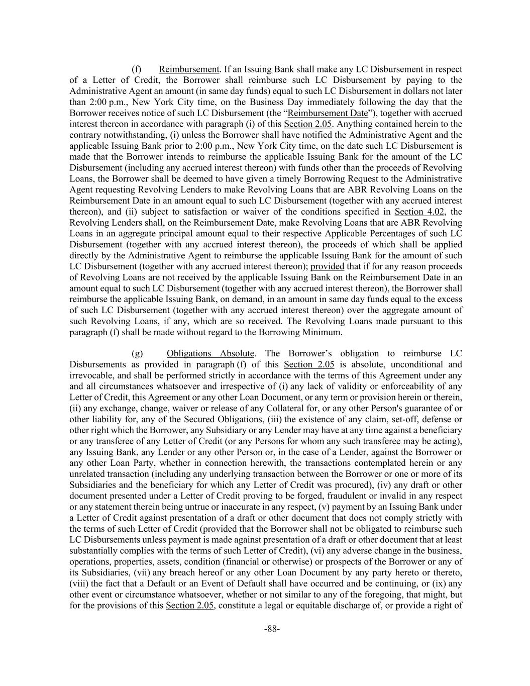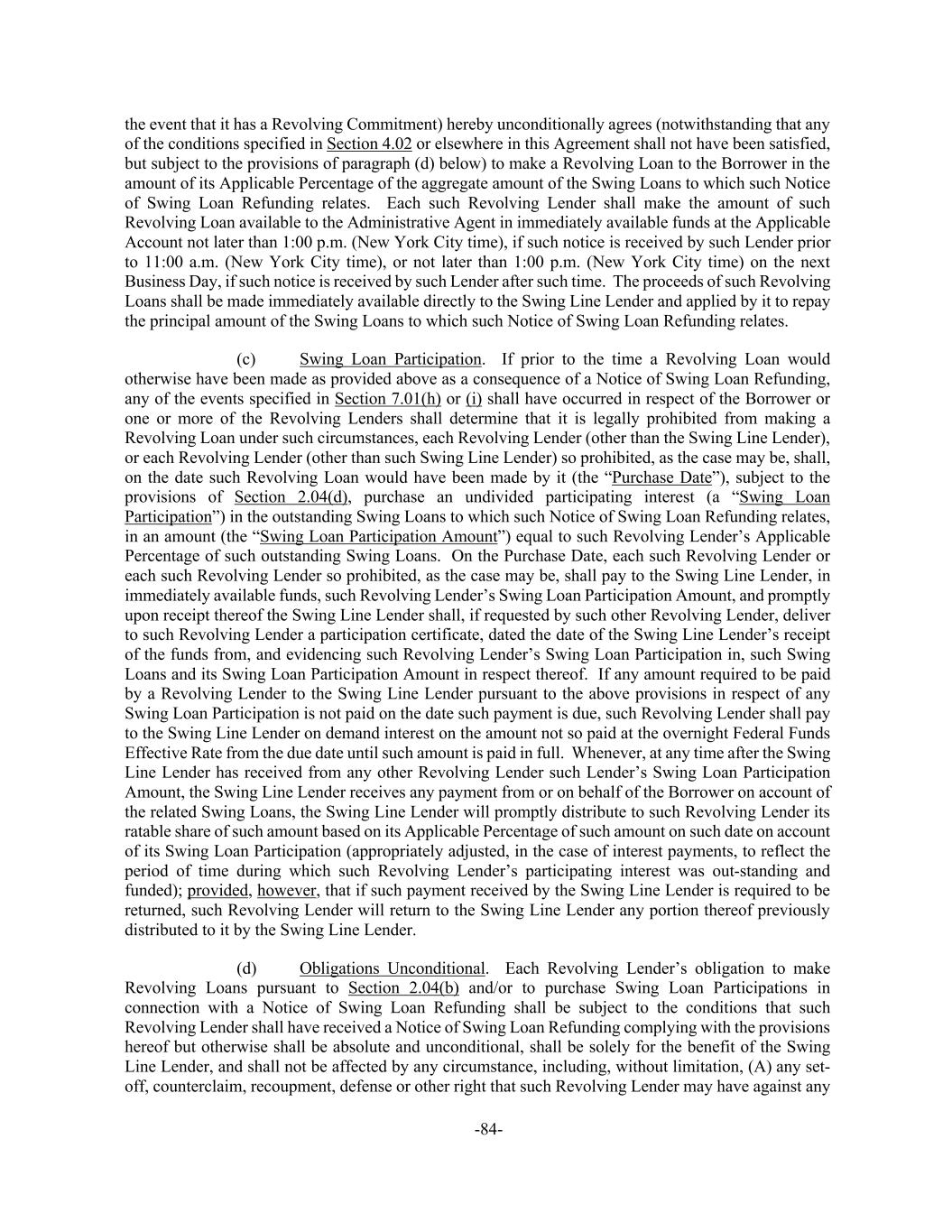 -84- the event that it has a Revolving Commitment) hereby unconditionally agrees (notwithstanding that any of the conditions specified in Section 4.02 or elsewhere in this Agreement shall not have been satisfied, but subject to the provisions of paragraph (d) below) to make a Revolving Loan to the Borrower in the amount of its Applicable Percentage of the aggregate amount of the Swing Loans to which such Notice of Swing Loan Refunding relates. Each such Revolving Lender shall make the amount of such Revolving Loan available to the Administrative Agent in immediately available funds at the Applicable Account not later than 1:00 p.m. (New York City time), if such notice is received by such Lender prior to 11:00 a.m. (New York City time), or not later than 1:00 p.m. (New York City time) on the next Business Day, if such notice is received by such Lender after such time. The proceeds of such Revolving Loans shall be made immediately available directly to the Swing Line Lender and applied by it to repay the principal amount of the Swing Loans to which such Notice of Swing Loan Refunding relates. (c) Swing Loan Participation. If prior to the time a Revolving Loan would otherwise have been made as provided above as a consequence of a Notice of Swing Loan Refunding, any of the events specified in Section 7.01(h) or (i) shall have occurred in respect of the Borrower or one or more of the Revolving Lenders shall determine that it is legally prohibited from making a Revolving Loan under such circumstances, each Revolving Lender (other than the Swing Line Lender), or each Revolving Lender (other than such Swing Line Lender) so prohibited, as the case may be, shall, on the date such Revolving Loan would have been made by it (the “Purchase Date”), subject to the provisions of Section 2.04(d), purchase an undivided participating interest (a “Swing Loan Participation”) in the outstanding Swing Loans to which such Notice of Swing Loan Refunding relates, in an amount (the “Swing Loan Participation Amount”) equal to such Revolving Lender’s Applicable Percentage of such outstanding Swing Loans. On the Purchase Date, each such Revolving Lender or each such Revolving Lender so prohibited, as the case may be, shall pay to the Swing Line Lender, in immediately available funds, such Revolving Lender’s Swing Loan Participation Amount, and promptly upon receipt thereof the Swing Line Lender shall, if requested by such other Revolving Lender, deliver to such Revolving Lender a participation certificate, dated the date of the Swing Line Lender’s receipt of the funds from, and evidencing such Revolving Lender’s Swing Loan Participation in, such Swing Loans and its Swing Loan Participation Amount in respect thereof. If any amount required to be paid by a Revolving Lender to the Swing Line Lender pursuant to the above provisions in respect of any Swing Loan Participation is not paid on the date such payment is due, such Revolving Lender shall pay to the Swing Line Lender on demand interest on the amount not so paid at the overnight Federal Funds Effective Rate from the due date until such amount is paid in full. Whenever, at any time after the Swing Line Lender has received from any other Revolving Lender such Lender’s Swing Loan Participation Amount, the Swing Line Lender receives any payment from or on behalf of the Borrower on account of the related Swing Loans, the Swing Line Lender will promptly distribute to such Revolving Lender its ratable share of such amount based on its Applicable Percentage of such amount on such date on account of its Swing Loan Participation (appropriately adjusted, in the case of interest payments, to reflect the period of time during which such Revolving Lender’s participating interest was out-standing and funded); provided, however, that if such payment received by the Swing Line Lender is required to be returned, such Revolving Lender will return to the Swing Line Lender any portion thereof previously distributed to it by the Swing Line Lender. (d) Obligations Unconditional. Each Revolving Lender’s obligation to make Revolving Loans pursuant to Section 2.04(b) and/or to purchase Swing Loan Participations in connection with a Notice of Swing Loan Refunding shall be subject to the conditions that such Revolving Lender shall have received a Notice of Swing Loan Refunding complying with the provisions hereof but otherwise shall be absolute and unconditional, shall be solely for the benefit of the Swing Line Lender, and shall not be affected by any circumstance, including, without limitation, (A) any set- off, counterclaim, recoupment, defense or other right that such Revolving Lender may have against any