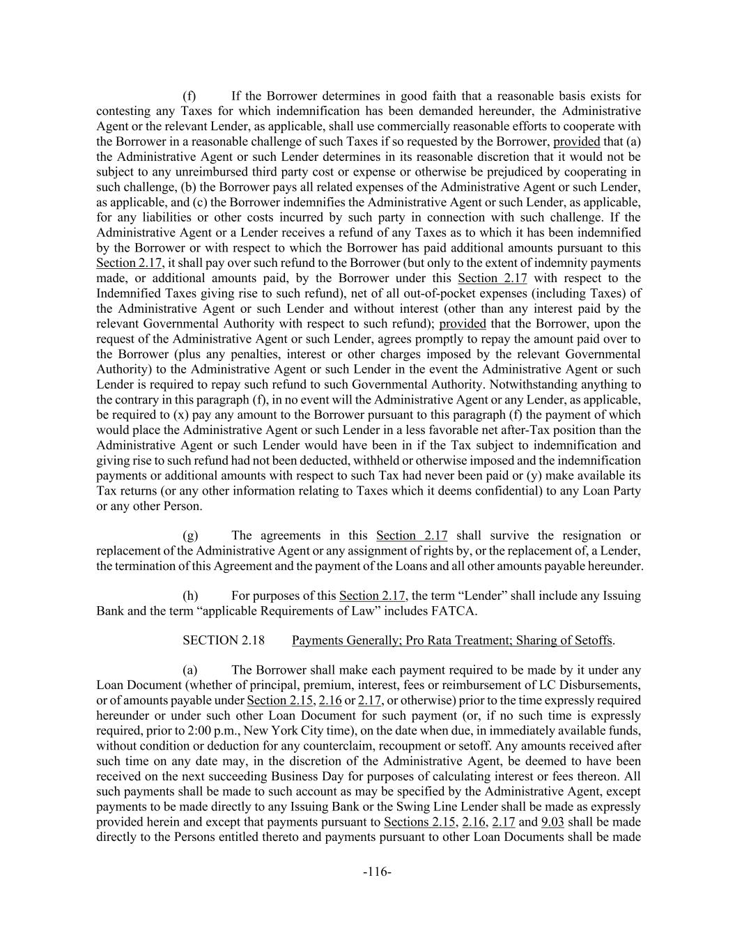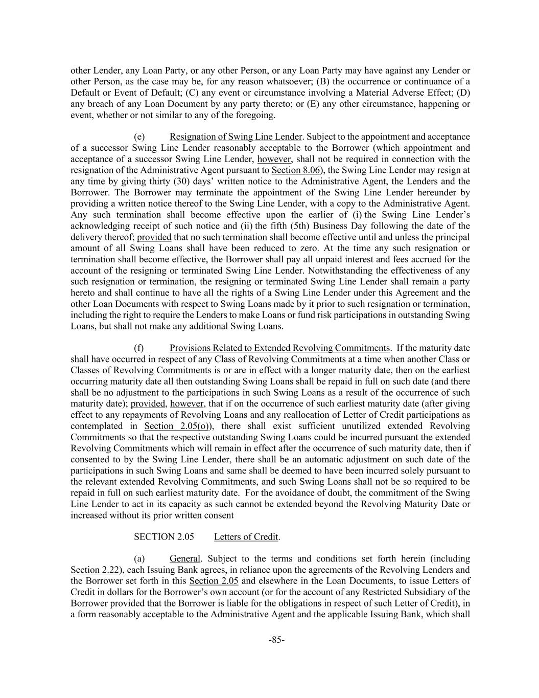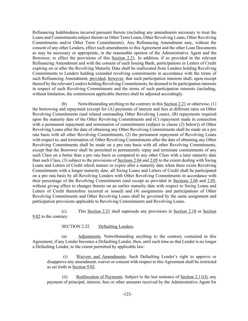 -123- Refinancing Indebtedness incurred pursuant thereto (including any amendments necessary to treat the Loans and Commitments subject thereto as Other Term Loans, Other Revolving Loans, Other Revolving Commitments and/or Other Term Commitments). Any Refinancing Amendment may, without the consent of any other Lenders, effect such amendments to this Agreement and the other Loan Documents as may be necessary or appropriate, in the reasonable opinion of the Administrative Agent and the Borrower, to effect the provisions of this Section 2.21. In addition, if so provided in the relevant Refinancing Amendment and with the consent of each Issuing Bank, participations in Letters of Credit expiring on or after the Revolving Maturity Date shall be reallocated from Lenders holding Revolving Commitments to Lenders holding extended revolving commitments in accordance with the terms of such Refinancing Amendment; provided, however, that such participation interests shall, upon receipt thereof by the relevant Lenders holding Revolving Commitments, be deemed to be participation interests in respect of such Revolving Commitments and the terms of such participation interests (including, without limitation, the commission applicable thereto) shall be adjusted accordingly. (b) Notwithstanding anything to the contrary in this Section 2.21 or otherwise, (1) the borrowing and repayment (except for (A) payments of interest and fees at different rates on Other Revolving Commitments (and related outstanding Other Revolving Loans), (B) repayments required upon the maturity date of the Other Revolving Commitments and (C) repayment made in connection with a permanent repayment and termination of commitments (subject to clause (2) below)) of Other Revolving Loans after the date of obtaining any Other Revolving Commitments shall be made on a pro rata basis with all other Revolving Commitments, (2) the permanent repayment of Revolving Loans with respect to, and termination of, Other Revolving Commitments after the date of obtaining any Other Revolving Commitments shall be made on a pro rata basis with all other Revolving Commitments, except that the Borrower shall be permitted to permanently repay and terminate commitments of any such Class on a better than a pro rata basis as compared to any other Class with a later maturity date than such Class, (3) subject to the provisions of Sections 2.04 and 2.05 to the extent dealing with Swing Loans and Letters of Credit which mature or expire after a maturity date when there exists Revolving Commitments with a longer maturity date, all Swing Loans and Letters of Credit shall be participated on a pro rata basis by all Revolving Lenders with Other Revolving Commitments in accordance with their percentage of the Revolving Commitments (and except as provided in Sections 2.04 and 2.05, without giving effect to changes thereto on an earlier maturity date with respect to Swing Loans and Letters of Credit theretofore incurred or issued) and (4) assignments and participations of Other Revolving Commitments and Other Revolving Loans shall be governed by the same assignment and participation provisions applicable to Revolving Commitments and Revolving Loans. (c) This Section 2.21 shall supersede any provisions in Section 2.18 or Section 9.02 to the contrary. SECTION 2.22 Defaulting Lenders. (a) Adjustments. Notwithstanding anything to the contrary contained in this Agreement, if any Lender becomes a Defaulting Lender, then, until such time as that Lender is no longer a Defaulting Lender, to the extent permitted by applicable law: (i) Waivers and Amendments. Such Defaulting Lender’s right to approve or disapprove any amendment, waiver or consent with respect to this Agreement shall be restricted as set forth in Section 9.02. (ii) Reallocation of Payments. Subject to the last sentence of Section 2.11(f), any payment of principal, interest, fees or other amounts received by the Administrative Agent for