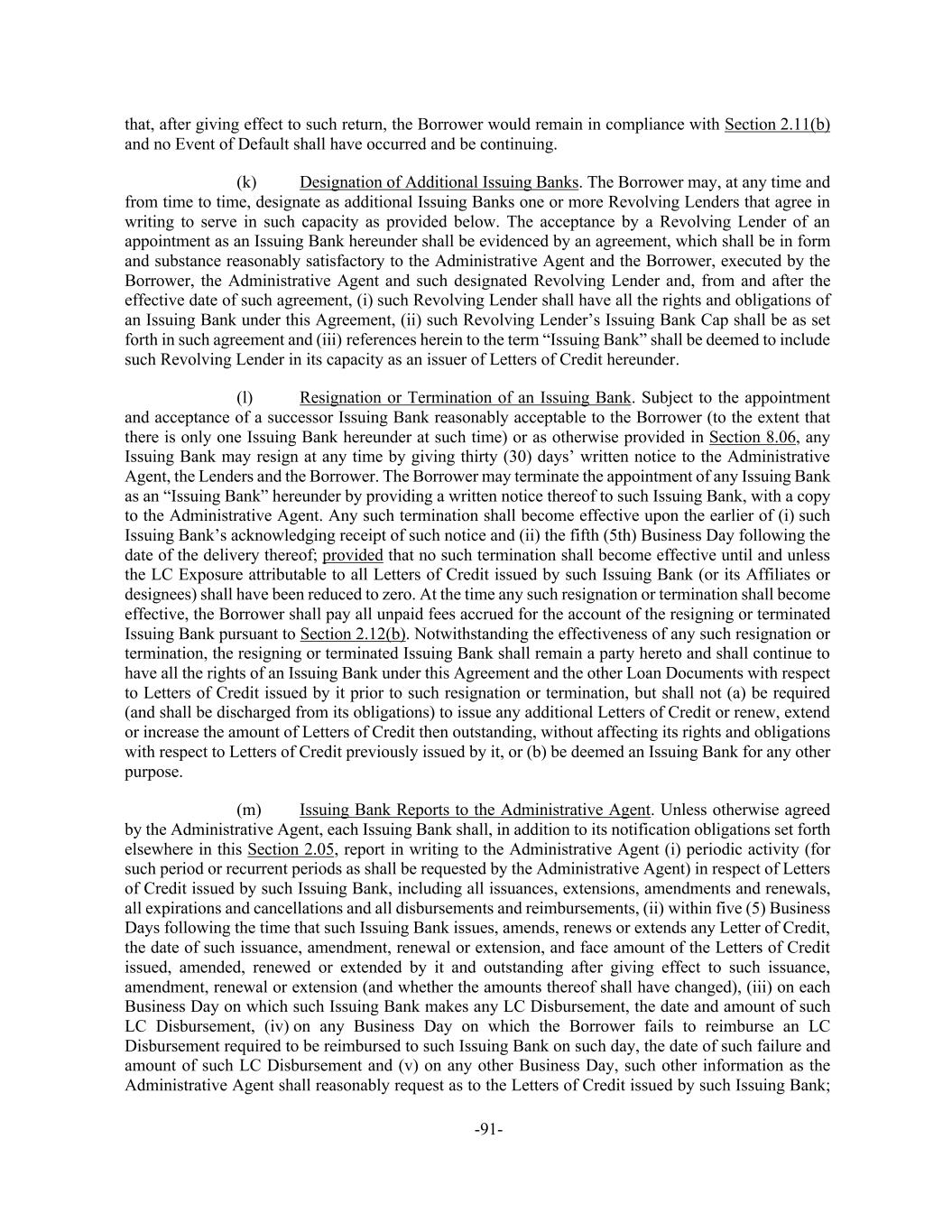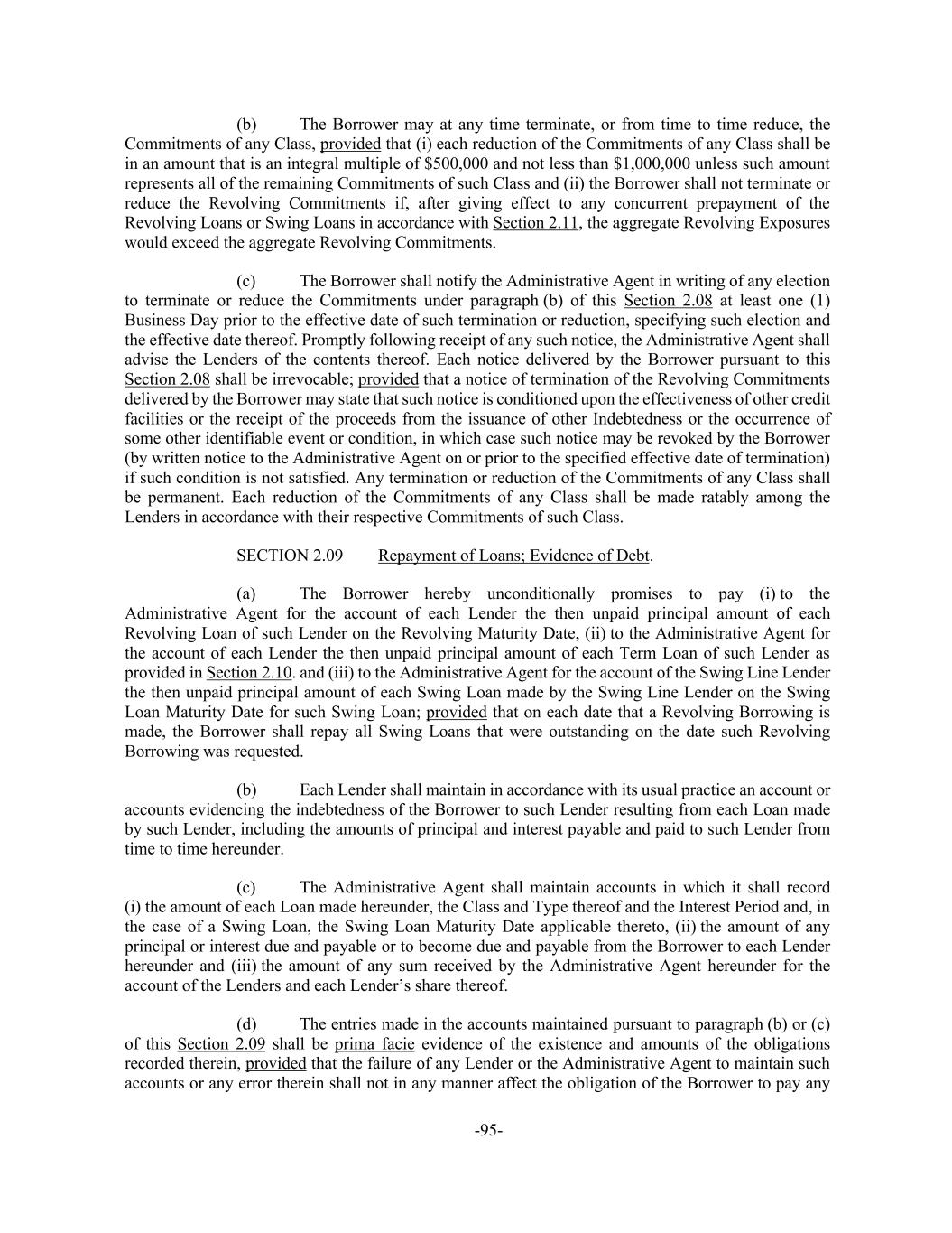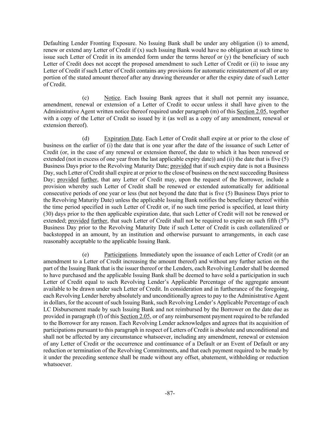 -123- Refinancing Indebtedness incurred pursuant thereto (including any amendments necessary to treat the Loans and Commitments subject thereto as Other Term Loans, Other Revolving Loans, Other Revolving Commitments and/or Other Term Commitments). Any Refinancing Amendment may, without the consent of any other Lenders, effect such amendments to this Agreement and the other Loan Documents as may be necessary or appropriate, in the reasonable opinion of the Administrative Agent and the Borrower, to effect the provisions of this Section 2.21. In addition, if so provided in the relevant Refinancing Amendment and with the consent of each Issuing Bank, participations in Letters of Credit expiring on or after the Revolving Maturity Date shall be reallocated from Lenders holding Revolving Commitments to Lenders holding extended revolving commitments in accordance with the terms of such Refinancing Amendment; provided, however, that such participation interests shall, upon receipt thereof by the relevant Lenders holding Revolving Commitments, be deemed to be participation interests in respect of such Revolving Commitments and the terms of such participation interests (including, without limitation, the commission applicable thereto) shall be adjusted accordingly. (b) Notwithstanding anything to the contrary in this Section 2.21 or otherwise, (1) the borrowing and repayment (except for (A) payments of interest and fees at different rates on Other Revolving Commitments (and related outstanding Other Revolving Loans), (B) repayments required upon the maturity date of the Other Revolving Commitments and (C) repayment made in connection with a permanent repayment and termination of commitments (subject to clause (2) below)) of Other Revolving Loans after the date of obtaining any Other Revolving Commitments shall be made on a pro rata basis with all other Revolving Commitments, (2) the permanent repayment of Revolving Loans with respect to, and termination of, Other Revolving Commitments after the date of obtaining any Other Revolving Commitments shall be made on a pro rata basis with all other Revolving Commitments, except that the Borrower shall be permitted to permanently repay and terminate commitments of any such Class on a better than a pro rata basis as compared to any other Class with a later maturity date than such Class, (3) subject to the provisions of Sections 2.04 and 2.05 to the extent dealing with Swing Loans and Letters of Credit which mature or expire after a maturity date when there exists Revolving Commitments with a longer maturity date, all Swing Loans and Letters of Credit shall be participated on a pro rata basis by all Revolving Lenders with Other Revolving Commitments in accordance with their percentage of the Revolving Commitments (and except as provided in Sections 2.04 and 2.05, without giving effect to changes thereto on an earlier maturity date with respect to Swing Loans and Letters of Credit theretofore incurred or issued) and (4) assignments and participations of Other Revolving Commitments and Other Revolving Loans shall be governed by the same assignment and participation provisions applicable to Revolving Commitments and Revolving Loans. (c) This Section 2.21 shall supersede any provisions in Section 2.18 or Section 9.02 to the contrary. SECTION 2.22 Defaulting Lenders. (a) Adjustments. Notwithstanding anything to the contrary contained in this Agreement, if any Lender becomes a Defaulting Lender, then, until such time as that Lender is no longer a Defaulting Lender, to the extent permitted by applicable law: (i) Waivers and Amendments. Such Defaulting Lender’s right to approve or disapprove any amendment, waiver or consent with respect to this Agreement shall be restricted as set forth in Section 9.02. (ii) Reallocation of Payments. Subject to the last sentence of Section 2.11(f), any payment of principal, interest, fees or other amounts received by the Administrative Agent for