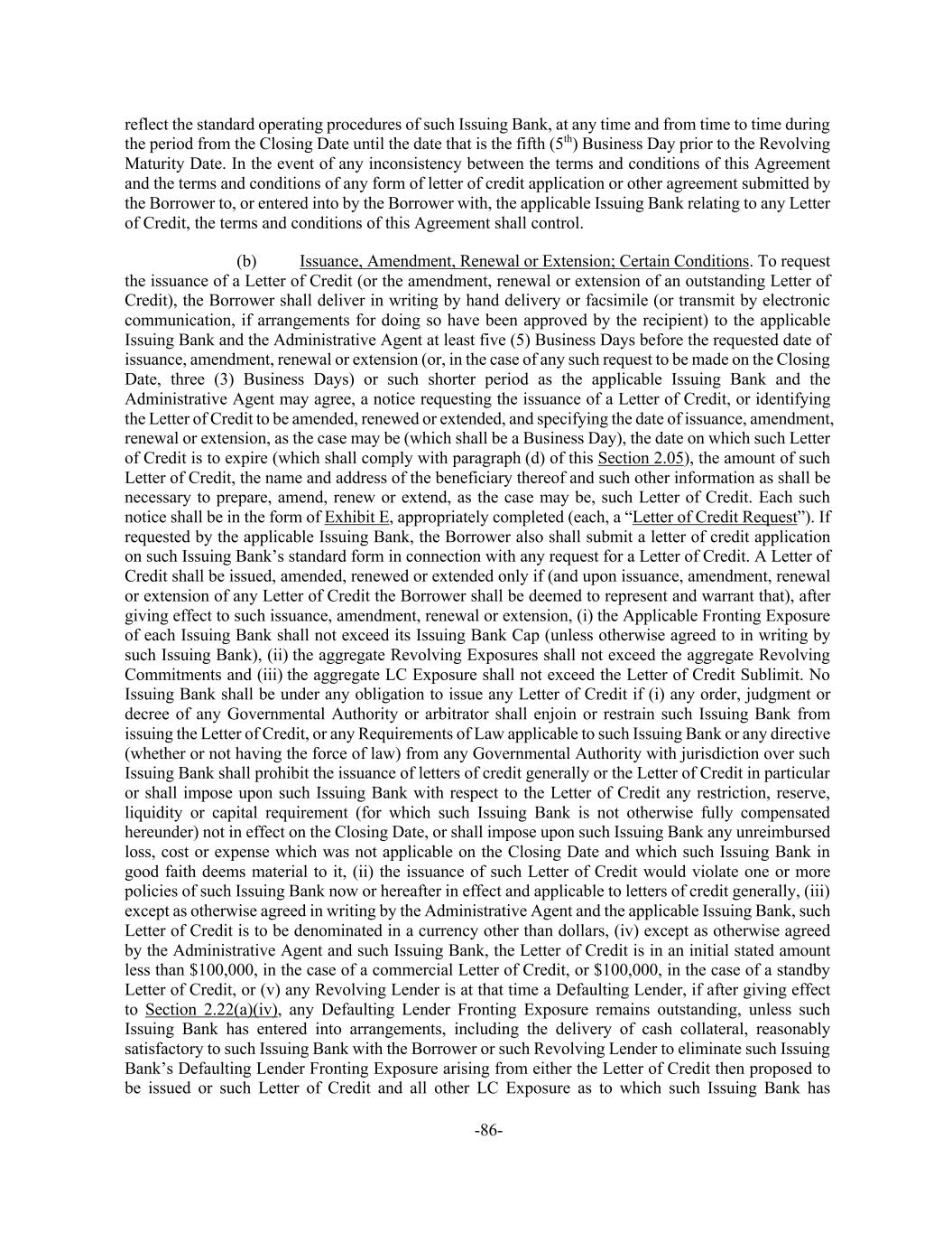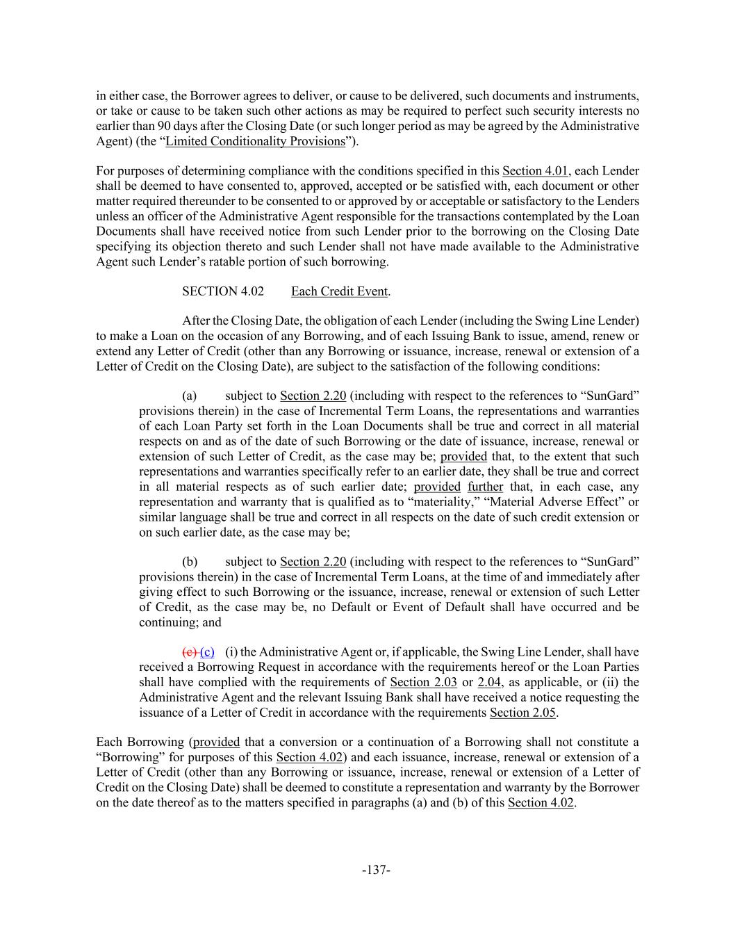 -137- in either case, the Borrower agrees to deliver, or cause to be delivered, such documents and instruments, or take or cause to be taken such other actions as may be required to perfect such security interests no earlier than 90 days after the Closing Date (or such longer period as may be agreed by the Administrative Agent) (the “Limited Conditionality Provisions”). For purposes of determining compliance with the conditions specified in this Section 4.01, each Lender shall be deemed to have consented to, approved, accepted or be satisfied with, each document or other matter required thereunder to be consented to or approved by or acceptable or satisfactory to the Lenders unless an officer of the Administrative Agent responsible for the transactions contemplated by the Loan Documents shall have received notice from such Lender prior to the borrowing on the Closing Date specifying its objection thereto and such Lender shall not have made available to the Administrative Agent such Lender’s ratable portion of such borrowing. SECTION 4.02 Each Credit Event. After the Closing Date, the obligation of each Lender (including the Swing Line Lender) to make a Loan on the occasion of any Borrowing, and of each Issuing Bank to issue, amend, renew or extend any Letter of Credit (other than any Borrowing or issuance, increase, renewal or extension of a Letter of Credit on the Closing Date), are subject to the satisfaction of the following conditions: (a) subject to Section 2.20 (including with respect to the references to “SunGard” provisions therein) in the case of Incremental Term Loans, the representations and warranties of each Loan Party set forth in the Loan Documents shall be true and correct in all material respects on and as of the date of such Borrowing or the date of issuance, increase, renewal or extension of such Letter of Credit, as the case may be; provided that, to the extent that such representations and warranties specifically refer to an earlier date, they shall be true and correct in all material respects as of such earlier date; provided further that, in each case, any representation and warranty that is qualified as to “materiality,” “Material Adverse Effect” or similar language shall be true and correct in all respects on the date of such credit extension or on such earlier date, as the case may be; (b) subject to Section 2.20 (including with respect to the references to “SunGard” provisions therein) in the case of Incremental Term Loans, at the time of and immediately after giving effect to such Borrowing or the issuance, increase, renewal or extension of such Letter of Credit, as the case may be, no Default or Event of Default shall have occurred and be continuing; and (c) (c) (i) the Administrative Agent or, if applicable, the Swing Line Lender, shall have received a Borrowing Request in accordance with the requirements hereof or the Loan Parties shall have complied with the requirements of Section 2.03 or 2.04, as applicable, or (ii) the Administrative Agent and the relevant Issuing Bank shall have received a notice requesting the issuance of a Letter of Credit in accordance with the requirements Section 2.05. Each Borrowing (provided that a conversion or a continuation of a Borrowing shall not constitute a “Borrowing” for purposes of this Section 4.02) and each issuance, increase, renewal or extension of a Letter of Credit (other than any Borrowing or issuance, increase, renewal or extension of a Letter of Credit on the Closing Date) shall be deemed to constitute a representation and warranty by the Borrower on the date thereof as to the matters specified in paragraphs (a) and (b) of this Section 4.02.