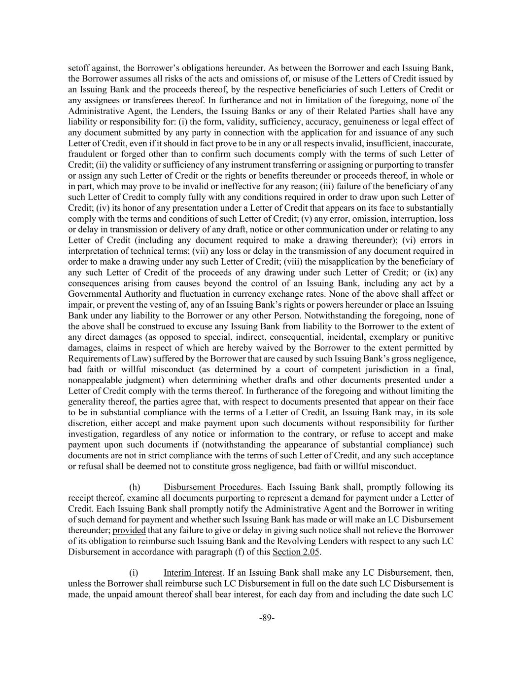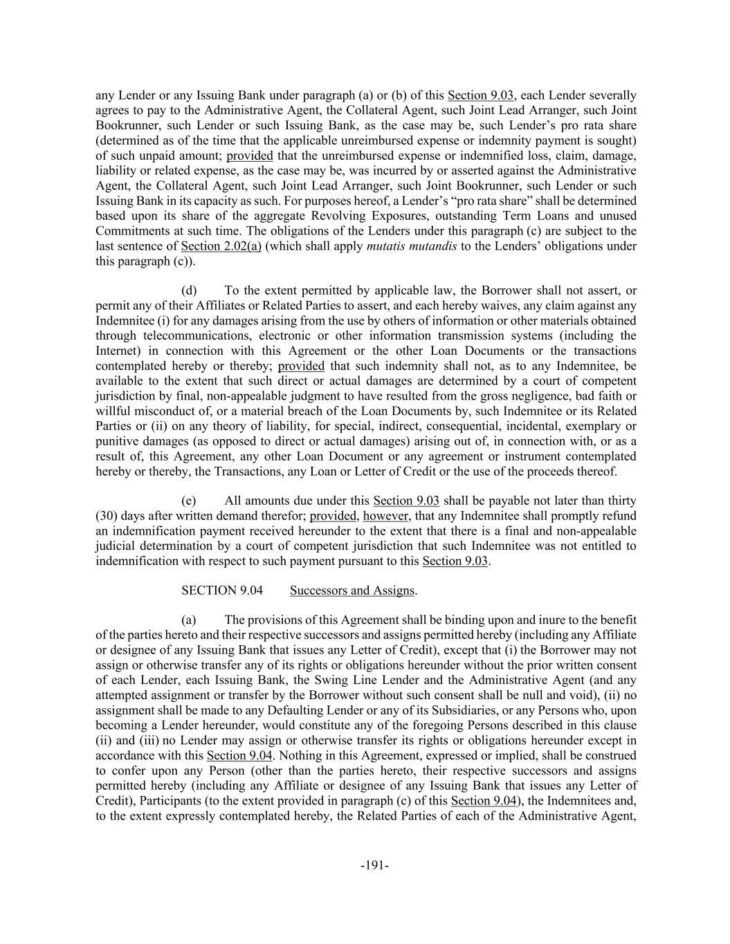 -191- any Lender or any Issuing Bank under paragraph (a) or (b) of this Section 9.03, each Lender severally agrees to pay to the Administrative Agent, the Collateral Agent, such Joint Lead Arranger, such Joint Bookrunner, such Lender or such Issuing Bank, as the case may be, such Lender’s pro rata share (determined as of the time that the applicable unreimbursed expense or indemnity payment is sought) of such unpaid amount; provided that the unreimbursed expense or indemnified loss, claim, damage, liability or related expense, as the case may be, was incurred by or asserted against the Administrative Agent, the Collateral Agent, such Joint Lead Arranger, such Joint Bookrunner, such Lender or such Issuing Bank in its capacity as such. For purposes hereof, a Lender’s “pro rata share” shall be determined based upon its share of the aggregate Revolving Exposures, outstanding Term Loans and unused Commitments at such time. The obligations of the Lenders under this paragraph (c) are subject to the last sentence of Section 2.02(a) (which shall apply mutatis mutandis to the Lenders’ obligations under this paragraph (c)). (d) To the extent permitted by applicable law, the Borrower shall not assert, or permit any of their Affiliates or Related Parties to assert, and each hereby waives, any claim against any Indemnitee (i) for any damages arising from the use by others of information or other materials obtained through telecommunications, electronic or other information transmission systems (including the Internet) in connection with this Agreement or the other Loan Documents or the transactions contemplated hereby or thereby; provided that such indemnity shall not, as to any Indemnitee, be available to the extent that such direct or actual damages are determined by a court of competent jurisdiction by final, non-appealable judgment to have resulted from the gross negligence, bad faith or willful misconduct of, or a material breach of the Loan Documents by, such Indemnitee or its Related Parties or (ii) on any theory of liability, for special, indirect, consequential, incidental, exemplary or punitive damages (as opposed to direct or actual damages) arising out of, in connection with, or as a result of, this Agreement, any other Loan Document or any agreement or instrument contemplated hereby or thereby, the Transactions, any Loan or Letter of Credit or the use of the proceeds thereof. (e) All amounts due under this Section 9.03 shall be payable not later than thirty (30) days after written demand therefor; provided, however, that any Indemnitee shall promptly refund an indemnification payment received hereunder to the extent that there is a final and non-appealable judicial determination by a court of competent jurisdiction that such Indemnitee was not entitled to indemnification with respect to such payment pursuant to this Section 9.03. SECTION 9.04 Successors and Assigns. (a) The provisions of this Agreement shall be binding upon and inure to the benefit of the parties hereto and their respective successors and assigns permitted hereby (including any Affiliate or designee of any Issuing Bank that issues any Letter of Credit), except that (i) the Borrower may not assign or otherwise transfer any of its rights or obligations hereunder without the prior written consent of each Lender, each Issuing Bank, the Swing Line Lender and the Administrative Agent (and any attempted assignment or transfer by the Borrower without such consent shall be null and void), (ii) no assignment shall be made to any Defaulting Lender or any of its Subsidiaries, or any Persons who, upon becoming a Lender hereunder, would constitute any of the foregoing Persons described in this clause (ii) and (iii) no Lender may assign or otherwise transfer its rights or obligations hereunder except in accordance with this Section 9.04. Nothing in this Agreement, expressed or implied, shall be construed to confer upon any Person (other than the parties hereto, their respective successors and assigns permitted hereby (including any Affiliate or designee of any Issuing Bank that issues any Letter of Credit), Participants (to the extent provided in paragraph (c) of this Section 9.04), the Indemnitees and, to the extent expressly contemplated hereby, the Related Parties of each of the Administrative Agent,