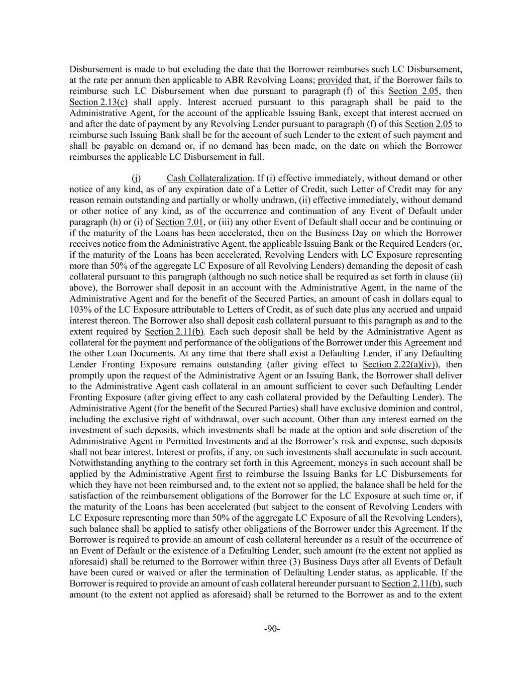 -124- the account of that Defaulting Lender (whether voluntary or mandatory, at maturity, pursuant to Article VII or otherwise, and including any amounts made available to the Administrative Agent by that Defaulting Lender pursuant to Section 9.08), shall be applied at such time or times as may be determined by the Administrative Agent as follows: first, to the payment of any amounts owing by that Defaulting Lender to the Administrative Agent and the Collateral Agent hereunder; second, in the case of a Revolving Lender, to the payment on a pro rata basis of any amounts owing by that Defaulting Lender to the Swing Line Lender and each Issuing Bank; third, as the Borrower may request (so long as no Default or Event of Default exists), to the funding of any Loan in respect of which that Defaulting Lender has failed to fund its portion thereof as required by this Agreement, as determined by the Administrative Agent; fourth, in the case of a Revolving Lender, if so determined by the Administrative Agent and the Borrower, to be held in a non-interest bearing deposit account and released in order to satisfy obligations of that Defaulting Lender to fund Loans under this Agreement; fifth, to the payment of any amounts owing to the Lenders, the Swing Line Lender or the Issuing Banks as a result of any judgment of a court of competent jurisdiction obtained by any Lender, such Issuing Bank against that Defaulting Lender as a result of that Defaulting Lender’s breach of its obligations under this Agreement; sixth, so long as no Default or Event of Default exists, to the payment of any amounts owing to any Loan Party as a result of any judgment of a court of competent jurisdiction obtained by any Loan Party against that Defaulting Lender as a result of that Defaulting Lender’s breach of its obligations under this Agreement; and seventh, to that Defaulting Lender or as otherwise directed by a court of competent jurisdiction; provided that if such payment is a payment of the principal amount of any Loans or LC Disbursements and such Lender is a Defaulting Lender under clause (a) of the definition thereof, such payment shall be applied solely to pay the relevant Loans of, and LC Disbursements owed to, the relevant non-Defaulting Lenders on a pro rata basis prior to being applied pursuant to Section 2.05(j) or this Section 2.22(a)(ii). Any payments, prepayments or other amounts paid or payable to a Defaulting Lender that are applied (or held) to pay amounts owed by a Defaulting Lender or to post cash collateral pursuant to Section 2.05(j) shall be deemed paid to and redirected by that Defaulting Lender, and each Lender irrevocably consents hereto. (iii) Certain Fees. That Defaulting Lender (x) shall not be entitled to receive or accrue any commitment fee pursuant to Section 2.12(a) for any period during which that Lender is a Defaulting Lender (and the Borrower shall not be required to pay any such fee that otherwise would have been required to have been paid to that Defaulting Lender) and (y) shall be limited in its right to receive Letter of Credit fees as provided in Section 2.12(b). (iv) Reallocation of Applicable Percentages to Reduce Fronting Exposure. During any period in which there is a Defaulting Lender, for purposes of computing the amount of the obligation of each non-Defaulting Lender to acquire, refinance or fund participations in Swing Loans pursuant to Section 2.04, Letters of Credit pursuant to Section 2.05 and the payments of participation fees pursuant to Section 2.12(b), the “Applicable Percentage” of each non- Defaulting Lender shall be computed without giving effect to the Revolving Commitment of that Defaulting Lender; provided that the aggregate obligation of each non-Defaulting Lender to acquire, refinance or fund participations in Letters of Credit and Swing Loans shall not exceed the positive difference, if any, of (1) the Revolving Commitment of that non-Defaulting Lender minus (2) the aggregate principal amount of the Revolving Loans and participations in Swing Loans and Letters of Credit of that non-Defaulting Lender. (v) Cash Collateral. If the reallocation described in clause (iv) above cannot, or can only partially, be effected, the Borrower shall, without prejudice to any right or remedy available