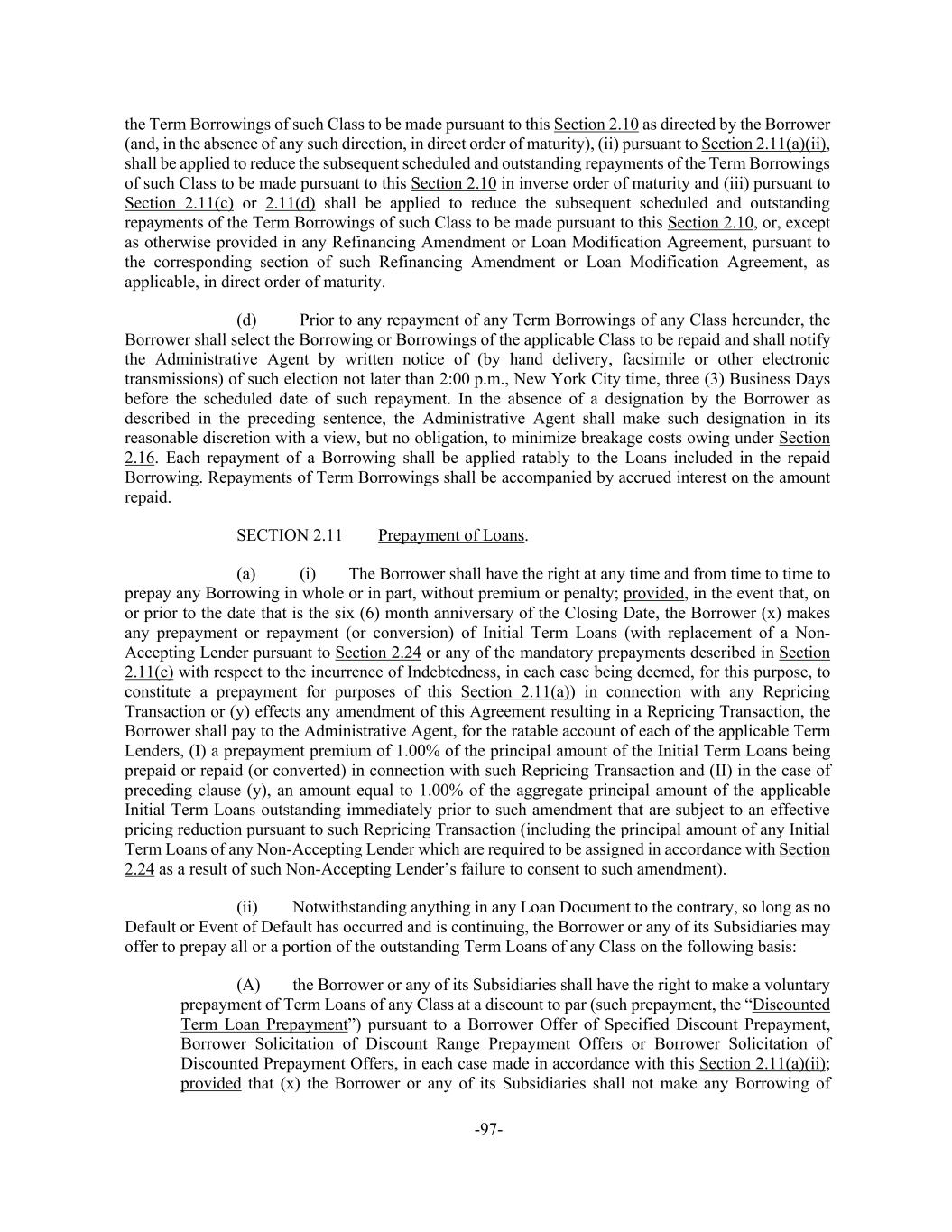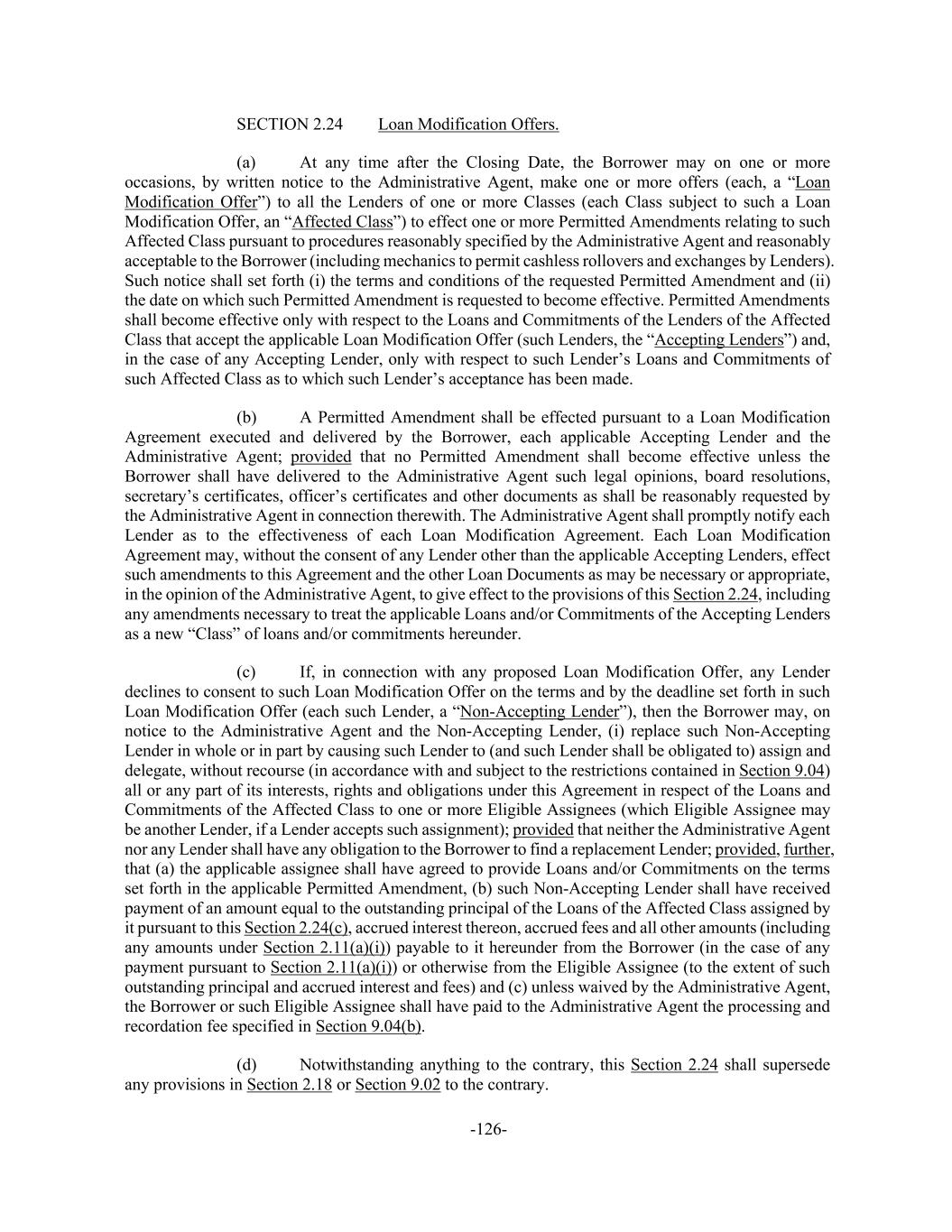 -126- SECTION 2.24 Loan Modification Offers. (a) At any time after the Closing Date, the Borrower may on one or more occasions, by written notice to the Administrative Agent, make one or more offers (each, a “Loan Modification Offer”) to all the Lenders of one or more Classes (each Class subject to such a Loan Modification Offer, an “Affected Class”) to effect one or more Permitted Amendments relating to such Affected Class pursuant to procedures reasonably specified by the Administrative Agent and reasonably acceptable to the Borrower (including mechanics to permit cashless rollovers and exchanges by Lenders). Such notice shall set forth (i) the terms and conditions of the requested Permitted Amendment and (ii) the date on which such Permitted Amendment is requested to become effective. Permitted Amendments shall become effective only with respect to the Loans and Commitments of the Lenders of the Affected Class that accept the applicable Loan Modification Offer (such Lenders, the “Accepting Lenders”) and, in the case of any Accepting Lender, only with respect to such Lender’s Loans and Commitments of such Affected Class as to which such Lender’s acceptance has been made. (b) A Permitted Amendment shall be effected pursuant to a Loan Modification Agreement executed and delivered by the Borrower, each applicable Accepting Lender and the Administrative Agent; provided that no Permitted Amendment shall become effective unless the Borrower shall have delivered to the Administrative Agent such legal opinions, board resolutions, secretary’s certificates, officer’s certificates and other documents as shall be reasonably requested by the Administrative Agent in connection therewith. The Administrative Agent shall promptly notify each Lender as to the effectiveness of each Loan Modification Agreement. Each Loan Modification Agreement may, without the consent of any Lender other than the applicable Accepting Lenders, effect such amendments to this Agreement and the other Loan Documents as may be necessary or appropriate, in the opinion of the Administrative Agent, to give effect to the provisions of this Section 2.24, including any amendments necessary to treat the applicable Loans and/or Commitments of the Accepting Lenders as a new “Class” of loans and/or commitments hereunder. (c) If, in connection with any proposed Loan Modification Offer, any Lender declines to consent to such Loan Modification Offer on the terms and by the deadline set forth in such Loan Modification Offer (each such Lender, a “Non-Accepting Lender”), then the Borrower may, on notice to the Administrative Agent and the Non-Accepting Lender, (i) replace such Non-Accepting Lender in whole or in part by causing such Lender to (and such Lender shall be obligated to) assign and delegate, without recourse (in accordance with and subject to the restrictions contained in Section 9.04) all or any part of its interests, rights and obligations under this Agreement in respect of the Loans and Commitments of the Affected Class to one or more Eligible Assignees (which Eligible Assignee may be another Lender, if a Lender accepts such assignment); provided that neither the Administrative Agent nor any Lender shall have any obligation to the Borrower to find a replacement Lender; provided, further, that (a) the applicable assignee shall have agreed to provide Loans and/or Commitments on the terms set forth in the applicable Permitted Amendment, (b) such Non-Accepting Lender shall have received payment of an amount equal to the outstanding principal of the Loans of the Affected Class assigned by it pursuant to this Section 2.24(c), accrued interest thereon, accrued fees and all other amounts (including any amounts under Section 2.11(a)(i)) payable to it hereunder from the Borrower (in the case of any payment pursuant to Section 2.11(a)(i)) or otherwise from the Eligible Assignee (to the extent of such outstanding principal and accrued interest and fees) and (c) unless waived by the Administrative Agent, the Borrower or such Eligible Assignee shall have paid to the Administrative Agent the processing and recordation fee specified in Section 9.04(b). (d) Notwithstanding anything to the contrary, this Section 2.24 shall supersede any provisions in Section 2.18 or Section 9.02 to the contrary.