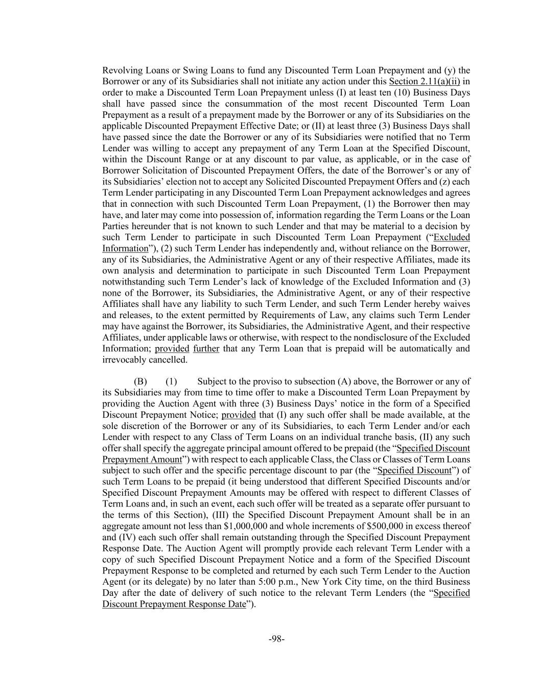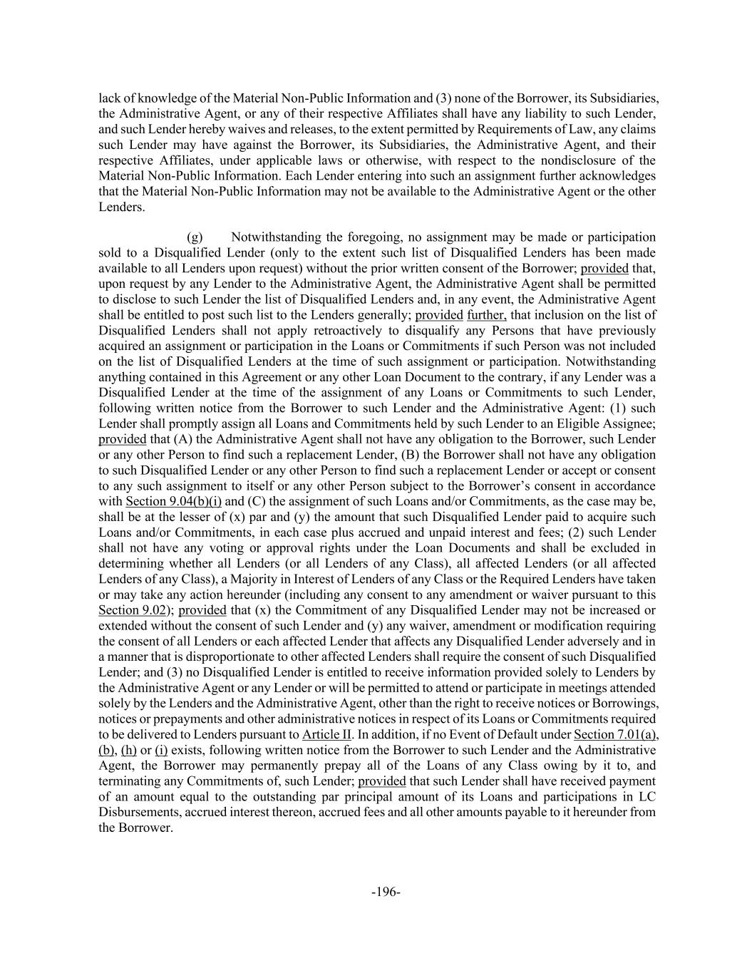 -196- lack of knowledge of the Material Non-Public Information and (3) none of the Borrower, its Subsidiaries, the Administrative Agent, or any of their respective Affiliates shall have any liability to such Lender, and such Lender hereby waives and releases, to the extent permitted by Requirements of Law, any claims such Lender may have against the Borrower, its Subsidiaries, the Administrative Agent, and their respective Affiliates, under applicable laws or otherwise, with respect to the nondisclosure of the Material Non-Public Information. Each Lender entering into such an assignment further acknowledges that the Material Non-Public Information may not be available to the Administrative Agent or the other Lenders. (g) Notwithstanding the foregoing, no assignment may be made or participation sold to a Disqualified Lender (only to the extent such list of Disqualified Lenders has been made available to all Lenders upon request) without the prior written consent of the Borrower; provided that, upon request by any Lender to the Administrative Agent, the Administrative Agent shall be permitted to disclose to such Lender the list of Disqualified Lenders and, in any event, the Administrative Agent shall be entitled to post such list to the Lenders generally; provided further, that inclusion on the list of Disqualified Lenders shall not apply retroactively to disqualify any Persons that have previously acquired an assignment or participation in the Loans or Commitments if such Person was not included on the list of Disqualified Lenders at the time of such assignment or participation. Notwithstanding anything contained in this Agreement or any other Loan Document to the contrary, if any Lender was a Disqualified Lender at the time of the assignment of any Loans or Commitments to such Lender, following written notice from the Borrower to such Lender and the Administrative Agent: (1) such Lender shall promptly assign all Loans and Commitments held by such Lender to an Eligible Assignee; provided that (A) the Administrative Agent shall not have any obligation to the Borrower, such Lender or any other Person to find such a replacement Lender, (B) the Borrower shall not have any obligation to such Disqualified Lender or any other Person to find such a replacement Lender or accept or consent to any such assignment to itself or any other Person subject to the Borrower’s consent in accordance with Section 9.04(b)(i) and (C) the assignment of such Loans and/or Commitments, as the case may be, shall be at the lesser of (x) par and (y) the amount that such Disqualified Lender paid to acquire such Loans and/or Commitments, in each case plus accrued and unpaid interest and fees; (2) such Lender shall not have any voting or approval rights under the Loan Documents and shall be excluded in determining whether all Lenders (or all Lenders of any Class), all affected Lenders (or all affected Lenders of any Class), a Majority in Interest of Lenders of any Class or the Required Lenders have taken or may take any action hereunder (including any consent to any amendment or waiver pursuant to this Section 9.02); provided that (x) the Commitment of any Disqualified Lender may not be increased or extended without the consent of such Lender and (y) any waiver, amendment or modification requiring the consent of all Lenders or each affected Lender that affects any Disqualified Lender adversely and in a manner that is disproportionate to other affected Lenders shall require the consent of such Disqualified Lender; and (3) no Disqualified Lender is entitled to receive information provided solely to Lenders by the Administrative Agent or any Lender or will be permitted to attend or participate in meetings attended solely by the Lenders and the Administrative Agent, other than the right to receive notices or Borrowings, notices or prepayments and other administrative notices in respect of its Loans or Commitments required to be delivered to Lenders pursuant to Article II. In addition, if no Event of Default under Section 7.01(a), (b), (h) or (i) exists, following written notice from the Borrower to such Lender and the Administrative Agent, the Borrower may permanently prepay all of the Loans of any Class owing by it to, and terminating any Commitments of, such Lender; provided that such Lender shall have received payment of an amount equal to the outstanding par principal amount of its Loans and participations in LC Disbursements, accrued interest thereon, accrued fees and all other amounts payable to it hereunder from the Borrower.