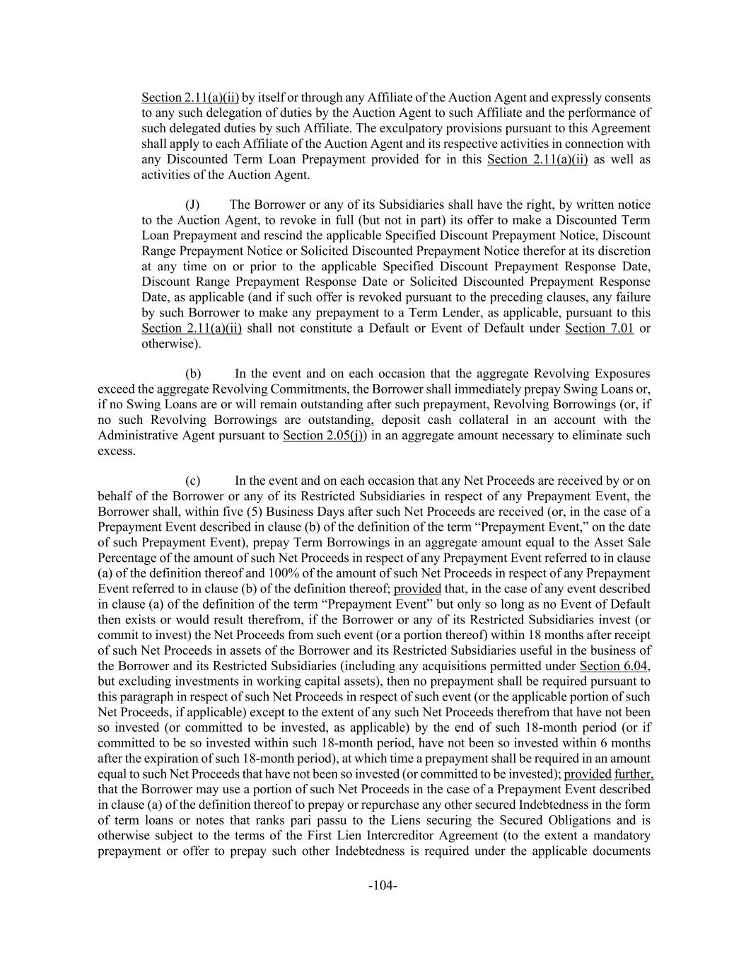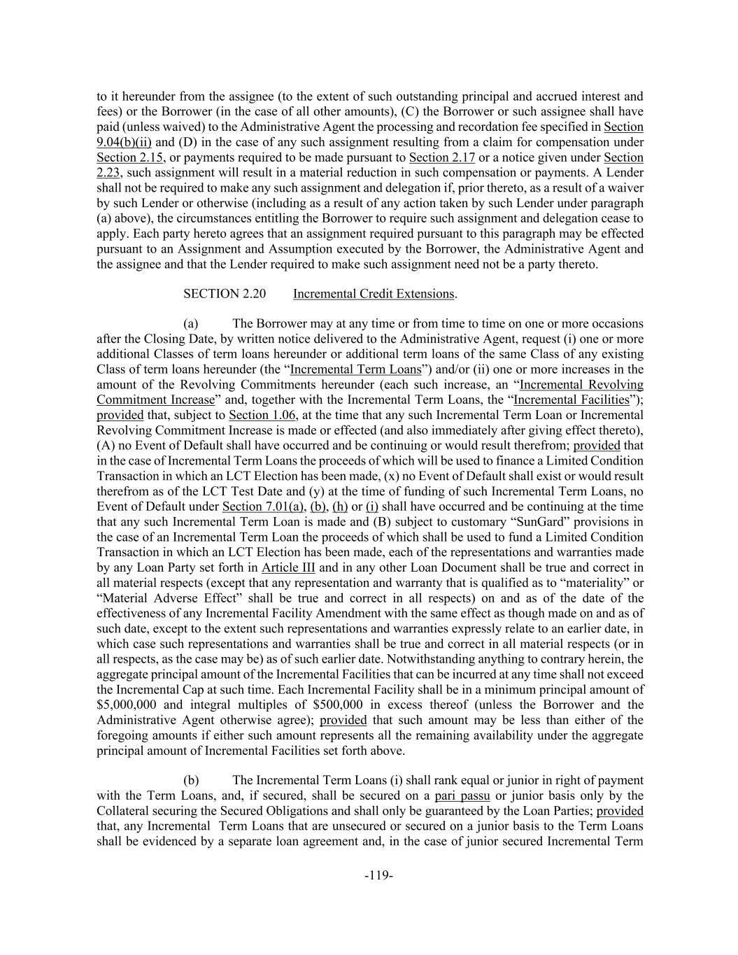 -119- to it hereunder from the assignee (to the extent of such outstanding principal and accrued interest and fees) or the Borrower (in the case of all other amounts), (C) the Borrower or such assignee shall have paid (unless waived) to the Administrative Agent the processing and recordation fee specified in Section 9.04(b)(ii) and (D) in the case of any such assignment resulting from a claim for compensation under Section 2.15, or payments required to be made pursuant to Section 2.17 or a notice given under Section 2.23, such assignment will result in a material reduction in such compensation or payments. A Lender shall not be required to make any such assignment and delegation if, prior thereto, as a result of a waiver by such Lender or otherwise (including as a result of any action taken by such Lender under paragraph (a) above), the circumstances entitling the Borrower to require such assignment and delegation cease to apply. Each party hereto agrees that an assignment required pursuant to this paragraph may be effected pursuant to an Assignment and Assumption executed by the Borrower, the Administrative Agent and the assignee and that the Lender required to make such assignment need not be a party thereto. SECTION 2.20 Incremental Credit Extensions. (a) The Borrower may at any time or from time to time on one or more occasions after the Closing Date, by written notice delivered to the Administrative Agent, request (i) one or more additional Classes of term loans hereunder or additional term loans of the same Class of any existing Class of term loans hereunder (the “Incremental Term Loans”) and/or (ii) one or more increases in the amount of the Revolving Commitments hereunder (each such increase, an “Incremental Revolving Commitment Increase” and, together with the Incremental Term Loans, the “Incremental Facilities”); provided that, subject to Section 1.06, at the time that any such Incremental Term Loan or Incremental Revolving Commitment Increase is made or effected (and also immediately after giving effect thereto), (A) no Event of Default shall have occurred and be continuing or would result therefrom; provided that in the case of Incremental Term Loans the proceeds of which will be used to finance a Limited Condition Transaction in which an LCT Election has been made, (x) no Event of Default shall exist or would result therefrom as of the LCT Test Date and (y) at the time of funding of such Incremental Term Loans, no Event of Default under Section 7.01(a), (b), (h) or (i) shall have occurred and be continuing at the time that any such Incremental Term Loan is made and (B) subject to customary “SunGard” provisions in the case of an Incremental Term Loan the proceeds of which shall be used to fund a Limited Condition Transaction in which an LCT Election has been made, each of the representations and warranties made by any Loan Party set forth in Article III and in any other Loan Document shall be true and correct in all material respects (except that any representation and warranty that is qualified as to “materiality” or “Material Adverse Effect” shall be true and correct in all respects) on and as of the date of the effectiveness of any Incremental Facility Amendment with the same effect as though made on and as of such date, except to the extent such representations and warranties expressly relate to an earlier date, in which case such representations and warranties shall be true and correct in all material respects (or in all respects, as the case may be) as of such earlier date. Notwithstanding anything to contrary herein, the aggregate principal amount of the Incremental Facilities that can be incurred at any time shall not exceed the Incremental Cap at such time. Each Incremental Facility shall be in a minimum principal amount of $5,000,000 and integral multiples of $500,000 in excess thereof (unless the Borrower and the Administrative Agent otherwise agree); provided that such amount may be less than either of the foregoing amounts if either such amount represents all the remaining availability under the aggregate principal amount of Incremental Facilities set forth above. (b) The Incremental Term Loans (i) shall rank equal or junior in right of payment with the Term Loans, and, if secured, shall be secured on a pari passu or junior basis only by the Collateral securing the Secured Obligations and shall only be guaranteed by the Loan Parties; provided that, any Incremental Term Loans that are unsecured or secured on a junior basis to the Term Loans shall be evidenced by a separate loan agreement and, in the case of junior secured Incremental Term