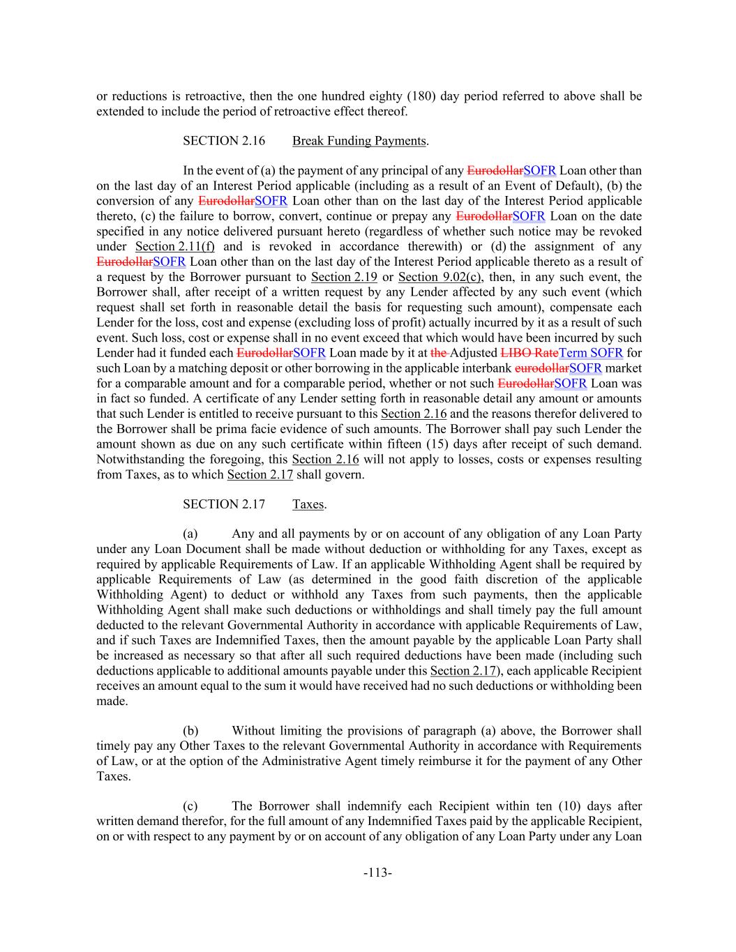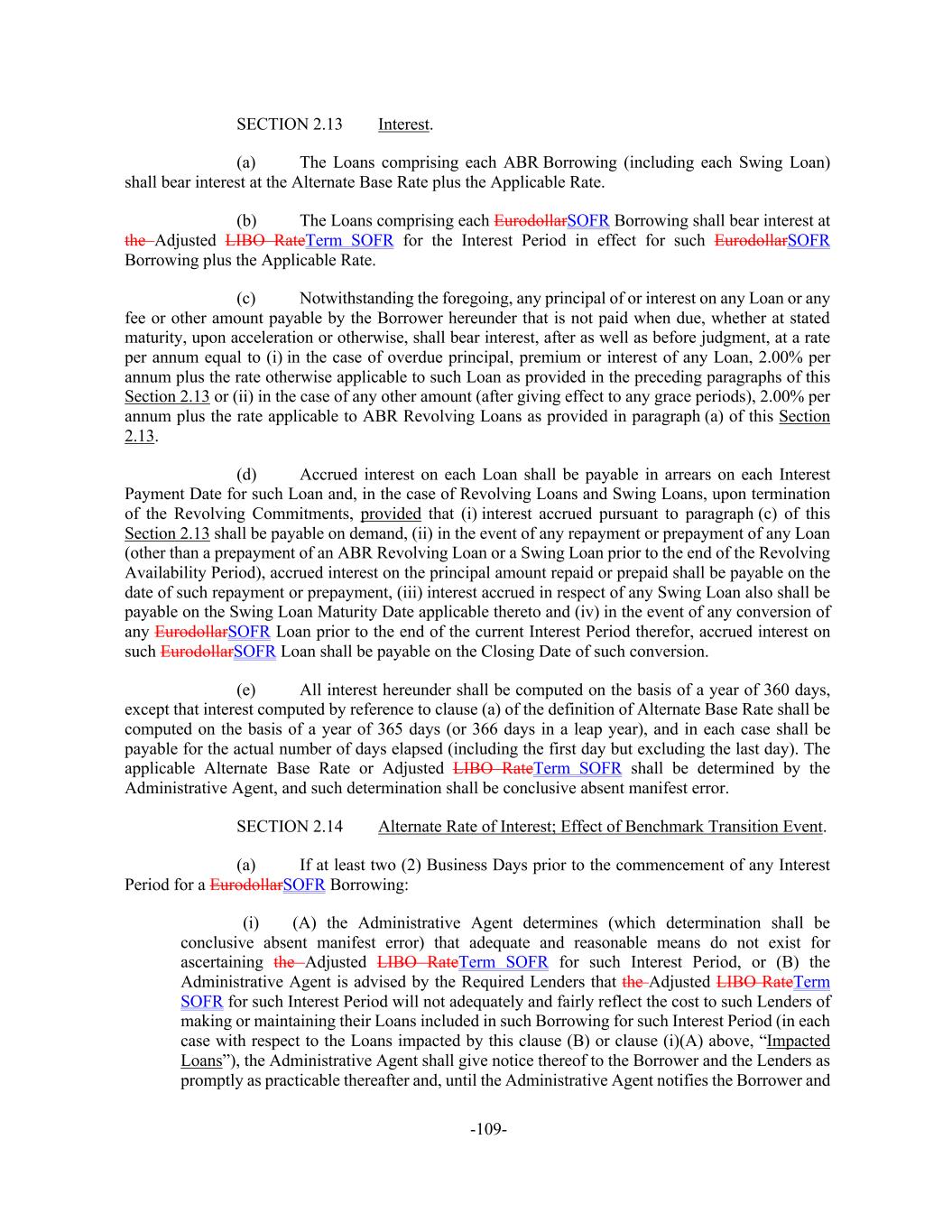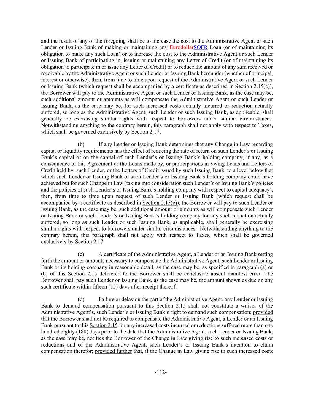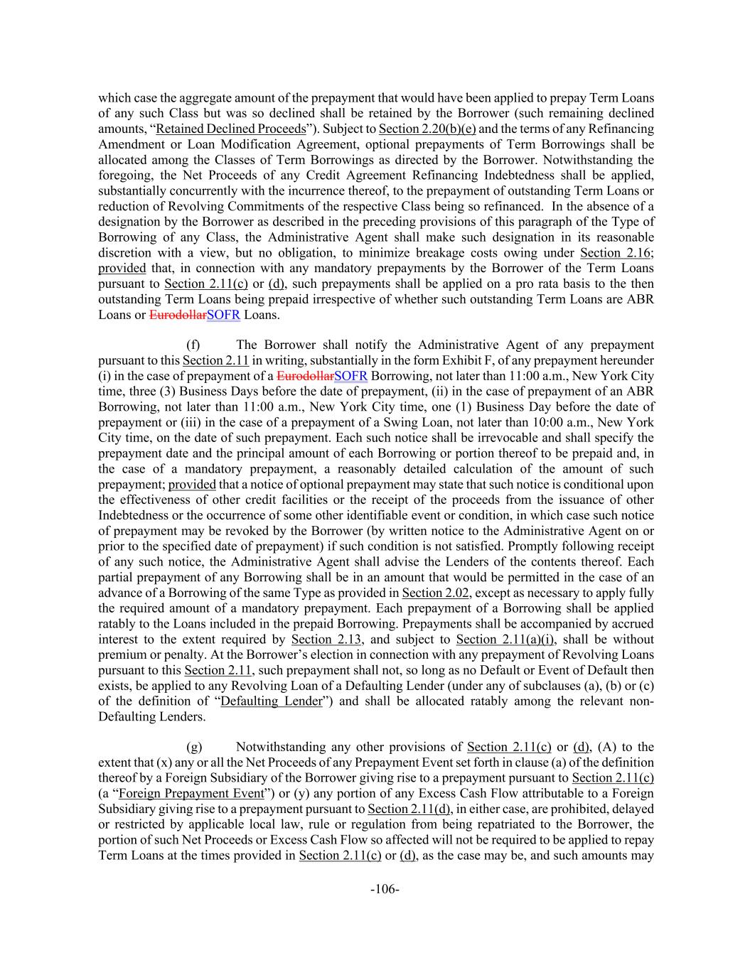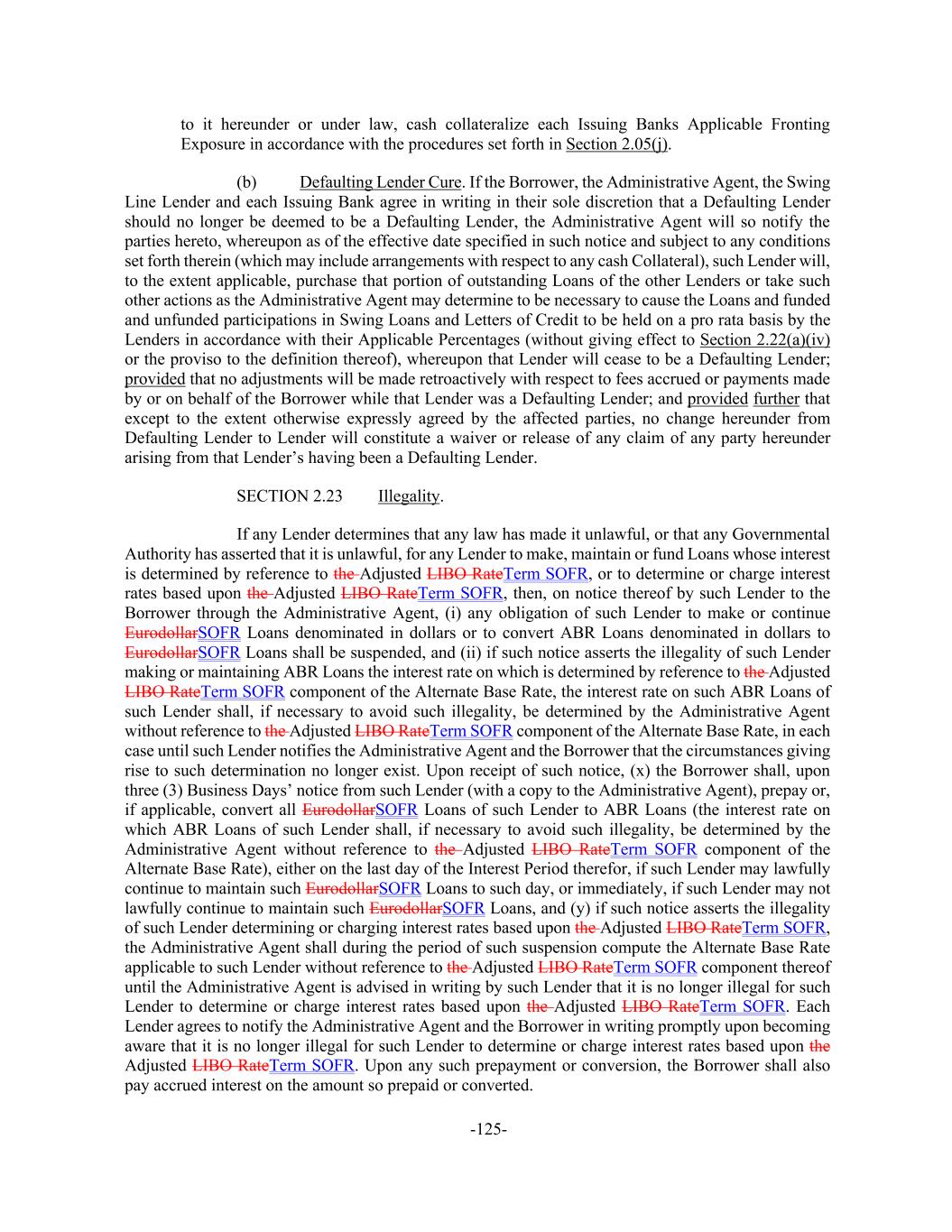 -125- to it hereunder or under law, cash collateralize each Issuing Banks Applicable Fronting Exposure in accordance with the procedures set forth in Section 2.05(j). (b) Defaulting Lender Cure. If the Borrower, the Administrative Agent, the Swing Line Lender and each Issuing Bank agree in writing in their sole discretion that a Defaulting Lender should no longer be deemed to be a Defaulting Lender, the Administrative Agent will so notify the parties hereto, whereupon as of the effective date specified in such notice and subject to any conditions set forth therein (which may include arrangements with respect to any cash Collateral), such Lender will, to the extent applicable, purchase that portion of outstanding Loans of the other Lenders or take such other actions as the Administrative Agent may determine to be necessary to cause the Loans and funded and unfunded participations in Swing Loans and Letters of Credit to be held on a pro rata basis by the Lenders in accordance with their Applicable Percentages (without giving effect to Section 2.22(a)(iv) or the proviso to the definition thereof), whereupon that Lender will cease to be a Defaulting Lender; provided that no adjustments will be made retroactively with respect to fees accrued or payments made by or on behalf of the Borrower while that Lender was a Defaulting Lender; and provided further that except to the extent otherwise expressly agreed by the affected parties, no change hereunder from Defaulting Lender to Lender will constitute a waiver or release of any claim of any party hereunder arising from that Lender’s having been a Defaulting Lender. SECTION 2.23 Illegality. If any Lender determines that any law has made it unlawful, or that any Governmental Authority has asserted that it is unlawful, for any Lender to make, maintain or fund Loans whose interest is determined by reference to the Adjusted LIBO RateTerm SOFR, or to determine or charge interest rates based upon the Adjusted LIBO RateTerm SOFR, then, on notice thereof by such Lender to the Borrower through the Administrative Agent, (i) any obligation of such Lender to make or continue EurodollarSOFR Loans denominated in dollars or to convert ABR Loans denominated in dollars to EurodollarSOFR Loans shall be suspended, and (ii) if such notice asserts the illegality of such Lender making or maintaining ABR Loans the interest rate on which is determined by reference to the Adjusted LIBO RateTerm SOFR component of the Alternate Base Rate, the interest rate on such ABR Loans of such Lender shall, if necessary to avoid such illegality, be determined by the Administrative Agent without reference to the Adjusted LIBO RateTerm SOFR component of the Alternate Base Rate, in each case until such Lender notifies the Administrative Agent and the Borrower that the circumstances giving rise to such determination no longer exist. Upon receipt of such notice, (x) the Borrower shall, upon three (3) Business Days’ notice from such Lender (with a copy to the Administrative Agent), prepay or, if applicable, convert all EurodollarSOFR Loans of such Lender to ABR Loans (the interest rate on which ABR Loans of such Lender shall, if necessary to avoid such illegality, be determined by the Administrative Agent without reference to the Adjusted LIBO RateTerm SOFR component of the Alternate Base Rate), either on the last day of the Interest Period therefor, if such Lender may lawfully continue to maintain such EurodollarSOFR Loans to such day, or immediately, if such Lender may not lawfully continue to maintain such EurodollarSOFR Loans, and (y) if such notice asserts the illegality of such Lender determining or charging interest rates based upon the Adjusted LIBO RateTerm SOFR, the Administrative Agent shall during the period of such suspension compute the Alternate Base Rate applicable to such Lender without reference to the Adjusted LIBO RateTerm SOFR component thereof until the Administrative Agent is advised in writing by such Lender that it is no longer illegal for such Lender to determine or charge interest rates based upon the Adjusted LIBO RateTerm SOFR. Each Lender agrees to notify the Administrative Agent and the Borrower in writing promptly upon becoming aware that it is no longer illegal for such Lender to determine or charge interest rates based upon the Adjusted LIBO RateTerm SOFR. Upon any such prepayment or conversion, the Borrower shall also pay accrued interest on the amount so prepaid or converted.