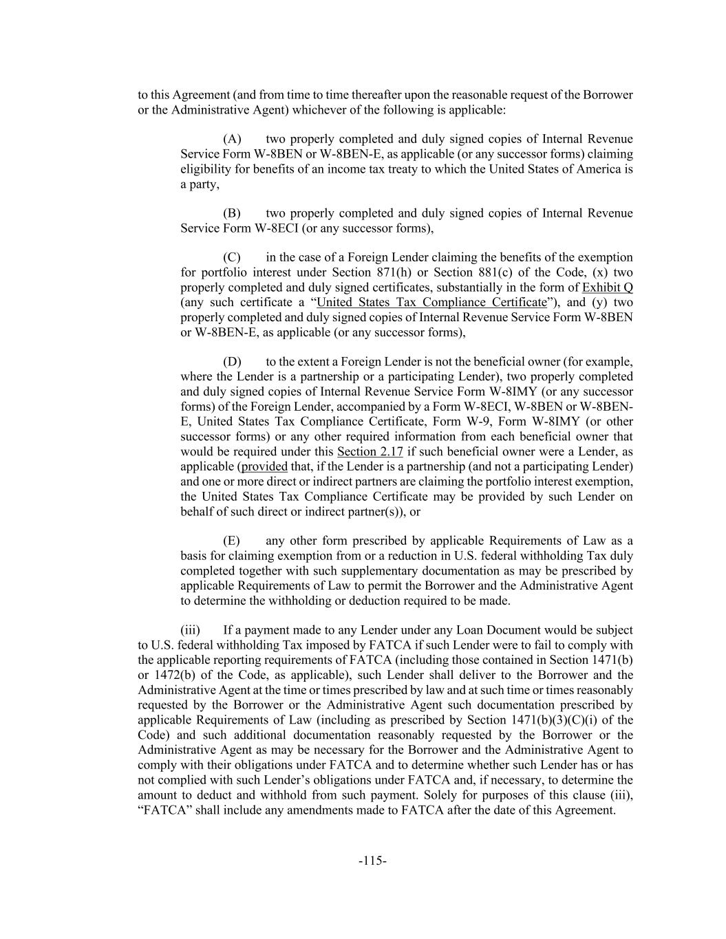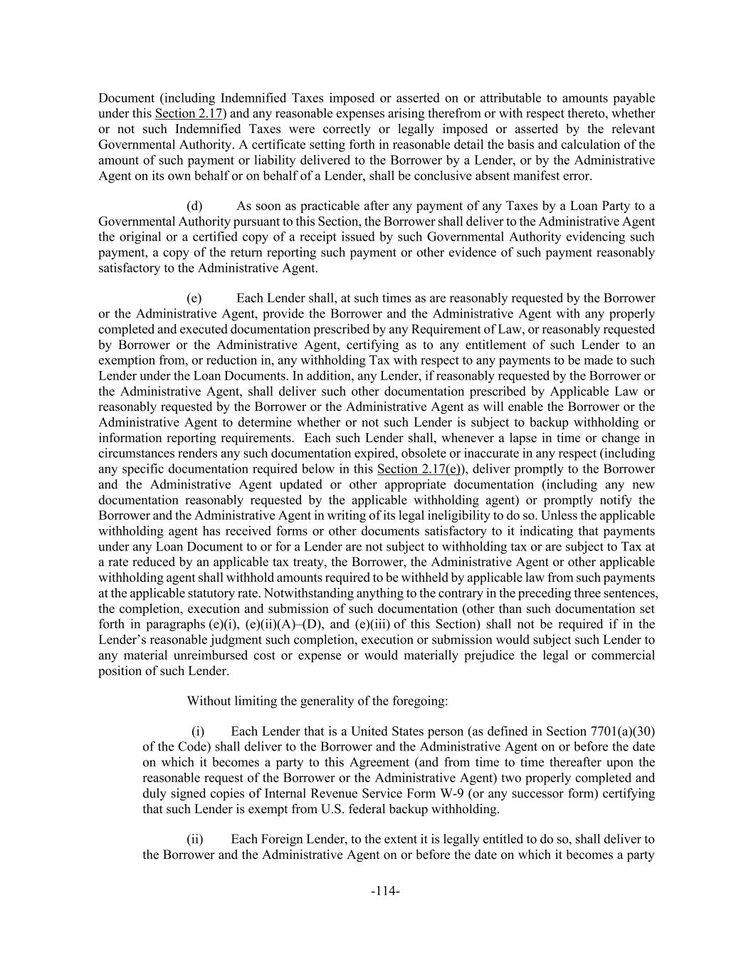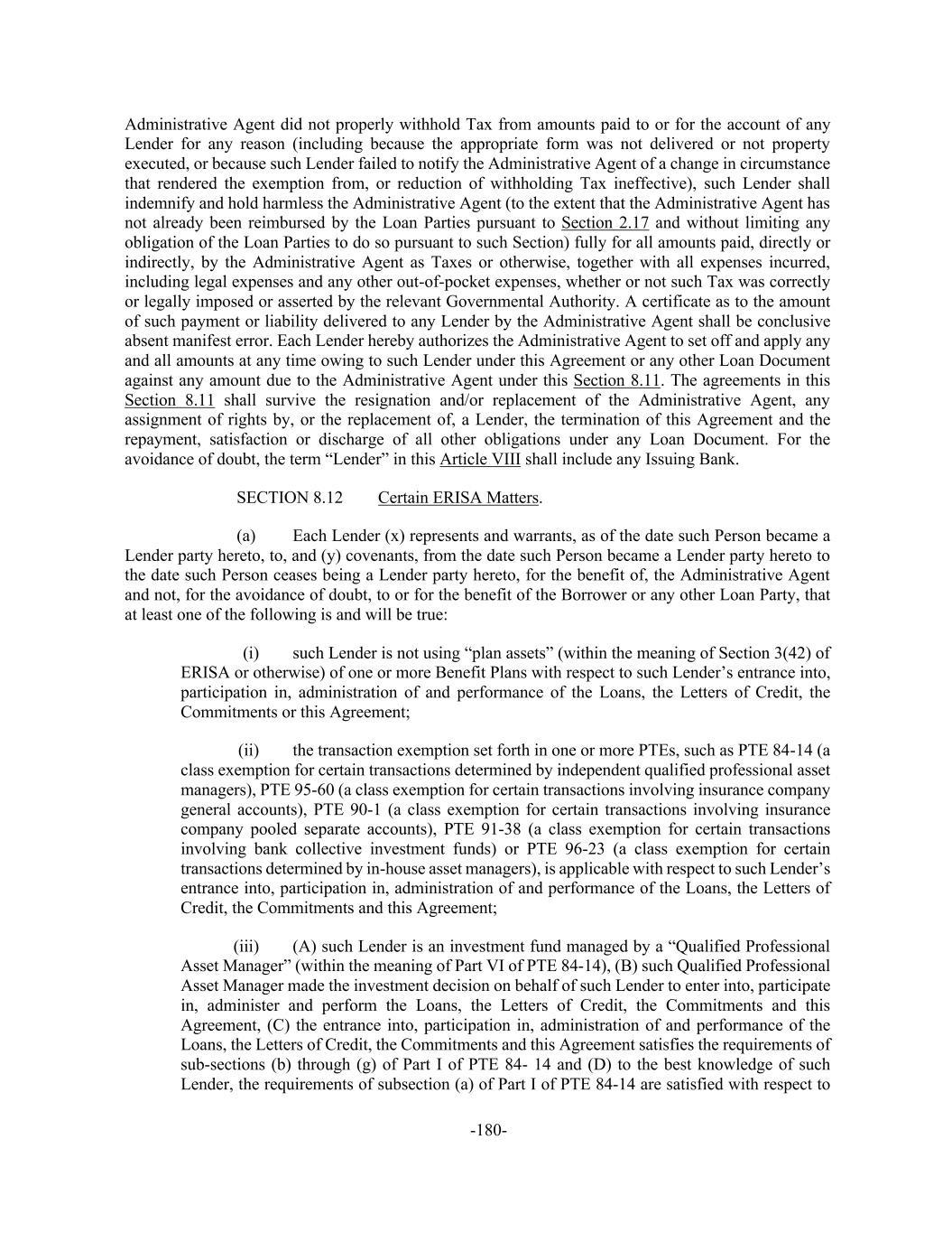 -180- Administrative Agent did not properly withhold Tax from amounts paid to or for the account of any Lender for any reason (including because the appropriate form was not delivered or not property executed, or because such Lender failed to notify the Administrative Agent of a change in circumstance that rendered the exemption from, or reduction of withholding Tax ineffective), such Lender shall indemnify and hold harmless the Administrative Agent (to the extent that the Administrative Agent has not already been reimbursed by the Loan Parties pursuant to Section 2.17 and without limiting any obligation of the Loan Parties to do so pursuant to such Section) fully for all amounts paid, directly or indirectly, by the Administrative Agent as Taxes or otherwise, together with all expenses incurred, including legal expenses and any other out-of-pocket expenses, whether or not such Tax was correctly or legally imposed or asserted by the relevant Governmental Authority. A certificate as to the amount of such payment or liability delivered to any Lender by the Administrative Agent shall be conclusive absent manifest error. Each Lender hereby authorizes the Administrative Agent to set off and apply any and all amounts at any time owing to such Lender under this Agreement or any other Loan Document against any amount due to the Administrative Agent under this Section 8.11. The agreements in this Section 8.11 shall survive the resignation and/or replacement of the Administrative Agent, any assignment of rights by, or the replacement of, a Lender, the termination of this Agreement and the repayment, satisfaction or discharge of all other obligations under any Loan Document. For the avoidance of doubt, the term “Lender” in this Article VIII shall include any Issuing Bank. SECTION 8.12 Certain ERISA Matters. (a) Each Lender (x) represents and warrants, as of the date such Person became a Lender party hereto, to, and (y) covenants, from the date such Person became a Lender party hereto to the date such Person ceases being a Lender party hereto, for the benefit of, the Administrative Agent and not, for the avoidance of doubt, to or for the benefit of the Borrower or any other Loan Party, that at least one of the following is and will be true: (i) such Lender is not using “plan assets” (within the meaning of Section 3(42) of ERISA or otherwise) of one or more Benefit Plans with respect to such Lender’s entrance into, participation in, administration of and performance of the Loans, the Letters of Credit, the Commitments or this Agreement; (ii) the transaction exemption set forth in one or more PTEs, such as PTE 84-14 (a class exemption for certain transactions determined by independent qualified professional asset managers), PTE 95-60 (a class exemption for certain transactions involving insurance company general accounts), PTE 90-1 (a class exemption for certain transactions involving insurance company pooled separate accounts), PTE 91-38 (a class exemption for certain transactions involving bank collective investment funds) or PTE 96-23 (a class exemption for certain transactions determined by in-house asset managers), is applicable with respect to such Lender’s entrance into, participation in, administration of and performance of the Loans, the Letters of Credit, the Commitments and this Agreement; (iii) (A) such Lender is an investment fund managed by a “Qualified Professional Asset Manager” (within the meaning of Part VI of PTE 84-14), (B) such Qualified Professional Asset Manager made the investment decision on behalf of such Lender to enter into, participate in, administer and perform the Loans, the Letters of Credit, the Commitments and this Agreement, (C) the entrance into, participation in, administration of and performance of the Loans, the Letters of Credit, the Commitments and this Agreement satisfies the requirements of sub-sections (b) through (g) of Part I of PTE 84- 14 and (D) to the best knowledge of such Lender, the requirements of subsection (a) of Part I of PTE 84-14 are satisfied with respect to