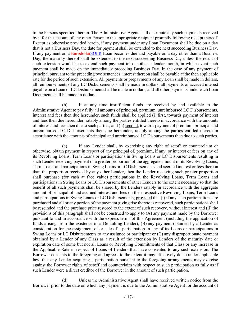 -117- to the Persons specified therein. The Administrative Agent shall distribute any such payments received by it for the account of any other Person to the appropriate recipient promptly following receipt thereof. Except as otherwise provided herein, if any payment under any Loan Document shall be due on a day that is not a Business Day, the date for payment shall be extended to the next succeeding Business Day. If any payment on a EurodollarSOFR Loan becomes due and payable on a day other than a Business Day, the maturity thereof shall be extended to the next succeeding Business Day unless the result of such extension would be to extend such payment into another calendar month, in which event such payment shall be made on the immediately preceding Business Day. In the case of any payment of principal pursuant to the preceding two sentences, interest thereon shall be payable at the then applicable rate for the period of such extension. All payments or prepayments of any Loan shall be made in dollars, all reimbursements of any LC Disbursements shall be made in dollars, all payments of accrued interest payable on a Loan or LC Disbursement shall be made in dollars, and all other payments under each Loan Document shall be made in dollars. (b) If at any time insufficient funds are received by and available to the Administrative Agent to pay fully all amounts of principal, premium, unreimbursed LC Disbursements, interest and fees then due hereunder, such funds shall be applied (i) first, towards payment of interest and fees then due hereunder, ratably among the parties entitled thereto in accordance with the amounts of interest and fees then due to such parties, and (ii) second, towards payment of premium, principal and unreimbursed LC Disbursements then due hereunder, ratably among the parties entitled thereto in accordance with the amounts of principal and unreimbursed LC Disbursements then due to such parties. (c) If any Lender shall, by exercising any right of setoff or counterclaim or otherwise, obtain payment in respect of any principal of, premium, if any, or interest or fees on any of its Revolving Loans, Term Loans or participations in Swing Loans or LC Disbursements resulting in such Lender receiving payment of a greater proportion of the aggregate amount of its Revolving Loans, Term Loans and participations in Swing Loans or LC Disbursements and accrued interest or fees thereon than the proportion received by any other Lender, then the Lender receiving such greater proportion shall purchase (for cash at face value) participations in the Revolving Loans, Term Loans and participations in Swing Loans or LC Disbursements of other Lenders to the extent necessary so that the benefit of all such payments shall be shared by the Lenders ratably in accordance with the aggregate amount of principal of and accrued interest and fees on their respective Revolving Loans, Term Loans and participations in Swing Loans or LC Disbursements; provided that (i) if any such participations are purchased and all or any portion of the payment giving rise thereto is recovered, such participations shall be rescinded and the purchase price restored to the extent of such recovery, without interest and (ii) the provisions of this paragraph shall not be construed to apply to (A) any payment made by the Borrower pursuant to and in accordance with the express terms of this Agreement (including the application of funds arising from the existence of a Defaulting Lender), (B) any payment obtained by a Lender as consideration for the assignment of or sale of a participation in any of its Loans or participations in Swing Loans or LC Disbursements to any assignee or participant or (C) any disproportionate payment obtained by a Lender of any Class as a result of the extension by Lenders of the maturity date or expiration date of some but not all Loans or Revolving Commitments of that Class or any increase in the Applicable Rate in respect of Loans of Lenders that have consented to any such extension. The Borrower consents to the foregoing and agrees, to the extent it may effectively do so under applicable law, that any Lender acquiring a participation pursuant to the foregoing arrangements may exercise against the Borrower rights of setoff and counterclaim with respect to such participation as fully as if such Lender were a direct creditor of the Borrower in the amount of such participation. (d) Unless the Administrative Agent shall have received written notice from the Borrower prior to the date on which any payment is due to the Administrative Agent for the account of