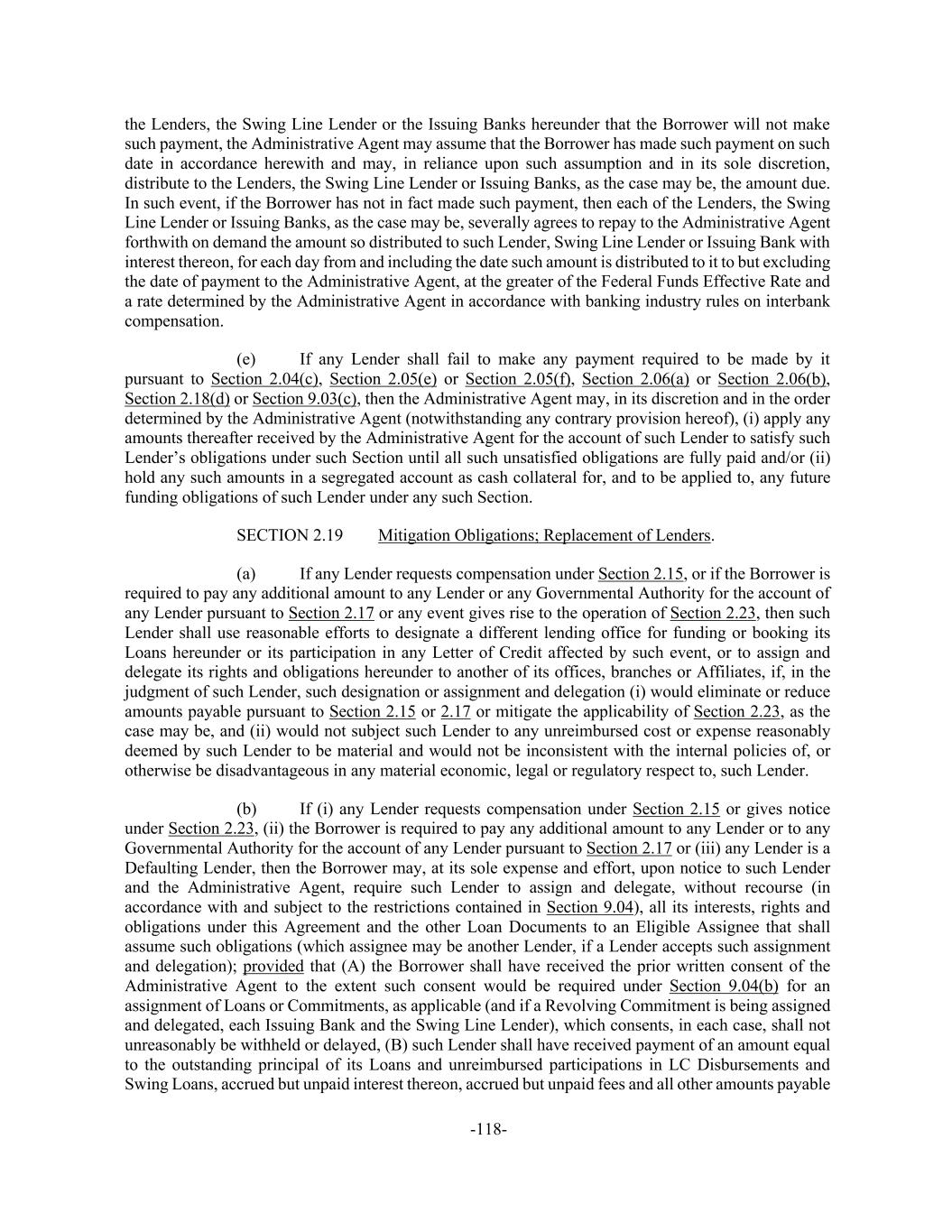 -118- the Lenders, the Swing Line Lender or the Issuing Banks hereunder that the Borrower will not make such payment, the Administrative Agent may assume that the Borrower has made such payment on such date in accordance herewith and may, in reliance upon such assumption and in its sole discretion, distribute to the Lenders, the Swing Line Lender or Issuing Banks, as the case may be, the amount due. In such event, if the Borrower has not in fact made such payment, then each of the Lenders, the Swing Line Lender or Issuing Banks, as the case may be, severally agrees to repay to the Administrative Agent forthwith on demand the amount so distributed to such Lender, Swing Line Lender or Issuing Bank with interest thereon, for each day from and including the date such amount is distributed to it to but excluding the date of payment to the Administrative Agent, at the greater of the Federal Funds Effective Rate and a rate determined by the Administrative Agent in accordance with banking industry rules on interbank compensation. (e) If any Lender shall fail to make any payment required to be made by it pursuant to Section 2.04(c), Section 2.05(e) or Section 2.05(f), Section 2.06(a) or Section 2.06(b), Section 2.18(d) or Section 9.03(c), then the Administrative Agent may, in its discretion and in the order determined by the Administrative Agent (notwithstanding any contrary provision hereof), (i) apply any amounts thereafter received by the Administrative Agent for the account of such Lender to satisfy such Lender’s obligations under such Section until all such unsatisfied obligations are fully paid and/or (ii) hold any such amounts in a segregated account as cash collateral for, and to be applied to, any future funding obligations of such Lender under any such Section. SECTION 2.19 Mitigation Obligations; Replacement of Lenders. (a) If any Lender requests compensation under Section 2.15, or if the Borrower is required to pay any additional amount to any Lender or any Governmental Authority for the account of any Lender pursuant to Section 2.17 or any event gives rise to the operation of Section 2.23, then such Lender shall use reasonable efforts to designate a different lending office for funding or booking its Loans hereunder or its participation in any Letter of Credit affected by such event, or to assign and delegate its rights and obligations hereunder to another of its offices, branches or Affiliates, if, in the judgment of such Lender, such designation or assignment and delegation (i) would eliminate or reduce amounts payable pursuant to Section 2.15 or 2.17 or mitigate the applicability of Section 2.23, as the case may be, and (ii) would not subject such Lender to any unreimbursed cost or expense reasonably deemed by such Lender to be material and would not be inconsistent with the internal policies of, or otherwise be disadvantageous in any material economic, legal or regulatory respect to, such Lender. (b) If (i) any Lender requests compensation under Section 2.15 or gives notice under Section 2.23, (ii) the Borrower is required to pay any additional amount to any Lender or to any Governmental Authority for the account of any Lender pursuant to Section 2.17 or (iii) any Lender is a Defaulting Lender, then the Borrower may, at its sole expense and effort, upon notice to such Lender and the Administrative Agent, require such Lender to assign and delegate, without recourse (in accordance with and subject to the restrictions contained in Section 9.04), all its interests, rights and obligations under this Agreement and the other Loan Documents to an Eligible Assignee that shall assume such obligations (which assignee may be another Lender, if a Lender accepts such assignment and delegation); provided that (A) the Borrower shall have received the prior written consent of the Administrative Agent to the extent such consent would be required under Section 9.04(b) for an assignment of Loans or Commitments, as applicable (and if a Revolving Commitment is being assigned and delegated, each Issuing Bank and the Swing Line Lender), which consents, in each case, shall not unreasonably be withheld or delayed, (B) such Lender shall have received payment of an amount equal to the outstanding principal of its Loans and unreimbursed participations in LC Disbursements and Swing Loans, accrued but unpaid interest thereon, accrued but unpaid fees and all other amounts payable