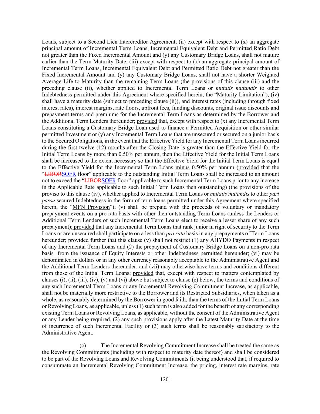 -120- Loans, subject to a Second Lien Intercreditor Agreement, (ii) except with respect to (x) an aggregate principal amount of Incremental Term Loans, Incremental Equivalent Debt and Permitted Ratio Debt not greater than the Fixed Incremental Amount and (y) any Customary Bridge Loans, shall not mature earlier than the Term Maturity Date, (iii) except with respect to (x) an aggregate principal amount of Incremental Term Loans, Incremental Equivalent Debt and Permitted Ratio Debt not greater than the Fixed Incremental Amount and (y) any Customary Bridge Loans, shall not have a shorter Weighted Average Life to Maturity than the remaining Term Loans (the provisions of this clause (iii) and the preceding clause (ii), whether applied to Incremental Term Loans or mutatis mutandis to other Indebtedness permitted under this Agreement where specified herein, the “Maturity Limitation”), (iv) shall have a maturity date (subject to preceding clause (ii)), and interest rates (including through fixed interest rates), interest margins, rate floors, upfront fees, funding discounts, original issue discounts and prepayment terms and premiums for the Incremental Term Loans as determined by the Borrower and the Additional Term Lenders thereunder; provided that, except with respect to (x) any Incremental Term Loans constituting a Customary Bridge Loan used to finance a Permitted Acquisition or other similar permitted Investment or (y) any Incremental Term Loans that are unsecured or secured on a junior basis to the Secured Obligations, in the event that the Effective Yield for any Incremental Term Loans incurred during the first twelve (12) months after the Closing Date is greater than the Effective Yield for the Initial Term Loans by more than 0.50% per annum, then the Effective Yield for the Initial Term Loans shall be increased to the extent necessary so that the Effective Yield for the Initial Term Loans is equal to the Effective Yield for the Incremental Term Loans minus 0.50% per annum (provided that the “LIBORSOFR floor” applicable to the outstanding Initial Term Loans shall be increased to an amount not to exceed the “LIBORSOFR floor” applicable to such Incremental Term Loans prior to any increase in the Applicable Rate applicable to such Initial Term Loans then outstanding) (the provisions of the proviso to this clause (iv), whether applied to Incremental Term Loans or mutatis mutandis to other pari passu secured Indebtedness in the form of term loans permitted under this Agreement where specified herein, the “MFN Provision”); (v) shall be prepaid with the proceeds of voluntary or mandatory prepayment events on a pro rata basis with other then outstanding Term Loans (unless the Lenders or Additional Term Lenders of such Incremental Term Loans elect to receive a lesser share of any such prepayment); provided that any Incremental Term Loans that rank junior in right of security to the Term Loans or are unsecured shall participate on a less than pro rata basis in any prepayments of Term Loans hereunder; provided further that this clause (v) shall not restrict (1) any AHYDO Payments in respect of any Incremental Term Loans and (2) the prepayment of Customary Bridge Loans on a non-pro rata basis from the issuance of Equity Interests or other Indebtedness permitted hereunder; (vi) may be denominated in dollars or in any other currency reasonably acceptable to the Administrative Agent and the Additional Term Lenders thereunder; and (vii) may otherwise have terms and conditions different from those of the Initial Term Loans; provided that, except with respect to matters contemplated by clauses (i), (ii), (iii), (iv), (v) and (vi) above but subject to clause (c) below, the terms and conditions of any such Incremental Term Loans or any Incremental Revolving Commitment Increase, as applicable, shall not be materially more restrictive to the Borrower and its Restricted Subsidiaries, when taken as a whole, as reasonably determined by the Borrower in good faith, than the terms of the Initial Term Loans or Revolving Loans, as applicable, unless (1) such term is also added for the benefit of any corresponding existing Term Loans or Revolving Loans, as applicable, without the consent of the Administrative Agent or any Lender being required, (2) any such provisions apply after the Latest Maturity Date at the time of incurrence of such Incremental Facility or (3) such terms shall be reasonably satisfactory to the Administrative Agent. (c) The Incremental Revolving Commitment Increase shall be treated the same as the Revolving Commitments (including with respect to maturity date thereof) and shall be considered to be part of the Revolving Loans and Revolving Commitments (it being understood that, if required to consummate an Incremental Revolving Commitment Increase, the pricing, interest rate margins, rate