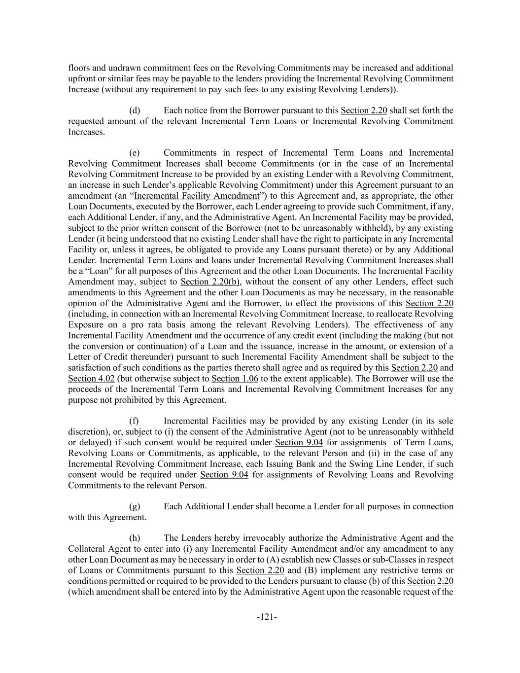 -121- floors and undrawn commitment fees on the Revolving Commitments may be increased and additional upfront or similar fees may be payable to the lenders providing the Incremental Revolving Commitment Increase (without any requirement to pay such fees to any existing Revolving Lenders)). (d) Each notice from the Borrower pursuant to this Section 2.20 shall set forth the requested amount of the relevant Incremental Term Loans or Incremental Revolving Commitment Increases. (e) Commitments in respect of Incremental Term Loans and Incremental Revolving Commitment Increases shall become Commitments (or in the case of an Incremental Revolving Commitment Increase to be provided by an existing Lender with a Revolving Commitment, an increase in such Lender’s applicable Revolving Commitment) under this Agreement pursuant to an amendment (an “Incremental Facility Amendment”) to this Agreement and, as appropriate, the other Loan Documents, executed by the Borrower, each Lender agreeing to provide such Commitment, if any, each Additional Lender, if any, and the Administrative Agent. An Incremental Facility may be provided, subject to the prior written consent of the Borrower (not to be unreasonably withheld), by any existing Lender (it being understood that no existing Lender shall have the right to participate in any Incremental Facility or, unless it agrees, be obligated to provide any Loans pursuant thereto) or by any Additional Lender. Incremental Term Loans and loans under Incremental Revolving Commitment Increases shall be a “Loan” for all purposes of this Agreement and the other Loan Documents. The Incremental Facility Amendment may, subject to Section 2.20(b), without the consent of any other Lenders, effect such amendments to this Agreement and the other Loan Documents as may be necessary, in the reasonable opinion of the Administrative Agent and the Borrower, to effect the provisions of this Section 2.20 (including, in connection with an Incremental Revolving Commitment Increase, to reallocate Revolving Exposure on a pro rata basis among the relevant Revolving Lenders). The effectiveness of any Incremental Facility Amendment and the occurrence of any credit event (including the making (but not the conversion or continuation) of a Loan and the issuance, increase in the amount, or extension of a Letter of Credit thereunder) pursuant to such Incremental Facility Amendment shall be subject to the satisfaction of such conditions as the parties thereto shall agree and as required by this Section 2.20 and Section 4.02 (but otherwise subject to Section 1.06 to the extent applicable). The Borrower will use the proceeds of the Incremental Term Loans and Incremental Revolving Commitment Increases for any purpose not prohibited by this Agreement. (f) Incremental Facilities may be provided by any existing Lender (in its sole discretion), or, subject to (i) the consent of the Administrative Agent (not to be unreasonably withheld or delayed) if such consent would be required under Section 9.04 for assignments of Term Loans, Revolving Loans or Commitments, as applicable, to the relevant Person and (ii) in the case of any Incremental Revolving Commitment Increase, each Issuing Bank and the Swing Line Lender, if such consent would be required under Section 9.04 for assignments of Revolving Loans and Revolving Commitments to the relevant Person. (g) Each Additional Lender shall become a Lender for all purposes in connection with this Agreement. (h) The Lenders hereby irrevocably authorize the Administrative Agent and the Collateral Agent to enter into (i) any Incremental Facility Amendment and/or any amendment to any other Loan Document as may be necessary in order to (A) establish new Classes or sub-Classes in respect of Loans or Commitments pursuant to this Section 2.20 and (B) implement any restrictive terms or conditions permitted or required to be provided to the Lenders pursuant to clause (b) of this Section 2.20 (which amendment shall be entered into by the Administrative Agent upon the reasonable request of the