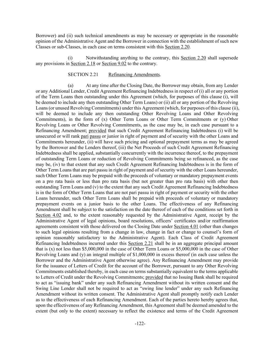 -122- Borrower) and (ii) such technical amendments as may be necessary or appropriate in the reasonable opinion of the Administrative Agent and the Borrower in connection with the establishment of such new Classes or sub-Classes, in each case on terms consistent with this Section 2.20. (i) Notwithstanding anything to the contrary, this Section 2.20 shall supersede any provisions in Section 2.18 or Section 9.02 to the contrary. SECTION 2.21 Refinancing Amendments. (a) At any time after the Closing Date, the Borrower may obtain, from any Lender or any Additional Lender, Credit Agreement Refinancing Indebtedness in respect of (i) all or any portion of the Term Loans then outstanding under this Agreement (which, for purposes of this clause (i), will be deemed to include any then outstanding Other Term Loans) or (ii) all or any portion of the Revolving Loans (or unused Revolving Commitments) under this Agreement (which, for purposes of this clause (ii), will be deemed to include any then outstanding Other Revolving Loans and Other Revolving Commitments), in the form of (x) Other Term Loans or Other Term Commitments or (y) Other Revolving Loans or Other Revolving Commitments, as the case may be, in each case pursuant to a Refinancing Amendment; provided that such Credit Agreement Refinancing Indebtedness (i) will be unsecured or will rank pari passu or junior in right of payment and of security with the other Loans and Commitments hereunder, (ii) will have such pricing and optional prepayment terms as may be agreed by the Borrower and the Lenders thereof, (iii) the Net Proceeds of such Credit Agreement Refinancing Indebtedness shall be applied, substantially concurrently with the incurrence thereof, to the prepayment of outstanding Term Loans or reduction of Revolving Commitments being so refinanced, as the case may be, (iv) to that extent that any such Credit Agreement Refinancing Indebtedness is in the form of Other Term Loans that are pari passu in right of payment and of security with the other Loans hereunder, such Other Term Loans may be prepaid with the proceeds of voluntary or mandatory prepayment events on a pro rata basis or less than pro rata basis (but not greater than pro rata basis) with other then outstanding Term Loans and (v) to the extent that any such Credit Agreement Refinancing Indebtedness is in the form of Other Term Loans that are not pari passu in right of payment or security with the other Loans hereunder, such Other Term Loans shall be prepaid with proceeds of voluntary or mandatory prepayment events on a junior basis to the other Loans. The effectiveness of any Refinancing Amendment shall be subject to the satisfaction on the date thereof of each of the conditions set forth in Section 4.02 and, to the extent reasonably requested by the Administrative Agent, receipt by the Administrative Agent of legal opinions, board resolutions, officers’ certificates and/or reaffirmation agreements consistent with those delivered on the Closing Date under Section 4.01 (other than changes to such legal opinions resulting from a change in law, change in fact or change to counsel’s form of opinion reasonably satisfactory to the Administrative Agent). Each Class of Credit Agreement Refinancing Indebtedness incurred under this Section 2.21 shall be in an aggregate principal amount that is (x) not less than $5,000,000 in the case of Other Term Loans or $5,000,000 in the case of Other Revolving Loans and (y) an integral multiple of $1,000,000 in excess thereof (in each case unless the Borrower and the Administrative Agent otherwise agree). Any Refinancing Amendment may provide for the issuance of Letters of Credit for the account of the Borrower, pursuant to any Other Revolving Commitments established thereby, in each case on terms substantially equivalent to the terms applicable to Letters of Credit under the Revolving Commitments; provided that no Issuing Bank shall be required to act as “issuing bank” under any such Refinancing Amendment without its written consent and the Swing Line Lender shall not be required to act as “swing line lender” under any such Refinancing Amendment without its written consent. The Administrative Agent shall promptly notify each Lender as to the effectiveness of each Refinancing Amendment. Each of the parties hereto hereby agrees that, upon the effectiveness of any Refinancing Amendment, this Agreement shall be deemed amended to the extent (but only to the extent) necessary to reflect the existence and terms of the Credit Agreement