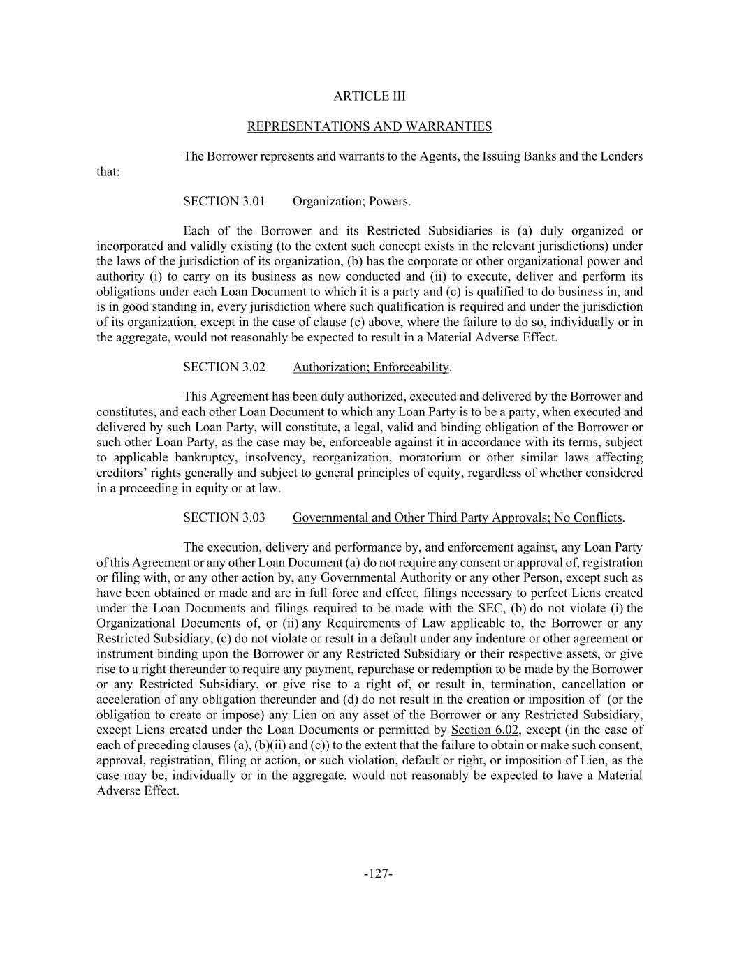 -127- ARTICLE III REPRESENTATIONS AND WARRANTIES The Borrower represents and warrants to the Agents, the Issuing Banks and the Lenders that: SECTION 3.01 Organization; Powers. Each of the Borrower and its Restricted Subsidiaries is (a) duly organized or incorporated and validly existing (to the extent such concept exists in the relevant jurisdictions) under the laws of the jurisdiction of its organization, (b) has the corporate or other organizational power and authority (i) to carry on its business as now conducted and (ii) to execute, deliver and perform its obligations under each Loan Document to which it is a party and (c) is qualified to do business in, and is in good standing in, every jurisdiction where such qualification is required and under the jurisdiction of its organization, except in the case of clause (c) above, where the failure to do so, individually or in the aggregate, would not reasonably be expected to result in a Material Adverse Effect. SECTION 3.02 Authorization; Enforceability. This Agreement has been duly authorized, executed and delivered by the Borrower and constitutes, and each other Loan Document to which any Loan Party is to be a party, when executed and delivered by such Loan Party, will constitute, a legal, valid and binding obligation of the Borrower or such other Loan Party, as the case may be, enforceable against it in accordance with its terms, subject to applicable bankruptcy, insolvency, reorganization, moratorium or other similar laws affecting creditors’ rights generally and subject to general principles of equity, regardless of whether considered in a proceeding in equity or at law. SECTION 3.03 Governmental and Other Third Party Approvals; No Conflicts. The execution, delivery and performance by, and enforcement against, any Loan Party of this Agreement or any other Loan Document (a) do not require any consent or approval of, registration or filing with, or any other action by, any Governmental Authority or any other Person, except such as have been obtained or made and are in full force and effect, filings necessary to perfect Liens created under the Loan Documents and filings required to be made with the SEC, (b) do not violate (i) the Organizational Documents of, or (ii) any Requirements of Law applicable to, the Borrower or any Restricted Subsidiary, (c) do not violate or result in a default under any indenture or other agreement or instrument binding upon the Borrower or any Restricted Subsidiary or their respective assets, or give rise to a right thereunder to require any payment, repurchase or redemption to be made by the Borrower or any Restricted Subsidiary, or give rise to a right of, or result in, termination, cancellation or acceleration of any obligation thereunder and (d) do not result in the creation or imposition of (or the obligation to create or impose) any Lien on any asset of the Borrower or any Restricted Subsidiary, except Liens created under the Loan Documents or permitted by Section 6.02, except (in the case of each of preceding clauses (a), (b)(ii) and (c)) to the extent that the failure to obtain or make such consent, approval, registration, filing or action, or such violation, default or right, or imposition of Lien, as the case may be, individually or in the aggregate, would not reasonably be expected to have a Material Adverse Effect.