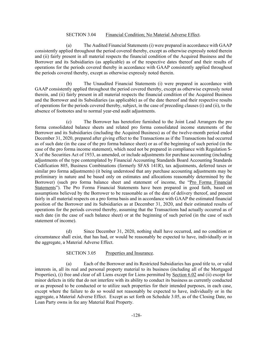 -128- SECTION 3.04 Financial Condition; No Material Adverse Effect. (a) The Audited Financial Statements (i) were prepared in accordance with GAAP consistently applied throughout the period covered thereby, except as otherwise expressly noted therein and (ii) fairly present in all material respects the financial condition of the Acquired Business and the Borrower and its Subsidiaries (as applicable) as of the respective dates thereof and their results of operations for the periods covered thereby in accordance with GAAP consistently applied throughout the periods covered thereby, except as otherwise expressly noted therein. (b) The Unaudited Financial Statements (i) were prepared in accordance with GAAP consistently applied throughout the period covered thereby, except as otherwise expressly noted therein, and (ii) fairly present in all material respects the financial condition of the Acquired Business and the Borrower and its Subsidiaries (as applicable) as of the date thereof and their respective results of operations for the periods covered thereby, subject, in the case of preceding clauses (i) and (ii), to the absence of footnotes and to normal year-end audit adjustments. (c) The Borrower has heretofore furnished to the Joint Lead Arrangers the pro forma consolidated balance sheets and related pro forma consolidated income statements of the Borrower and its Subsidiaries (including the Acquired Business) as of the twelve-month period ended December 31, 2020, prepared after giving effect to the Transactions as if the Transactions had occurred as of such date (in the case of the pro forma balance sheet) or as of the beginning of such period (in the case of the pro forma income statement), which need not be prepared in compliance with Regulation S- X of the Securities Act of 1933, as amended, or include adjustments for purchase accounting (including adjustments of the type contemplated by Financial Accounting Standards Board Accounting Standards Codification 805, Business Combinations (formerly SFAS 141R), tax adjustments, deferred taxes or similar pro forma adjustments) (it being understood that any purchase accounting adjustments may be preliminary in nature and be based only on estimates and allocations reasonably determined by the Borrower) (such pro forma balance sheet and statement of income, the “Pro Forma Financial Statements”). The Pro Forma Financial Statements have been prepared in good faith, based on assumptions believed by the Borrower to be reasonable as of the date of delivery thereof, and present fairly in all material respects on a pro forma basis and in accordance with GAAP the estimated financial position of the Borrower and its Subsidiaries as at December 31, 2020, and their estimated results of operations for the periods covered thereby, assuming that the Transactions had actually occurred as of such date (in the case of such balance sheet) or at the beginning of such period (in the case of such statement of income). (d) Since December 31, 2020, nothing shall have occurred, and no condition or circumstance shall exist, that has had, or would be reasonably be expected to have, individually or in the aggregate, a Material Adverse Effect. SECTION 3.05 Properties and Insurance. (a) Each of the Borrower and its Restricted Subsidiaries has good title to, or valid interests in, all its real and personal property material to its business (including all of the Mortgaged Properties), (i) free and clear of all Liens except for Liens permitted by Section 6.02 and (ii) except for minor defects in title that do not interfere with its ability to conduct its business as currently conducted or as proposed to be conducted or to utilize such properties for their intended purposes, in each case, except where the failure to do so would not reasonably be expected to have, individually or in the aggregate, a Material Adverse Effect. Except as set forth on Schedule 3.05, as of the Closing Date, no Loan Party owns in fee any Material Real Property.