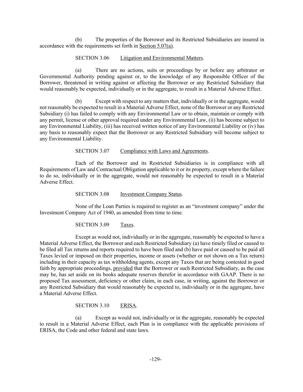 -129- (b) The properties of the Borrower and its Restricted Subsidiaries are insured in accordance with the requirements set forth in Section 5.07(a). SECTION 3.06 Litigation and Environmental Matters. (a) There are no actions, suits or proceedings by or before any arbitrator or Governmental Authority pending against or, to the knowledge of any Responsible Officer of the Borrower, threatened in writing against or affecting the Borrower or any Restricted Subsidiary that would reasonably be expected, individually or in the aggregate, to result in a Material Adverse Effect. (b) Except with respect to any matters that, individually or in the aggregate, would not reasonably be expected to result in a Material Adverse Effect, none of the Borrower or any Restricted Subsidiary (i) has failed to comply with any Environmental Law or to obtain, maintain or comply with any permit, license or other approval required under any Environmental Law, (ii) has become subject to any Environmental Liability, (iii) has received written notice of any Environmental Liability or (iv) has any basis to reasonably expect that the Borrower or any Restricted Subsidiary will become subject to any Environmental Liability. SECTION 3.07 Compliance with Laws and Agreements. Each of the Borrower and its Restricted Subsidiaries is in compliance with all Requirements of Law and Contractual Obligation applicable to it or its property, except where the failure to do so, individually or in the aggregate, would not reasonably be expected to result in a Material Adverse Effect. SECTION 3.08 Investment Company Status. None of the Loan Parties is required to register as an “investment company” under the Investment Company Act of 1940, as amended from time to time. SECTION 3.09 Taxes. Except as would not, individually or in the aggregate, reasonably be expected to have a Material Adverse Effect, the Borrower and each Restricted Subsidiary (a) have timely filed or caused to be filed all Tax returns and reports required to have been filed and (b) have paid or caused to be paid all Taxes levied or imposed on their properties, income or assets (whether or not shown on a Tax return) including in their capacity as tax withholding agents, except any Taxes that are being contested in good faith by appropriate proceedings, provided that the Borrower or such Restricted Subsidiary, as the case may be, has set aside on its books adequate reserves therefor in accordance with GAAP. There is no proposed Tax assessment, deficiency or other claim, in each case, in writing, against the Borrower or any Restricted Subsidiary that would reasonably be expected to, individually or in the aggregate, have a Material Adverse Effect. SECTION 3.10 ERISA. (a) Except as would not, individually or in the aggregate, reasonably be expected to result in a Material Adverse Effect, each Plan is in compliance with the applicable provisions of ERISA, the Code and other federal and state laws.