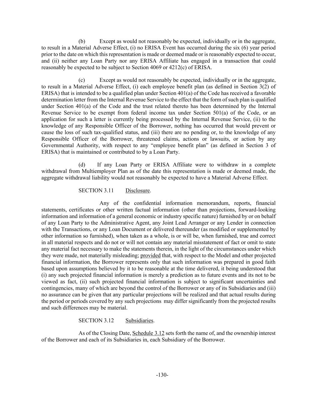 -130- (b) Except as would not reasonably be expected, individually or in the aggregate, to result in a Material Adverse Effect, (i) no ERISA Event has occurred during the six (6) year period prior to the date on which this representation is made or deemed made or is reasonably expected to occur, and (ii) neither any Loan Party nor any ERISA Affiliate has engaged in a transaction that could reasonably be expected to be subject to Section 4069 or 4212(c) of ERISA. (c) Except as would not reasonably be expected, individually or in the aggregate, to result in a Material Adverse Effect, (i) each employee benefit plan (as defined in Section 3(2) of ERISA) that is intended to be a qualified plan under Section 401(a) of the Code has received a favorable determination letter from the Internal Revenue Service to the effect that the form of such plan is qualified under Section 401(a) of the Code and the trust related thereto has been determined by the Internal Revenue Service to be exempt from federal income tax under Section 501(a) of the Code, or an application for such a letter is currently being processed by the Internal Revenue Service, (ii) to the knowledge of any Responsible Officer of the Borrower, nothing has occurred that would prevent or cause the loss of such tax-qualified status, and (iii) there are no pending or, to the knowledge of any Responsible Officer of the Borrower, threatened claims, actions or lawsuits, or action by any Governmental Authority, with respect to any “employee benefit plan” (as defined in Section 3 of ERISA) that is maintained or contributed to by a Loan Party. (d) If any Loan Party or ERISA Affiliate were to withdraw in a complete withdrawal from Multiemployer Plan as of the date this representation is made or deemed made, the aggregate withdrawal liability would not reasonably be expected to have a Material Adverse Effect. SECTION 3.11 Disclosure. Any of the confidential information memorandum, reports, financial statements, certificates or other written factual information (other than projections, forward-looking information and information of a general economic or industry specific nature) furnished by or on behalf of any Loan Party to the Administrative Agent, any Joint Lead Arranger or any Lender in connection with the Transactions, or any Loan Document or delivered thereunder (as modified or supplemented by other information so furnished), when taken as a whole, is or will be, when furnished, true and correct in all material respects and do not or will not contain any material misstatement of fact or omit to state any material fact necessary to make the statements therein, in the light of the circumstances under which they were made, not materially misleading; provided that, with respect to the Model and other projected financial information, the Borrower represents only that such information was prepared in good faith based upon assumptions believed by it to be reasonable at the time delivered, it being understood that (i) any such projected financial information is merely a prediction as to future events and its not to be viewed as fact, (ii) such projected financial information is subject to significant uncertainties and contingencies, many of which are beyond the control of the Borrower or any of its Subsidiaries and (iii) no assurance can be given that any particular projections will be realized and that actual results during the period or periods covered by any such projections may differ significantly from the projected results and such differences may be material. SECTION 3.12 Subsidiaries. As of the Closing Date, Schedule 3.12 sets forth the name of, and the ownership interest of the Borrower and each of its Subsidiaries in, each Subsidiary of the Borrower.