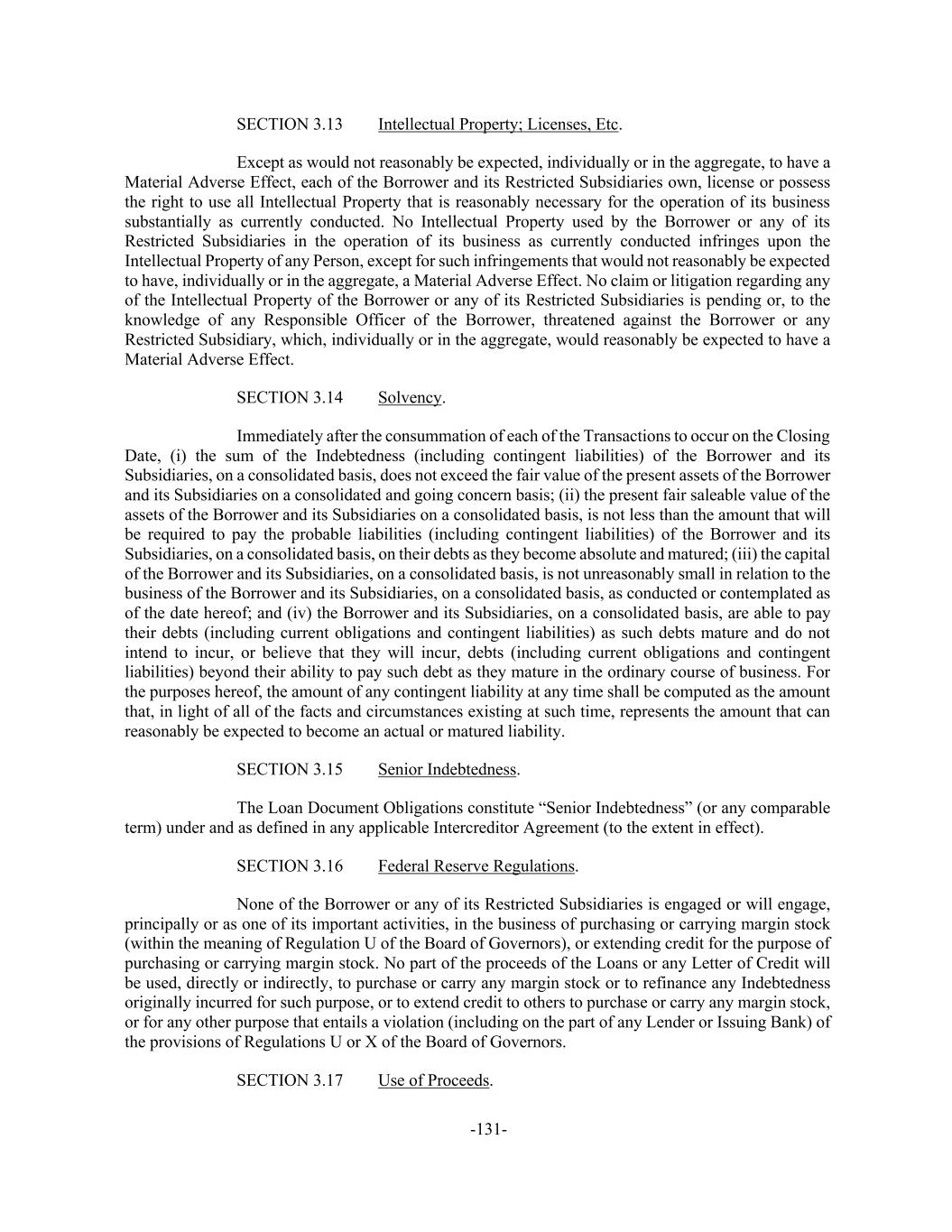 -131- SECTION 3.13 Intellectual Property; Licenses, Etc. Except as would not reasonably be expected, individually or in the aggregate, to have a Material Adverse Effect, each of the Borrower and its Restricted Subsidiaries own, license or possess the right to use all Intellectual Property that is reasonably necessary for the operation of its business substantially as currently conducted. No Intellectual Property used by the Borrower or any of its Restricted Subsidiaries in the operation of its business as currently conducted infringes upon the Intellectual Property of any Person, except for such infringements that would not reasonably be expected to have, individually or in the aggregate, a Material Adverse Effect. No claim or litigation regarding any of the Intellectual Property of the Borrower or any of its Restricted Subsidiaries is pending or, to the knowledge of any Responsible Officer of the Borrower, threatened against the Borrower or any Restricted Subsidiary, which, individually or in the aggregate, would reasonably be expected to have a Material Adverse Effect. SECTION 3.14 Solvency. Immediately after the consummation of each of the Transactions to occur on the Closing Date, (i) the sum of the Indebtedness (including contingent liabilities) of the Borrower and its Subsidiaries, on a consolidated basis, does not exceed the fair value of the present assets of the Borrower and its Subsidiaries on a consolidated and going concern basis; (ii) the present fair saleable value of the assets of the Borrower and its Subsidiaries on a consolidated basis, is not less than the amount that will be required to pay the probable liabilities (including contingent liabilities) of the Borrower and its Subsidiaries, on a consolidated basis, on their debts as they become absolute and matured; (iii) the capital of the Borrower and its Subsidiaries, on a consolidated basis, is not unreasonably small in relation to the business of the Borrower and its Subsidiaries, on a consolidated basis, as conducted or contemplated as of the date hereof; and (iv) the Borrower and its Subsidiaries, on a consolidated basis, are able to pay their debts (including current obligations and contingent liabilities) as such debts mature and do not intend to incur, or believe that they will incur, debts (including current obligations and contingent liabilities) beyond their ability to pay such debt as they mature in the ordinary course of business. For the purposes hereof, the amount of any contingent liability at any time shall be computed as the amount that, in light of all of the facts and circumstances existing at such time, represents the amount that can reasonably be expected to become an actual or matured liability. SECTION 3.15 Senior Indebtedness. The Loan Document Obligations constitute “Senior Indebtedness” (or any comparable term) under and as defined in any applicable Intercreditor Agreement (to the extent in effect). SECTION 3.16 Federal Reserve Regulations. None of the Borrower or any of its Restricted Subsidiaries is engaged or will engage, principally or as one of its important activities, in the business of purchasing or carrying margin stock (within the meaning of Regulation U of the Board of Governors), or extending credit for the purpose of purchasing or carrying margin stock. No part of the proceeds of the Loans or any Letter of Credit will be used, directly or indirectly, to purchase or carry any margin stock or to refinance any Indebtedness originally incurred for such purpose, or to extend credit to others to purchase or carry any margin stock, or for any other purpose that entails a violation (including on the part of any Lender or Issuing Bank) of the provisions of Regulations U or X of the Board of Governors. SECTION 3.17 Use of Proceeds.