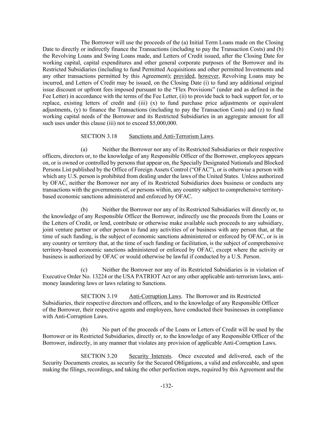-132- The Borrower will use the proceeds of the (a) Initial Term Loans made on the Closing Date to directly or indirectly finance the Transactions (including to pay the Transaction Costs) and (b) the Revolving Loans and Swing Loans made, and Letters of Credit issued, after the Closing Date for working capital, capital expenditures and other general corporate purposes of the Borrower and its Restricted Subsidiaries (including to fund Permitted Acquisitions and other permitted Investments and any other transactions permitted by this Agreement); provided, however, Revolving Loans may be incurred, and Letters of Credit may be issued, on the Closing Date (i) to fund any additional original issue discount or upfront fees imposed pursuant to the “Flex Provisions” (under and as defined in the Fee Letter) in accordance with the terms of the Fee Letter, (ii) to provide back to back support for, or to replace, existing letters of credit and (iii) (x) to fund purchase price adjustments or equivalent adjustments, (y) to finance the Transactions (including to pay the Transaction Costs) and (z) to fund working capital needs of the Borrower and its Restricted Subsidiaries in an aggregate amount for all such uses under this clause (iii) not to exceed $5,000,000. SECTION 3.18 Sanctions and Anti-Terrorism Laws. (a) Neither the Borrower nor any of its Restricted Subsidiaries or their respective officers, directors or, to the knowledge of any Responsible Officer of the Borrower, employees appears on, or is owned or controlled by persons that appear on, the Specially Designated Nationals and Blocked Persons List published by the Office of Foreign Assets Control (“OFAC”), or is otherwise a person with which any U.S. person is prohibited from dealing under the laws of the United States. Unless authorized by OFAC, neither the Borrower nor any of its Restricted Subsidiaries does business or conducts any transactions with the governments of, or persons within, any country subject to comprehensive territory- based economic sanctions administered and enforced by OFAC. (b) Neither the Borrower nor any of its Restricted Subsidiaries will directly or, to the knowledge of any Responsible Officer the Borrower, indirectly use the proceeds from the Loans or the Letters of Credit, or lend, contribute or otherwise make available such proceeds to any subsidiary, joint venture partner or other person to fund any activities of or business with any person that, at the time of such funding, is the subject of economic sanctions administered or enforced by OFAC, or is in any country or territory that, at the time of such funding or facilitation, is the subject of comprehensive territory-based economic sanctions administered or enforced by OFAC, except where the activity or business is authorized by OFAC or would otherwise be lawful if conducted by a U.S. Person. (c) Neither the Borrower nor any of its Restricted Subsidiaries is in violation of Executive Order No. 13224 or the USA PATRIOT Act or any other applicable anti-terrorism laws, anti- money laundering laws or laws relating to Sanctions. SECTION 3.19 Anti-Corruption Laws. The Borrower and its Restricted Subsidiaries, their respective directors and officers, and to the knowledge of any Responsible Officer of the Borrower, their respective agents and employees, have conducted their businesses in compliance with Anti-Corruption Laws. (b) No part of the proceeds of the Loans or Letters of Credit will be used by the Borrower or its Restricted Subsidiaries, directly or, to the knowledge of any Responsible Officer of the Borrower, indirectly, in any manner that violates any provision of applicable Anti-Corruption Laws. SECTION 3.20 Security Interests. Once executed and delivered, each of the Security Documents creates, as security for the Secured Obligations, a valid and enforceable, and upon making the filings, recordings, and taking the other perfection steps, required by this Agreement and the