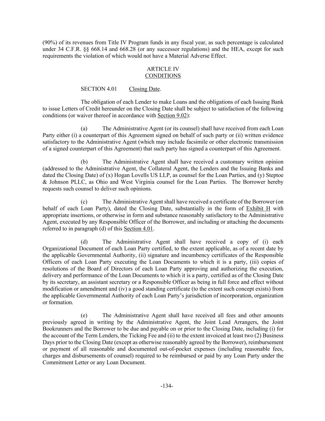 -134- (90%) of its revenues from Title IV Program funds in any fiscal year, as such percentage is calculated under 34 C.F.R. §§ 668.14 and 668.28 (or any successor regulations) and the HEA, except for such requirements the violation of which would not have a Material Adverse Effect. ARTICLE IV CONDITIONS SECTION 4.01 Closing Date. The obligation of each Lender to make Loans and the obligations of each Issuing Bank to issue Letters of Credit hereunder on the Closing Date shall be subject to satisfaction of the following conditions (or waiver thereof in accordance with Section 9.02): (a) The Administrative Agent (or its counsel) shall have received from each Loan Party either (i) a counterpart of this Agreement signed on behalf of such party or (ii) written evidence satisfactory to the Administrative Agent (which may include facsimile or other electronic transmission of a signed counterpart of this Agreement) that such party has signed a counterpart of this Agreement. (b) The Administrative Agent shall have received a customary written opinion (addressed to the Administrative Agent, the Collateral Agent, the Lenders and the Issuing Banks and dated the Closing Date) of (x) Hogan Lovells US LLP, as counsel for the Loan Parties, and (y) Steptoe & Johnson PLLC, as Ohio and West Virginia counsel for the Loan Parties. The Borrower hereby requests such counsel to deliver such opinions. (c) The Administrative Agent shall have received a certificate of the Borrower (on behalf of each Loan Party), dated the Closing Date, substantially in the form of Exhibit H with appropriate insertions, or otherwise in form and substance reasonably satisfactory to the Administrative Agent, executed by any Responsible Officer of the Borrower, and including or attaching the documents referred to in paragraph (d) of this Section 4.01. (d) The Administrative Agent shall have received a copy of (i) each Organizational Document of each Loan Party certified, to the extent applicable, as of a recent date by the applicable Governmental Authority, (ii) signature and incumbency certificates of the Responsible Officers of each Loan Party executing the Loan Documents to which it is a party, (iii) copies of resolutions of the Board of Directors of each Loan Party approving and authorizing the execution, delivery and performance of the Loan Documents to which it is a party, certified as of the Closing Date by its secretary, an assistant secretary or a Responsible Officer as being in full force and effect without modification or amendment and (iv) a good standing certificate (to the extent such concept exists) from the applicable Governmental Authority of each Loan Party’s jurisdiction of incorporation, organization or formation. (e) The Administrative Agent shall have received all fees and other amounts previously agreed in writing by the Administrative Agent, the Joint Lead Arrangers, the Joint Bookrunners and the Borrower to be due and payable on or prior to the Closing Date, including (i) for the account of the Term Lenders, the Ticking Fee and (ii) to the extent invoiced at least two (2) Business Days prior to the Closing Date (except as otherwise reasonably agreed by the Borrower), reimbursement or payment of all reasonable and documented out-of-pocket expenses (including reasonable fees, charges and disbursements of counsel) required to be reimbursed or paid by any Loan Party under the Commitment Letter or any Loan Document.