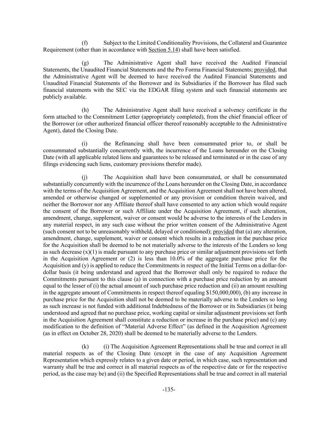 -135- (f) Subject to the Limited Conditionality Provisions, the Collateral and Guarantee Requirement (other than in accordance with Section 5.14) shall have been satisfied. (g) The Administrative Agent shall have received the Audited Financial Statements, the Unaudited Financial Statements and the Pro Forma Financial Statements; provided, that the Administrative Agent will be deemed to have received the Audited Financial Statements and Unaudited Financial Statements of the Borrower and its Subsidiaries if the Borrower has filed such financial statements with the SEC via the EDGAR filing system and such financial statements are publicly available. (h) The Administrative Agent shall have received a solvency certificate in the form attached to the Commitment Letter (appropriately completed), from the chief financial officer of the Borrower (or other authorized financial officer thereof reasonably acceptable to the Administrative Agent), dated the Closing Date. (i) the Refinancing shall have been consummated prior to, or shall be consummated substantially concurrently with, the incurrence of the Loans hereunder on the Closing Date (with all applicable related liens and guarantees to be released and terminated or in the case of any filings evidencing such liens, customary provisions therefor made). (j) The Acquisition shall have been consummated, or shall be consummated substantially concurrently with the incurrence of the Loans hereunder on the Closing Date, in accordance with the terms of the Acquisition Agreement, and the Acquisition Agreement shall not have been altered, amended or otherwise changed or supplemented or any provision or condition therein waived, and neither the Borrower nor any Affiliate thereof shall have consented to any action which would require the consent of the Borrower or such Affiliate under the Acquisition Agreement, if such alteration, amendment, change, supplement, waiver or consent would be adverse to the interests of the Lenders in any material respect, in any such case without the prior written consent of the Administrative Agent (such consent not to be unreasonably withheld, delayed or conditioned); provided that (a) any alteration, amendment, change, supplement, waiver or consent which results in a reduction in the purchase price for the Acquisition shall be deemed to be not materially adverse to the interests of the Lenders so long as such decrease (x)(1) is made pursuant to any purchase price or similar adjustment provisions set forth in the Acquisition Agreement or (2) is less than 10.0% of the aggregate purchase price for the Acquisition and (y) is applied to reduce the Commitments in respect of the Initial Terms on a dollar-for- dollar basis (it being understand and agreed that the Borrower shall only be required to reduce the Commitments pursuant to this clause (a) in connection with a purchase price reduction by an amount equal to the lesser of (i) the actual amount of such purchase price reduction and (ii) an amount resulting in the aggregate amount of Commitments in respect thereof equaling $150,000,000), (b) any increase in purchase price for the Acquisition shall not be deemed to be materially adverse to the Lenders so long as such increase is not funded with additional Indebtedness of the Borrower or its Subsidiaries (it being understood and agreed that no purchase price, working capital or similar adjustment provisions set forth in the Acquisition Agreement shall constitute a reduction or increase in the purchase price) and (c) any modification to the definition of “Material Adverse Effect” (as defined in the Acquisition Agreement (as in effect on October 28, 2020) shall be deemed to be materially adverse to the Lenders. (k) (i) The Acquisition Agreement Representations shall be true and correct in all material respects as of the Closing Date (except in the case of any Acquisition Agreement Representation which expressly relates to a given date or period, in which case, such representation and warranty shall be true and correct in all material respects as of the respective date or for the respective period, as the case may be) and (ii) the Specified Representations shall be true and correct in all material