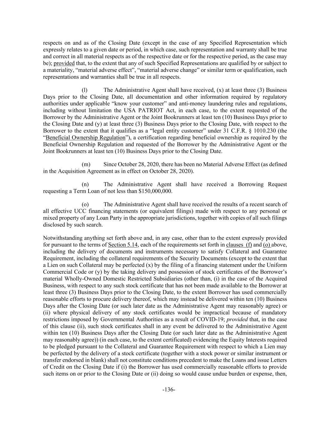 -136- respects on and as of the Closing Date (except in the case of any Specified Representation which expressly relates to a given date or period, in which case, such representation and warranty shall be true and correct in all material respects as of the respective date or for the respective period, as the case may be); provided that, to the extent that any of such Specified Representations are qualified by or subject to a materiality, “material adverse effect”, “material adverse change” or similar term or qualification, such representations and warranties shall be true in all respects. (l) The Administrative Agent shall have received, (x) at least three (3) Business Days prior to the Closing Date, all documentation and other information required by regulatory authorities under applicable “know your customer” and anti-money laundering rules and regulations, including without limitation the USA PATRIOT Act, in each case, to the extent requested of the Borrower by the Administrative Agent or the Joint Bookrunners at least ten (10) Business Days prior to the Closing Date and (y) at least three (3) Business Days prior to the Closing Date, with respect to the Borrower to the extent that it qualifies as a “legal entity customer” under 31 C.F.R. § 1010.230 (the “Beneficial Ownership Regulation”), a certification regarding beneficial ownership as required by the Beneficial Ownership Regulation and requested of the Borrower by the Administrative Agent or the Joint Bookrunners at least ten (10) Business Days prior to the Closing Date. (m) Since October 28, 2020, there has been no Material Adverse Effect (as defined in the Acquisition Agreement as in effect on October 28, 2020). (n) The Administrative Agent shall have received a Borrowing Request requesting a Term Loan of not less than $150,000,000. (o) The Administrative Agent shall have received the results of a recent search of all effective UCC financing statements (or equivalent filings) made with respect to any personal or mixed property of any Loan Party in the appropriate jurisdictions, together with copies of all such filings disclosed by such search. Notwithstanding anything set forth above and, in any case, other than to the extent expressly provided for pursuant to the terms of Section 5.14, each of the requirements set forth in clauses (f) and (o) above, including the delivery of documents and instruments necessary to satisfy Collateral and Guarantee Requirement, including the collateral requirements of the Security Documents (except to the extent that a Lien on such Collateral may be perfected (x) by the filing of a financing statement under the Uniform Commercial Code or (y) by the taking delivery and possession of stock certificates of the Borrower’s material Wholly-Owned Domestic Restricted Subsidiaries (other than, (i) in the case of the Acquired Business, with respect to any such stock certificate that has not been made available to the Borrower at least three (3) Business Days prior to the Closing Date, to the extent Borrower has used commercially reasonable efforts to procure delivery thereof, which may instead be delivered within ten (10) Business Days after the Closing Date (or such later date as the Administrative Agent may reasonably agree) or (ii) where physical delivery of any stock certificates would be impractical because of mandatory restrictions imposed by Governmental Authorities as a result of COVID-19; provided that, in the case of this clause (ii), such stock certificates shall in any event be delivered to the Administrative Agent within ten (10) Business Days after the Closing Date (or such later date as the Administrative Agent may reasonably agree)) (in each case, to the extent certificated) evidencing the Equity Interests required to be pledged pursuant to the Collateral and Guarantee Requirement with respect to which a Lien may be perfected by the delivery of a stock certificate (together with a stock power or similar instrument or transfer endorsed in blank) shall not constitute conditions precedent to make the Loans and issue Letters of Credit on the Closing Date if (i) the Borrower has used commercially reasonable efforts to provide such items on or prior to the Closing Date or (ii) doing so would cause undue burden or expense, then,