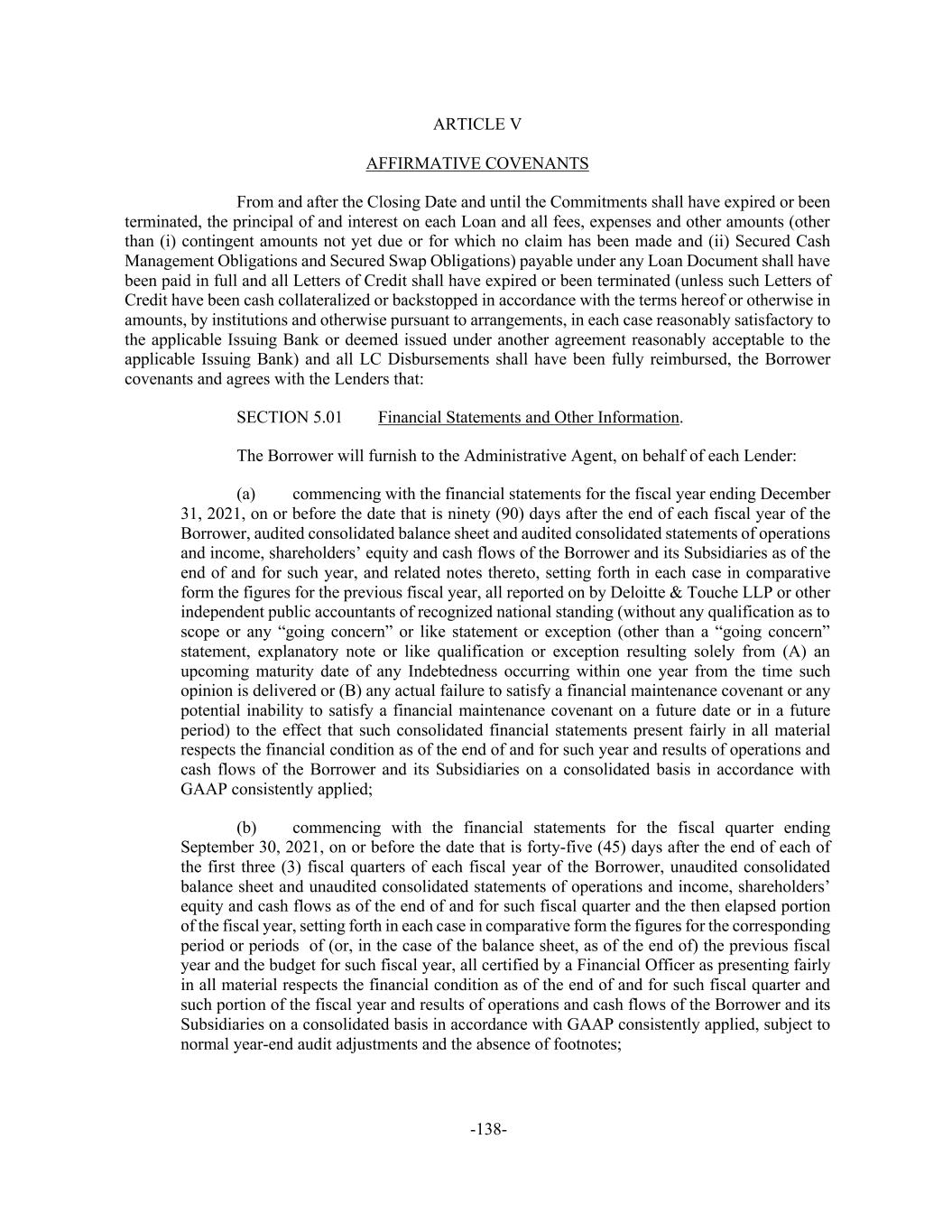 -138- ARTICLE V AFFIRMATIVE COVENANTS From and after the Closing Date and until the Commitments shall have expired or been terminated, the principal of and interest on each Loan and all fees, expenses and other amounts (other than (i) contingent amounts not yet due or for which no claim has been made and (ii) Secured Cash Management Obligations and Secured Swap Obligations) payable under any Loan Document shall have been paid in full and all Letters of Credit shall have expired or been terminated (unless such Letters of Credit have been cash collateralized or backstopped in accordance with the terms hereof or otherwise in amounts, by institutions and otherwise pursuant to arrangements, in each case reasonably satisfactory to the applicable Issuing Bank or deemed issued under another agreement reasonably acceptable to the applicable Issuing Bank) and all LC Disbursements shall have been fully reimbursed, the Borrower covenants and agrees with the Lenders that: SECTION 5.01 Financial Statements and Other Information. The Borrower will furnish to the Administrative Agent, on behalf of each Lender: (a) commencing with the financial statements for the fiscal year ending December 31, 2021, on or before the date that is ninety (90) days after the end of each fiscal year of the Borrower, audited consolidated balance sheet and audited consolidated statements of operations and income, shareholders’ equity and cash flows of the Borrower and its Subsidiaries as of the end of and for such year, and related notes thereto, setting forth in each case in comparative form the figures for the previous fiscal year, all reported on by Deloitte & Touche LLP or other independent public accountants of recognized national standing (without any qualification as to scope or any “going concern” or like statement or exception (other than a “going concern” statement, explanatory note or like qualification or exception resulting solely from (A) an upcoming maturity date of any Indebtedness occurring within one year from the time such opinion is delivered or (B) any actual failure to satisfy a financial maintenance covenant or any potential inability to satisfy a financial maintenance covenant on a future date or in a future period) to the effect that such consolidated financial statements present fairly in all material respects the financial condition as of the end of and for such year and results of operations and cash flows of the Borrower and its Subsidiaries on a consolidated basis in accordance with GAAP consistently applied; (b) commencing with the financial statements for the fiscal quarter ending September 30, 2021, on or before the date that is forty-five (45) days after the end of each of the first three (3) fiscal quarters of each fiscal year of the Borrower, unaudited consolidated balance sheet and unaudited consolidated statements of operations and income, shareholders’ equity and cash flows as of the end of and for such fiscal quarter and the then elapsed portion of the fiscal year, setting forth in each case in comparative form the figures for the corresponding period or periods of (or, in the case of the balance sheet, as of the end of) the previous fiscal year and the budget for such fiscal year, all certified by a Financial Officer as presenting fairly in all material respects the financial condition as of the end of and for such fiscal quarter and such portion of the fiscal year and results of operations and cash flows of the Borrower and its Subsidiaries on a consolidated basis in accordance with GAAP consistently applied, subject to normal year-end audit adjustments and the absence of footnotes;