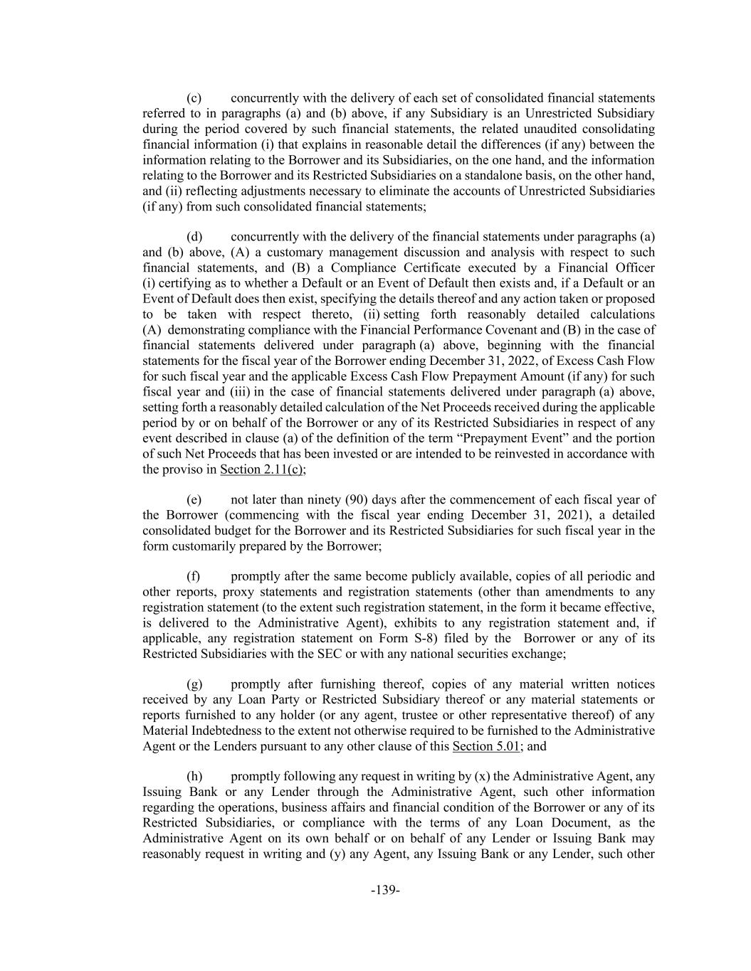 -139- (c) concurrently with the delivery of each set of consolidated financial statements referred to in paragraphs (a) and (b) above, if any Subsidiary is an Unrestricted Subsidiary during the period covered by such financial statements, the related unaudited consolidating financial information (i) that explains in reasonable detail the differences (if any) between the information relating to the Borrower and its Subsidiaries, on the one hand, and the information relating to the Borrower and its Restricted Subsidiaries on a standalone basis, on the other hand, and (ii) reflecting adjustments necessary to eliminate the accounts of Unrestricted Subsidiaries (if any) from such consolidated financial statements; (d) concurrently with the delivery of the financial statements under paragraphs (a) and (b) above, (A) a customary management discussion and analysis with respect to such financial statements, and (B) a Compliance Certificate executed by a Financial Officer (i) certifying as to whether a Default or an Event of Default then exists and, if a Default or an Event of Default does then exist, specifying the details thereof and any action taken or proposed to be taken with respect thereto, (ii) setting forth reasonably detailed calculations (A) demonstrating compliance with the Financial Performance Covenant and (B) in the case of financial statements delivered under paragraph (a) above, beginning with the financial statements for the fiscal year of the Borrower ending December 31, 2022, of Excess Cash Flow for such fiscal year and the applicable Excess Cash Flow Prepayment Amount (if any) for such fiscal year and (iii) in the case of financial statements delivered under paragraph (a) above, setting forth a reasonably detailed calculation of the Net Proceeds received during the applicable period by or on behalf of the Borrower or any of its Restricted Subsidiaries in respect of any event described in clause (a) of the definition of the term “Prepayment Event” and the portion of such Net Proceeds that has been invested or are intended to be reinvested in accordance with the proviso in Section 2.11(c); (e) not later than ninety (90) days after the commencement of each fiscal year of the Borrower (commencing with the fiscal year ending December 31, 2021), a detailed consolidated budget for the Borrower and its Restricted Subsidiaries for such fiscal year in the form customarily prepared by the Borrower; (f) promptly after the same become publicly available, copies of all periodic and other reports, proxy statements and registration statements (other than amendments to any registration statement (to the extent such registration statement, in the form it became effective, is delivered to the Administrative Agent), exhibits to any registration statement and, if applicable, any registration statement on Form S-8) filed by the Borrower or any of its Restricted Subsidiaries with the SEC or with any national securities exchange; (g) promptly after furnishing thereof, copies of any material written notices received by any Loan Party or Restricted Subsidiary thereof or any material statements or reports furnished to any holder (or any agent, trustee or other representative thereof) of any Material Indebtedness to the extent not otherwise required to be furnished to the Administrative Agent or the Lenders pursuant to any other clause of this Section 5.01; and (h) promptly following any request in writing by (x) the Administrative Agent, any Issuing Bank or any Lender through the Administrative Agent, such other information regarding the operations, business affairs and financial condition of the Borrower or any of its Restricted Subsidiaries, or compliance with the terms of any Loan Document, as the Administrative Agent on its own behalf or on behalf of any Lender or Issuing Bank may reasonably request in writing and (y) any Agent, any Issuing Bank or any Lender, such other