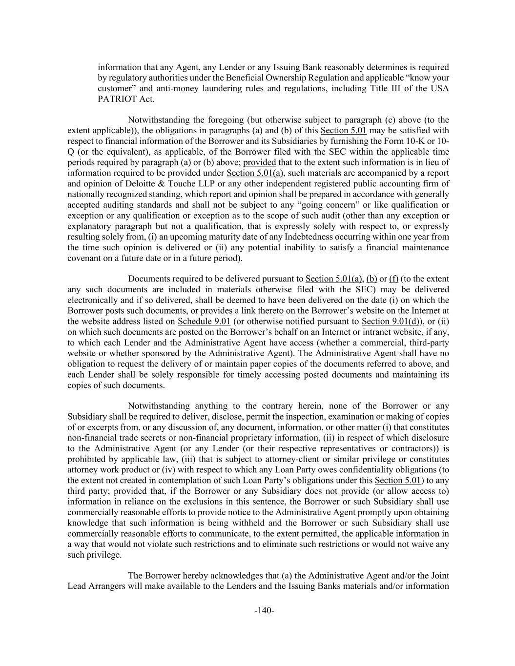 -140- information that any Agent, any Lender or any Issuing Bank reasonably determines is required by regulatory authorities under the Beneficial Ownership Regulation and applicable “know your customer” and anti-money laundering rules and regulations, including Title III of the USA PATRIOT Act. Notwithstanding the foregoing (but otherwise subject to paragraph (c) above (to the extent applicable)), the obligations in paragraphs (a) and (b) of this Section 5.01 may be satisfied with respect to financial information of the Borrower and its Subsidiaries by furnishing the Form 10-K or 10- Q (or the equivalent), as applicable, of the Borrower filed with the SEC within the applicable time periods required by paragraph (a) or (b) above; provided that to the extent such information is in lieu of information required to be provided under Section 5.01(a), such materials are accompanied by a report and opinion of Deloitte & Touche LLP or any other independent registered public accounting firm of nationally recognized standing, which report and opinion shall be prepared in accordance with generally accepted auditing standards and shall not be subject to any “going concern” or like qualification or exception or any qualification or exception as to the scope of such audit (other than any exception or explanatory paragraph but not a qualification, that is expressly solely with respect to, or expressly resulting solely from, (i) an upcoming maturity date of any Indebtedness occurring within one year from the time such opinion is delivered or (ii) any potential inability to satisfy a financial maintenance covenant on a future date or in a future period). Documents required to be delivered pursuant to Section 5.01(a), (b) or (f) (to the extent any such documents are included in materials otherwise filed with the SEC) may be delivered electronically and if so delivered, shall be deemed to have been delivered on the date (i) on which the Borrower posts such documents, or provides a link thereto on the Borrower’s website on the Internet at the website address listed on Schedule 9.01 (or otherwise notified pursuant to Section 9.01(d)), or (ii) on which such documents are posted on the Borrower’s behalf on an Internet or intranet website, if any, to which each Lender and the Administrative Agent have access (whether a commercial, third-party website or whether sponsored by the Administrative Agent). The Administrative Agent shall have no obligation to request the delivery of or maintain paper copies of the documents referred to above, and each Lender shall be solely responsible for timely accessing posted documents and maintaining its copies of such documents. Notwithstanding anything to the contrary herein, none of the Borrower or any Subsidiary shall be required to deliver, disclose, permit the inspection, examination or making of copies of or excerpts from, or any discussion of, any document, information, or other matter (i) that constitutes non-financial trade secrets or non-financial proprietary information, (ii) in respect of which disclosure to the Administrative Agent (or any Lender (or their respective representatives or contractors)) is prohibited by applicable law, (iii) that is subject to attorney-client or similar privilege or constitutes attorney work product or (iv) with respect to which any Loan Party owes confidentiality obligations (to the extent not created in contemplation of such Loan Party’s obligations under this Section 5.01) to any third party; provided that, if the Borrower or any Subsidiary does not provide (or allow access to) information in reliance on the exclusions in this sentence, the Borrower or such Subsidiary shall use commercially reasonable efforts to provide notice to the Administrative Agent promptly upon obtaining knowledge that such information is being withheld and the Borrower or such Subsidiary shall use commercially reasonable efforts to communicate, to the extent permitted, the applicable information in a way that would not violate such restrictions and to eliminate such restrictions or would not waive any such privilege. The Borrower hereby acknowledges that (a) the Administrative Agent and/or the Joint Lead Arrangers will make available to the Lenders and the Issuing Banks materials and/or information