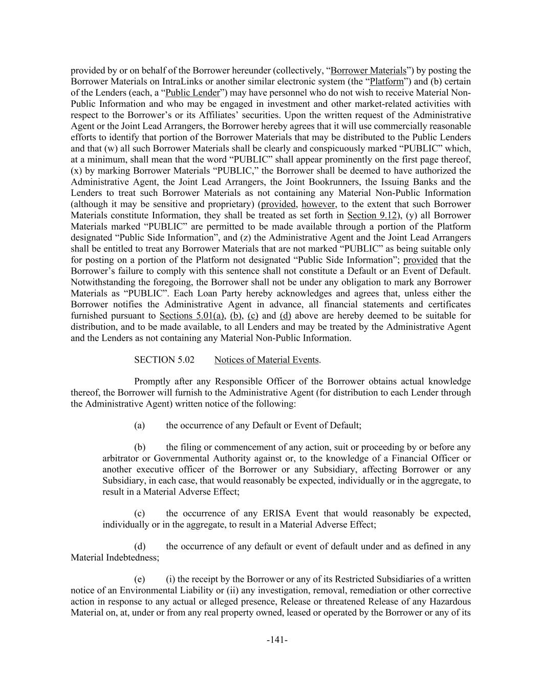 -141- provided by or on behalf of the Borrower hereunder (collectively, “Borrower Materials”) by posting the Borrower Materials on IntraLinks or another similar electronic system (the “Platform”) and (b) certain of the Lenders (each, a “Public Lender”) may have personnel who do not wish to receive Material Non- Public Information and who may be engaged in investment and other market-related activities with respect to the Borrower’s or its Affiliates’ securities. Upon the written request of the Administrative Agent or the Joint Lead Arrangers, the Borrower hereby agrees that it will use commercially reasonable efforts to identify that portion of the Borrower Materials that may be distributed to the Public Lenders and that (w) all such Borrower Materials shall be clearly and conspicuously marked “PUBLIC” which, at a minimum, shall mean that the word “PUBLIC” shall appear prominently on the first page thereof, (x) by marking Borrower Materials “PUBLIC,” the Borrower shall be deemed to have authorized the Administrative Agent, the Joint Lead Arrangers, the Joint Bookrunners, the Issuing Banks and the Lenders to treat such Borrower Materials as not containing any Material Non-Public Information (although it may be sensitive and proprietary) (provided, however, to the extent that such Borrower Materials constitute Information, they shall be treated as set forth in Section 9.12), (y) all Borrower Materials marked “PUBLIC” are permitted to be made available through a portion of the Platform designated “Public Side Information”, and (z) the Administrative Agent and the Joint Lead Arrangers shall be entitled to treat any Borrower Materials that are not marked “PUBLIC” as being suitable only for posting on a portion of the Platform not designated “Public Side Information”; provided that the Borrower’s failure to comply with this sentence shall not constitute a Default or an Event of Default. Notwithstanding the foregoing, the Borrower shall not be under any obligation to mark any Borrower Materials as “PUBLIC”. Each Loan Party hereby acknowledges and agrees that, unless either the Borrower notifies the Administrative Agent in advance, all financial statements and certificates furnished pursuant to Sections 5.01(a), (b), (c) and (d) above are hereby deemed to be suitable for distribution, and to be made available, to all Lenders and may be treated by the Administrative Agent and the Lenders as not containing any Material Non-Public Information. SECTION 5.02 Notices of Material Events. Promptly after any Responsible Officer of the Borrower obtains actual knowledge thereof, the Borrower will furnish to the Administrative Agent (for distribution to each Lender through the Administrative Agent) written notice of the following: (a) the occurrence of any Default or Event of Default; (b) the filing or commencement of any action, suit or proceeding by or before any arbitrator or Governmental Authority against or, to the knowledge of a Financial Officer or another executive officer of the Borrower or any Subsidiary, affecting Borrower or any Subsidiary, in each case, that would reasonably be expected, individually or in the aggregate, to result in a Material Adverse Effect; (c) the occurrence of any ERISA Event that would reasonably be expected, individually or in the aggregate, to result in a Material Adverse Effect; (d) the occurrence of any default or event of default under and as defined in any Material Indebtedness; (e) (i) the receipt by the Borrower or any of its Restricted Subsidiaries of a written notice of an Environmental Liability or (ii) any investigation, removal, remediation or other corrective action in response to any actual or alleged presence, Release or threatened Release of any Hazardous Material on, at, under or from any real property owned, leased or operated by the Borrower or any of its
