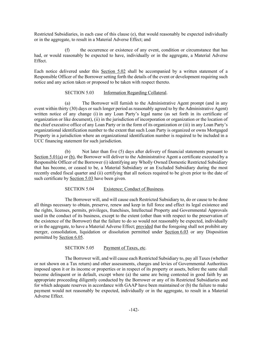 -142- Restricted Subsidiaries, in each case of this clause (e), that would reasonably be expected individually or in the aggregate, to result in a Material Adverse Effect; and (f) the occurrence or existence of any event, condition or circumstance that has had, or would reasonably be expected to have, individually or in the aggregate, a Material Adverse Effect. Each notice delivered under this Section 5.02 shall be accompanied by a written statement of a Responsible Officer of the Borrower setting forth the details of the event or development requiring such notice and any action taken or proposed to be taken with respect thereto. SECTION 5.03 Information Regarding Collateral. (a) The Borrower will furnish to the Administrative Agent prompt (and in any event within thirty (30) days or such longer period as reasonably agreed to by the Administrative Agent) written notice of any change (i) in any Loan Party’s legal name (as set forth in its certificate of organization or like document), (ii) in the jurisdiction of incorporation or organization or the location of the chief executive office of any Loan Party or in the form of its organization or (iii) in any Loan Party’s organizational identification number to the extent that such Loan Party is organized or owns Mortgaged Property in a jurisdiction where an organizational identification number is required to be included in a UCC financing statement for such jurisdiction. (b) Not later than five (5) days after delivery of financial statements pursuant to Section 5.01(a) or (b), the Borrower will deliver to the Administrative Agent a certificate executed by a Responsible Officer of the Borrower (i) identifying any Wholly Owned Domestic Restricted Subsidiary that has become, or ceased to be, a Material Subsidiary or an Excluded Subsidiary during the most recently ended fiscal quarter and (ii) certifying that all notices required to be given prior to the date of such certificate by Section 5.03 have been given. SECTION 5.04 Existence; Conduct of Business. The Borrower will, and will cause each Restricted Subsidiary to, do or cause to be done all things necessary to obtain, preserve, renew and keep in full force and effect its legal existence and the rights, licenses, permits, privileges, franchises, Intellectual Property and Governmental Approvals used in the conduct of its business, except to the extent (other than with respect to the preservation of the existence of the Borrower) that the failure to do so would not reasonably be expected, individually or in the aggregate, to have a Material Adverse Effect; provided that the foregoing shall not prohibit any merger, consolidation, liquidation or dissolution permitted under Section 6.03 or any Disposition permitted by Section 6.05. SECTION 5.05 Payment of Taxes, etc. The Borrower will, and will cause each Restricted Subsidiary to, pay all Taxes (whether or not shown on a Tax return) and other assessments, charges and levies of Governmental Authorities imposed upon it or its income or properties or in respect of its property or assets, before the same shall become delinquent or in default, except where (a) the same are being contested in good faith by an appropriate proceeding diligently conducted by the Borrower or any of its Restricted Subsidiaries and for which adequate reserves in accordance with GAAP have been maintained or (b) the failure to make payment would not reasonably be expected, individually or in the aggregate, to result in a Material Adverse Effect.
