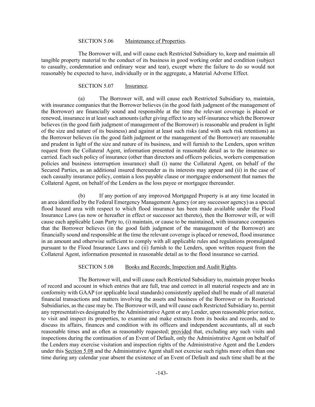 -143- SECTION 5.06 Maintenance of Properties. The Borrower will, and will cause each Restricted Subsidiary to, keep and maintain all tangible property material to the conduct of its business in good working order and condition (subject to casualty, condemnation and ordinary wear and tear), except where the failure to do so would not reasonably be expected to have, individually or in the aggregate, a Material Adverse Effect. SECTION 5.07 Insurance. (a) The Borrower will, and will cause each Restricted Subsidiary to, maintain, with insurance companies that the Borrower believes (in the good faith judgment of the management of the Borrower) are financially sound and responsible at the time the relevant coverage is placed or renewed, insurance in at least such amounts (after giving effect to any self-insurance which the Borrower believes (in the good faith judgment of management of the Borrower) is reasonable and prudent in light of the size and nature of its business) and against at least such risks (and with such risk retentions) as the Borrower believes (in the good faith judgment or the management of the Borrower) are reasonable and prudent in light of the size and nature of its business, and will furnish to the Lenders, upon written request from the Collateral Agent, information presented in reasonable detail as to the insurance so carried. Each such policy of insurance (other than directors and officers policies, workers compensation policies and business interruption insurance) shall (i) name the Collateral Agent, on behalf of the Secured Parties, as an additional insured thereunder as its interests may appear and (ii) in the case of each casualty insurance policy, contain a loss payable clause or mortgagee endorsement that names the Collateral Agent, on behalf of the Lenders as the loss payee or mortgagee thereunder. (b) If any portion of any improved Mortgaged Property is at any time located in an area identified by the Federal Emergency Management Agency (or any successor agency) as a special flood hazard area with respect to which flood insurance has been made available under the Flood Insurance Laws (as now or hereafter in effect or successor act thereto), then the Borrower will, or will cause each applicable Loan Party to, (i) maintain, or cause to be maintained, with insurance companies that the Borrower believes (in the good faith judgment of the management of the Borrower) are financially sound and responsible at the time the relevant coverage is placed or renewed, flood insurance in an amount and otherwise sufficient to comply with all applicable rules and regulations promulgated pursuant to the Flood Insurance Laws and (ii) furnish to the Lenders, upon written request from the Collateral Agent, information presented in reasonable detail as to the flood insurance so carried. SECTION 5.08 Books and Records; Inspection and Audit Rights. The Borrower will, and will cause each Restricted Subsidiary to, maintain proper books of record and account in which entries that are full, true and correct in all material respects and are in conformity with GAAP (or applicable local standards) consistently applied shall be made of all material financial transactions and matters involving the assets and business of the Borrower or its Restricted Subsidiaries, as the case may be. The Borrower will, and will cause each Restricted Subsidiary to, permit any representatives designated by the Administrative Agent or any Lender, upon reasonable prior notice, to visit and inspect its properties, to examine and make extracts from its books and records, and to discuss its affairs, finances and condition with its officers and independent accountants, all at such reasonable times and as often as reasonably requested; provided that, excluding any such visits and inspections during the continuation of an Event of Default, only the Administrative Agent on behalf of the Lenders may exercise visitation and inspection rights of the Administrative Agent and the Lenders under this Section 5.08 and the Administrative Agent shall not exercise such rights more often than one time during any calendar year absent the existence of an Event of Default and such time shall be at the