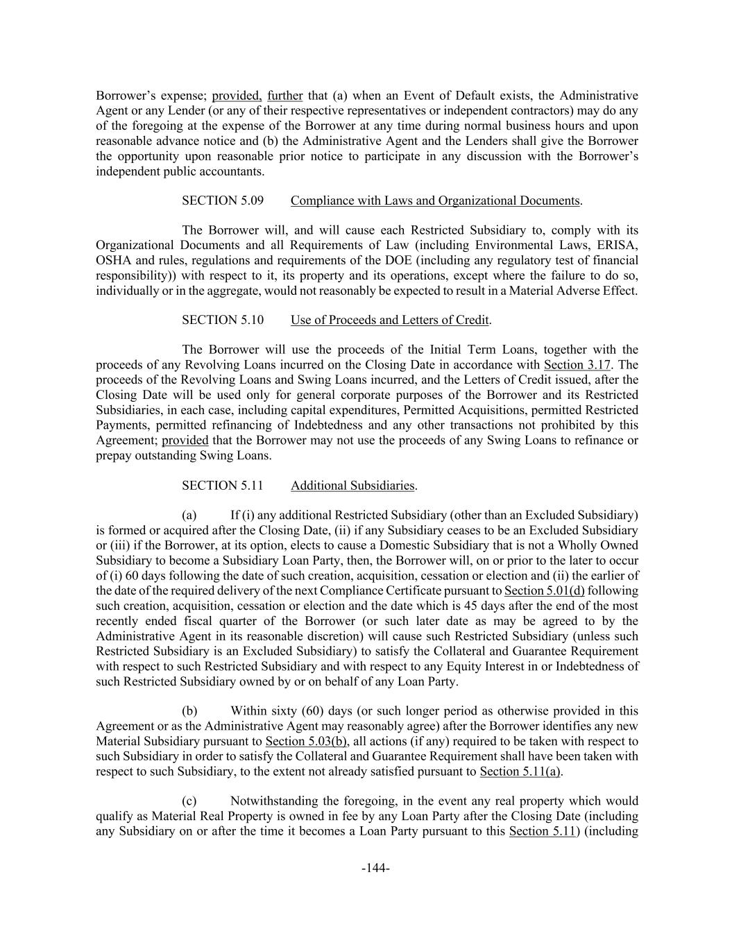 -144- Borrower’s expense; provided, further that (a) when an Event of Default exists, the Administrative Agent or any Lender (or any of their respective representatives or independent contractors) may do any of the foregoing at the expense of the Borrower at any time during normal business hours and upon reasonable advance notice and (b) the Administrative Agent and the Lenders shall give the Borrower the opportunity upon reasonable prior notice to participate in any discussion with the Borrower’s independent public accountants. SECTION 5.09 Compliance with Laws and Organizational Documents. The Borrower will, and will cause each Restricted Subsidiary to, comply with its Organizational Documents and all Requirements of Law (including Environmental Laws, ERISA, OSHA and rules, regulations and requirements of the DOE (including any regulatory test of financial responsibility)) with respect to it, its property and its operations, except where the failure to do so, individually or in the aggregate, would not reasonably be expected to result in a Material Adverse Effect. SECTION 5.10 Use of Proceeds and Letters of Credit. The Borrower will use the proceeds of the Initial Term Loans, together with the proceeds of any Revolving Loans incurred on the Closing Date in accordance with Section 3.17. The proceeds of the Revolving Loans and Swing Loans incurred, and the Letters of Credit issued, after the Closing Date will be used only for general corporate purposes of the Borrower and its Restricted Subsidiaries, in each case, including capital expenditures, Permitted Acquisitions, permitted Restricted Payments, permitted refinancing of Indebtedness and any other transactions not prohibited by this Agreement; provided that the Borrower may not use the proceeds of any Swing Loans to refinance or prepay outstanding Swing Loans. SECTION 5.11 Additional Subsidiaries. (a) If (i) any additional Restricted Subsidiary (other than an Excluded Subsidiary) is formed or acquired after the Closing Date, (ii) if any Subsidiary ceases to be an Excluded Subsidiary or (iii) if the Borrower, at its option, elects to cause a Domestic Subsidiary that is not a Wholly Owned Subsidiary to become a Subsidiary Loan Party, then, the Borrower will, on or prior to the later to occur of (i) 60 days following the date of such creation, acquisition, cessation or election and (ii) the earlier of the date of the required delivery of the next Compliance Certificate pursuant to Section 5.01(d) following such creation, acquisition, cessation or election and the date which is 45 days after the end of the most recently ended fiscal quarter of the Borrower (or such later date as may be agreed to by the Administrative Agent in its reasonable discretion) will cause such Restricted Subsidiary (unless such Restricted Subsidiary is an Excluded Subsidiary) to satisfy the Collateral and Guarantee Requirement with respect to such Restricted Subsidiary and with respect to any Equity Interest in or Indebtedness of such Restricted Subsidiary owned by or on behalf of any Loan Party. (b) Within sixty (60) days (or such longer period as otherwise provided in this Agreement or as the Administrative Agent may reasonably agree) after the Borrower identifies any new Material Subsidiary pursuant to Section 5.03(b), all actions (if any) required to be taken with respect to such Subsidiary in order to satisfy the Collateral and Guarantee Requirement shall have been taken with respect to such Subsidiary, to the extent not already satisfied pursuant to Section 5.11(a). (c) Notwithstanding the foregoing, in the event any real property which would qualify as Material Real Property is owned in fee by any Loan Party after the Closing Date (including any Subsidiary on or after the time it becomes a Loan Party pursuant to this Section 5.11) (including