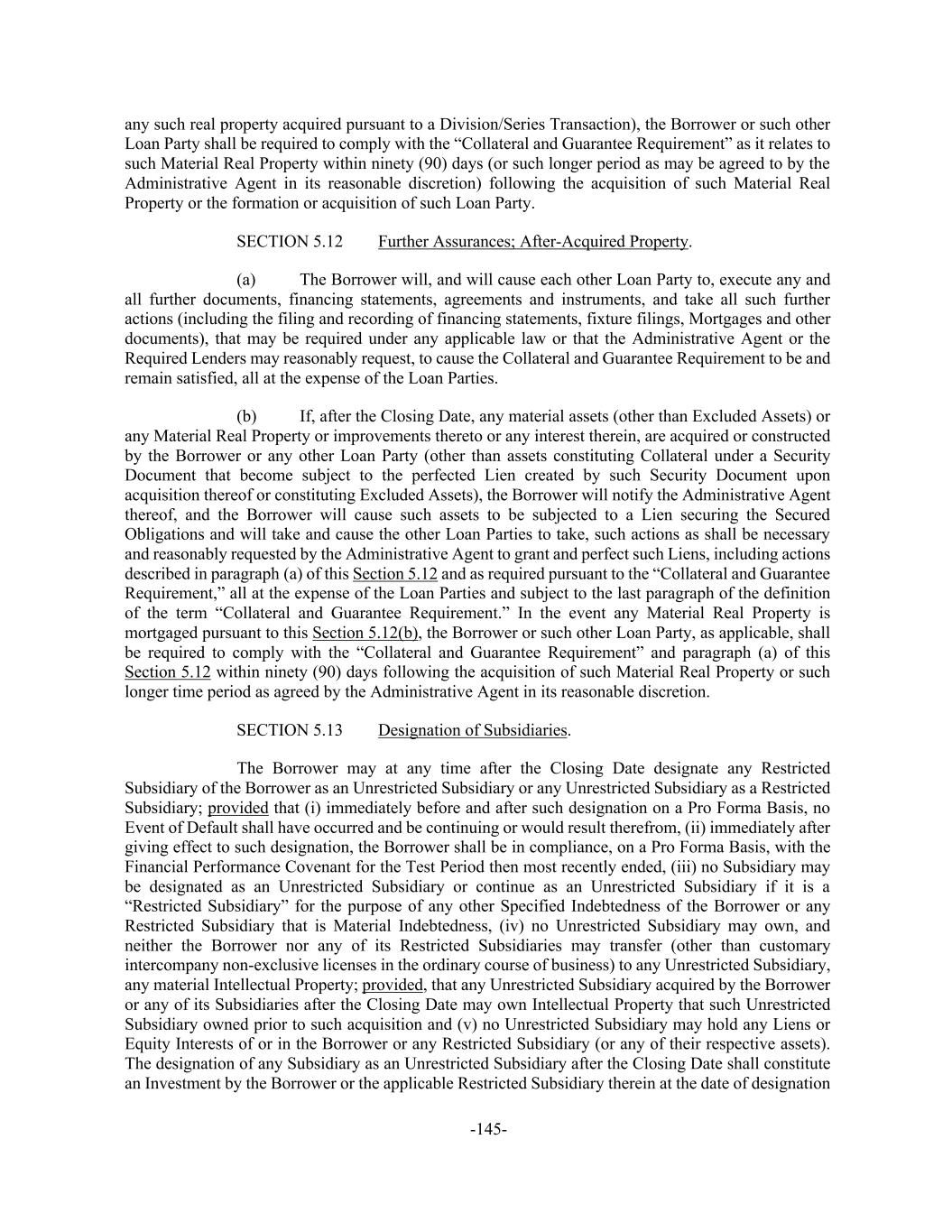 -145- any such real property acquired pursuant to a Division/Series Transaction), the Borrower or such other Loan Party shall be required to comply with the “Collateral and Guarantee Requirement” as it relates to such Material Real Property within ninety (90) days (or such longer period as may be agreed to by the Administrative Agent in its reasonable discretion) following the acquisition of such Material Real Property or the formation or acquisition of such Loan Party. SECTION 5.12 Further Assurances; After-Acquired Property. (a) The Borrower will, and will cause each other Loan Party to, execute any and all further documents, financing statements, agreements and instruments, and take all such further actions (including the filing and recording of financing statements, fixture filings, Mortgages and other documents), that may be required under any applicable law or that the Administrative Agent or the Required Lenders may reasonably request, to cause the Collateral and Guarantee Requirement to be and remain satisfied, all at the expense of the Loan Parties. (b) If, after the Closing Date, any material assets (other than Excluded Assets) or any Material Real Property or improvements thereto or any interest therein, are acquired or constructed by the Borrower or any other Loan Party (other than assets constituting Collateral under a Security Document that become subject to the perfected Lien created by such Security Document upon acquisition thereof or constituting Excluded Assets), the Borrower will notify the Administrative Agent thereof, and the Borrower will cause such assets to be subjected to a Lien securing the Secured Obligations and will take and cause the other Loan Parties to take, such actions as shall be necessary and reasonably requested by the Administrative Agent to grant and perfect such Liens, including actions described in paragraph (a) of this Section 5.12 and as required pursuant to the “Collateral and Guarantee Requirement,” all at the expense of the Loan Parties and subject to the last paragraph of the definition of the term “Collateral and Guarantee Requirement.” In the event any Material Real Property is mortgaged pursuant to this Section 5.12(b), the Borrower or such other Loan Party, as applicable, shall be required to comply with the “Collateral and Guarantee Requirement” and paragraph (a) of this Section 5.12 within ninety (90) days following the acquisition of such Material Real Property or such longer time period as agreed by the Administrative Agent in its reasonable discretion. SECTION 5.13 Designation of Subsidiaries. The Borrower may at any time after the Closing Date designate any Restricted Subsidiary of the Borrower as an Unrestricted Subsidiary or any Unrestricted Subsidiary as a Restricted Subsidiary; provided that (i) immediately before and after such designation on a Pro Forma Basis, no Event of Default shall have occurred and be continuing or would result therefrom, (ii) immediately after giving effect to such designation, the Borrower shall be in compliance, on a Pro Forma Basis, with the Financial Performance Covenant for the Test Period then most recently ended, (iii) no Subsidiary may be designated as an Unrestricted Subsidiary or continue as an Unrestricted Subsidiary if it is a “Restricted Subsidiary” for the purpose of any other Specified Indebtedness of the Borrower or any Restricted Subsidiary that is Material Indebtedness, (iv) no Unrestricted Subsidiary may own, and neither the Borrower nor any of its Restricted Subsidiaries may transfer (other than customary intercompany non-exclusive licenses in the ordinary course of business) to any Unrestricted Subsidiary, any material Intellectual Property; provided, that any Unrestricted Subsidiary acquired by the Borrower or any of its Subsidiaries after the Closing Date may own Intellectual Property that such Unrestricted Subsidiary owned prior to such acquisition and (v) no Unrestricted Subsidiary may hold any Liens or Equity Interests of or in the Borrower or any Restricted Subsidiary (or any of their respective assets). The designation of any Subsidiary as an Unrestricted Subsidiary after the Closing Date shall constitute an Investment by the Borrower or the applicable Restricted Subsidiary therein at the date of designation