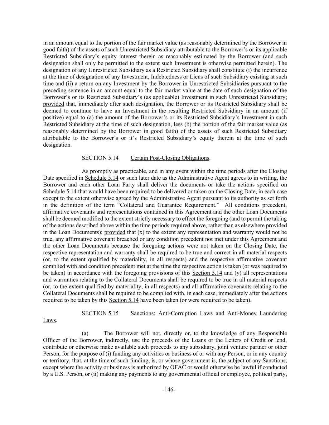 -146- in an amount equal to the portion of the fair market value (as reasonably determined by the Borrower in good faith) of the assets of such Unrestricted Subsidiary attributable to the Borrower’s or its applicable Restricted Subsidiary’s equity interest therein as reasonably estimated by the Borrower (and such designation shall only be permitted to the extent such Investment is otherwise permitted herein). The designation of any Unrestricted Subsidiary as a Restricted Subsidiary shall constitute (i) the incurrence at the time of designation of any Investment, Indebtedness or Liens of such Subsidiary existing at such time and (ii) a return on any Investment by the Borrower in Unrestricted Subsidiaries pursuant to the preceding sentence in an amount equal to the fair market value at the date of such designation of the Borrower’s or its Restricted Subsidiary’s (as applicable) Investment in such Unrestricted Subsidiary; provided that, immediately after such designation, the Borrower or its Restricted Subsidiary shall be deemed to continue to have an Investment in the resulting Restricted Subsidiary in an amount (if positive) equal to (a) the amount of the Borrower’s or its Restricted Subsidiary’s Investment in such Restricted Subsidiary at the time of such designation, less (b) the portion of the fair market value (as reasonably determined by the Borrower in good faith) of the assets of such Restricted Subsidiary attributable to the Borrower’s or it’s Restricted Subsidiary’s equity therein at the time of such designation. SECTION 5.14 Certain Post-Closing Obligations. As promptly as practicable, and in any event within the time periods after the Closing Date specified in Schedule 5.14 or such later date as the Administrative Agent agrees to in writing, the Borrower and each other Loan Party shall deliver the documents or take the actions specified on Schedule 5.14 that would have been required to be delivered or taken on the Closing Date, in each case except to the extent otherwise agreed by the Administrative Agent pursuant to its authority as set forth in the definition of the term “Collateral and Guarantee Requirement.” All conditions precedent, affirmative covenants and representations contained in this Agreement and the other Loan Documents shall be deemed modified to the extent strictly necessary to effect the foregoing (and to permit the taking of the actions described above within the time periods required above, rather than as elsewhere provided in the Loan Documents); provided that (x) to the extent any representation and warranty would not be true, any affirmative covenant breached or any condition precedent not met under this Agreement and the other Loan Documents because the foregoing actions were not taken on the Closing Date, the respective representation and warranty shall be required to be true and correct in all material respects (or, to the extent qualified by materiality, in all respects) and the respective affirmative covenant complied with and condition precedent met at the time the respective action is taken (or was required to be taken) in accordance with the foregoing provisions of this Section 5.14 and (y) all representations and warranties relating to the Collateral Documents shall be required to be true in all material respects (or, to the extent qualified by materiality, in all respects) and all affirmative covenants relating to the Collateral Documents shall be required to be complied with, in each case, immediately after the actions required to be taken by this Section 5.14 have been taken (or were required to be taken). SECTION 5.15 Sanctions; Anti-Corruption Laws and Anti-Money Laundering Laws. (a) The Borrower will not, directly or, to the knowledge of any Responsible Officer of the Borrower, indirectly, use the proceeds of the Loans or the Letters of Credit or lend, contribute or otherwise make available such proceeds to any subsidiary, joint venture partner or other Person, for the purpose of (i) funding any activities or business of or with any Person, or in any country or territory, that, at the time of such funding, is, or whose government is, the subject of any Sanctions, except where the activity or business is authorized by OFAC or would otherwise be lawful if conducted by a U.S. Person, or (ii) making any payments to any governmental official or employee, political party,