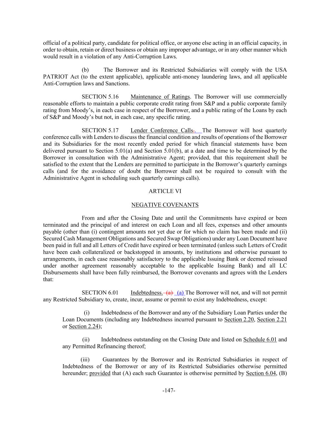 -147- official of a political party, candidate for political office, or anyone else acting in an official capacity, in order to obtain, retain or direct business or obtain any improper advantage, or in any other manner which would result in a violation of any Anti-Corruption Laws. (b) The Borrower and its Restricted Subsidiaries will comply with the USA PATRIOT Act (to the extent applicable), applicable anti-money laundering laws, and all applicable Anti-Corruption laws and Sanctions. SECTION 5.16 Maintenance of Ratings. The Borrower will use commercially reasonable efforts to maintain a public corporate credit rating from S&P and a public corporate family rating from Moody’s, in each case in respect of the Borrower, and a public rating of the Loans by each of S&P and Moody’s but not, in each case, any specific rating. SECTION 5.17 Lender Conference Calls.. The Borrower will host quarterly conference calls with Lenders to discuss the financial condition and results of operations of the Borrower and its Subsidiaries for the most recently ended period for which financial statements have been delivered pursuant to Section 5.01(a) and Section 5.01(b), at a date and time to be determined by the Borrower in consultation with the Administrative Agent; provided, that this requirement shall be satisfied to the extent that the Lenders are permitted to participate in the Borrower’s quarterly earnings calls (and for the avoidance of doubt the Borrower shall not be required to consult with the Administrative Agent in scheduling such quarterly earnings calls). ARTICLE VI NEGATIVE COVENANTS From and after the Closing Date and until the Commitments have expired or been terminated and the principal of and interest on each Loan and all fees, expenses and other amounts payable (other than (i) contingent amounts not yet due or for which no claim has been made and (ii) Secured Cash Management Obligations and Secured Swap Obligations) under any Loan Document have been paid in full and all Letters of Credit have expired or been terminated (unless such Letters of Credit have been cash collateralized or backstopped in amounts, by institutions and otherwise pursuant to arrangements, in each case reasonably satisfactory to the applicable Issuing Bank or deemed reissued under another agreement reasonably acceptable to the applicable Issuing Bank) and all LC Disbursements shall have been fully reimbursed, the Borrower covenants and agrees with the Lenders that: SECTION 6.01 Indebtedness. (a) (a) The Borrower will not, and will not permit any Restricted Subsidiary to, create, incur, assume or permit to exist any Indebtedness, except: (i) Indebtedness of the Borrower and any of the Subsidiary Loan Parties under the Loan Documents (including any Indebtedness incurred pursuant to Section 2.20, Section 2.21 or Section 2.24); (ii) Indebtedness outstanding on the Closing Date and listed on Schedule 6.01 and any Permitted Refinancing thereof; (iii) Guarantees by the Borrower and its Restricted Subsidiaries in respect of Indebtedness of the Borrower or any of its Restricted Subsidiaries otherwise permitted hereunder; provided that (A) each such Guarantee is otherwise permitted by Section 6.04, (B)