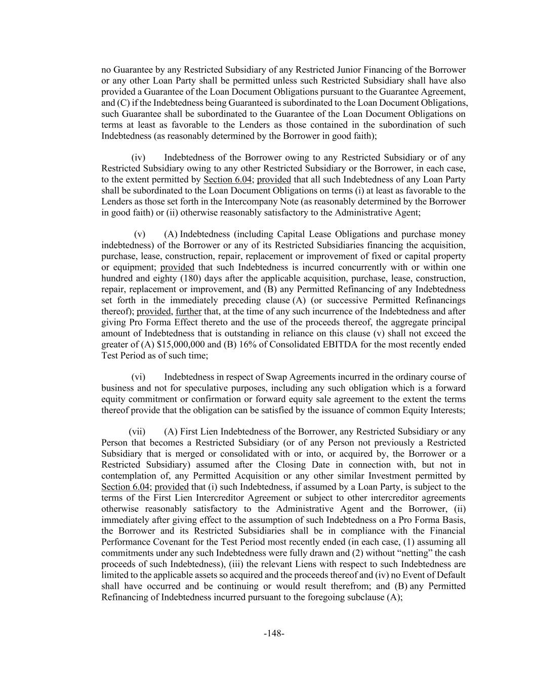 -148- no Guarantee by any Restricted Subsidiary of any Restricted Junior Financing of the Borrower or any other Loan Party shall be permitted unless such Restricted Subsidiary shall have also provided a Guarantee of the Loan Document Obligations pursuant to the Guarantee Agreement, and (C) if the Indebtedness being Guaranteed is subordinated to the Loan Document Obligations, such Guarantee shall be subordinated to the Guarantee of the Loan Document Obligations on terms at least as favorable to the Lenders as those contained in the subordination of such Indebtedness (as reasonably determined by the Borrower in good faith); (iv) Indebtedness of the Borrower owing to any Restricted Subsidiary or of any Restricted Subsidiary owing to any other Restricted Subsidiary or the Borrower, in each case, to the extent permitted by Section 6.04; provided that all such Indebtedness of any Loan Party shall be subordinated to the Loan Document Obligations on terms (i) at least as favorable to the Lenders as those set forth in the Intercompany Note (as reasonably determined by the Borrower in good faith) or (ii) otherwise reasonably satisfactory to the Administrative Agent; (v) (A) Indebtedness (including Capital Lease Obligations and purchase money indebtedness) of the Borrower or any of its Restricted Subsidiaries financing the acquisition, purchase, lease, construction, repair, replacement or improvement of fixed or capital property or equipment; provided that such Indebtedness is incurred concurrently with or within one hundred and eighty (180) days after the applicable acquisition, purchase, lease, construction, repair, replacement or improvement, and (B) any Permitted Refinancing of any Indebtedness set forth in the immediately preceding clause (A) (or successive Permitted Refinancings thereof); provided, further that, at the time of any such incurrence of the Indebtedness and after giving Pro Forma Effect thereto and the use of the proceeds thereof, the aggregate principal amount of Indebtedness that is outstanding in reliance on this clause (v) shall not exceed the greater of (A) $15,000,000 and (B) 16% of Consolidated EBITDA for the most recently ended Test Period as of such time; (vi) Indebtedness in respect of Swap Agreements incurred in the ordinary course of business and not for speculative purposes, including any such obligation which is a forward equity commitment or confirmation or forward equity sale agreement to the extent the terms thereof provide that the obligation can be satisfied by the issuance of common Equity Interests; (vii) (A) First Lien Indebtedness of the Borrower, any Restricted Subsidiary or any Person that becomes a Restricted Subsidiary (or of any Person not previously a Restricted Subsidiary that is merged or consolidated with or into, or acquired by, the Borrower or a Restricted Subsidiary) assumed after the Closing Date in connection with, but not in contemplation of, any Permitted Acquisition or any other similar Investment permitted by Section 6.04; provided that (i) such Indebtedness, if assumed by a Loan Party, is subject to the terms of the First Lien Intercreditor Agreement or subject to other intercreditor agreements otherwise reasonably satisfactory to the Administrative Agent and the Borrower, (ii) immediately after giving effect to the assumption of such Indebtedness on a Pro Forma Basis, the Borrower and its Restricted Subsidiaries shall be in compliance with the Financial Performance Covenant for the Test Period most recently ended (in each case, (1) assuming all commitments under any such Indebtedness were fully drawn and (2) without “netting” the cash proceeds of such Indebtedness), (iii) the relevant Liens with respect to such Indebtedness are limited to the applicable assets so acquired and the proceeds thereof and (iv) no Event of Default shall have occurred and be continuing or would result therefrom; and (B) any Permitted Refinancing of Indebtedness incurred pursuant to the foregoing subclause (A);