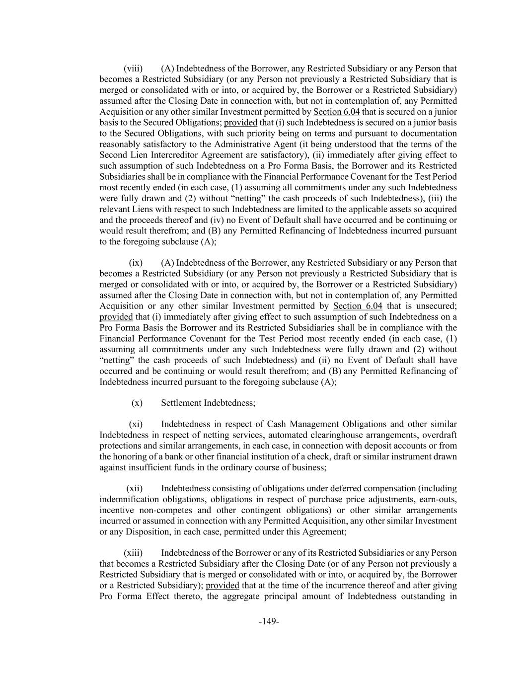 -149- (viii) (A) Indebtedness of the Borrower, any Restricted Subsidiary or any Person that becomes a Restricted Subsidiary (or any Person not previously a Restricted Subsidiary that is merged or consolidated with or into, or acquired by, the Borrower or a Restricted Subsidiary) assumed after the Closing Date in connection with, but not in contemplation of, any Permitted Acquisition or any other similar Investment permitted by Section 6.04 that is secured on a junior basis to the Secured Obligations; provided that (i) such Indebtedness is secured on a junior basis to the Secured Obligations, with such priority being on terms and pursuant to documentation reasonably satisfactory to the Administrative Agent (it being understood that the terms of the Second Lien Intercreditor Agreement are satisfactory), (ii) immediately after giving effect to such assumption of such Indebtedness on a Pro Forma Basis, the Borrower and its Restricted Subsidiaries shall be in compliance with the Financial Performance Covenant for the Test Period most recently ended (in each case, (1) assuming all commitments under any such Indebtedness were fully drawn and (2) without “netting” the cash proceeds of such Indebtedness), (iii) the relevant Liens with respect to such Indebtedness are limited to the applicable assets so acquired and the proceeds thereof and (iv) no Event of Default shall have occurred and be continuing or would result therefrom; and (B) any Permitted Refinancing of Indebtedness incurred pursuant to the foregoing subclause (A); (ix) (A) Indebtedness of the Borrower, any Restricted Subsidiary or any Person that becomes a Restricted Subsidiary (or any Person not previously a Restricted Subsidiary that is merged or consolidated with or into, or acquired by, the Borrower or a Restricted Subsidiary) assumed after the Closing Date in connection with, but not in contemplation of, any Permitted Acquisition or any other similar Investment permitted by Section 6.04 that is unsecured; provided that (i) immediately after giving effect to such assumption of such Indebtedness on a Pro Forma Basis the Borrower and its Restricted Subsidiaries shall be in compliance with the Financial Performance Covenant for the Test Period most recently ended (in each case, (1) assuming all commitments under any such Indebtedness were fully drawn and (2) without “netting” the cash proceeds of such Indebtedness) and (ii) no Event of Default shall have occurred and be continuing or would result therefrom; and (B) any Permitted Refinancing of Indebtedness incurred pursuant to the foregoing subclause (A); (x) Settlement Indebtedness; (xi) Indebtedness in respect of Cash Management Obligations and other similar Indebtedness in respect of netting services, automated clearinghouse arrangements, overdraft protections and similar arrangements, in each case, in connection with deposit accounts or from the honoring of a bank or other financial institution of a check, draft or similar instrument drawn against insufficient funds in the ordinary course of business; (xii) Indebtedness consisting of obligations under deferred compensation (including indemnification obligations, obligations in respect of purchase price adjustments, earn-outs, incentive non-competes and other contingent obligations) or other similar arrangements incurred or assumed in connection with any Permitted Acquisition, any other similar Investment or any Disposition, in each case, permitted under this Agreement; (xiii) Indebtedness of the Borrower or any of its Restricted Subsidiaries or any Person that becomes a Restricted Subsidiary after the Closing Date (or of any Person not previously a Restricted Subsidiary that is merged or consolidated with or into, or acquired by, the Borrower or a Restricted Subsidiary); provided that at the time of the incurrence thereof and after giving Pro Forma Effect thereto, the aggregate principal amount of Indebtedness outstanding in