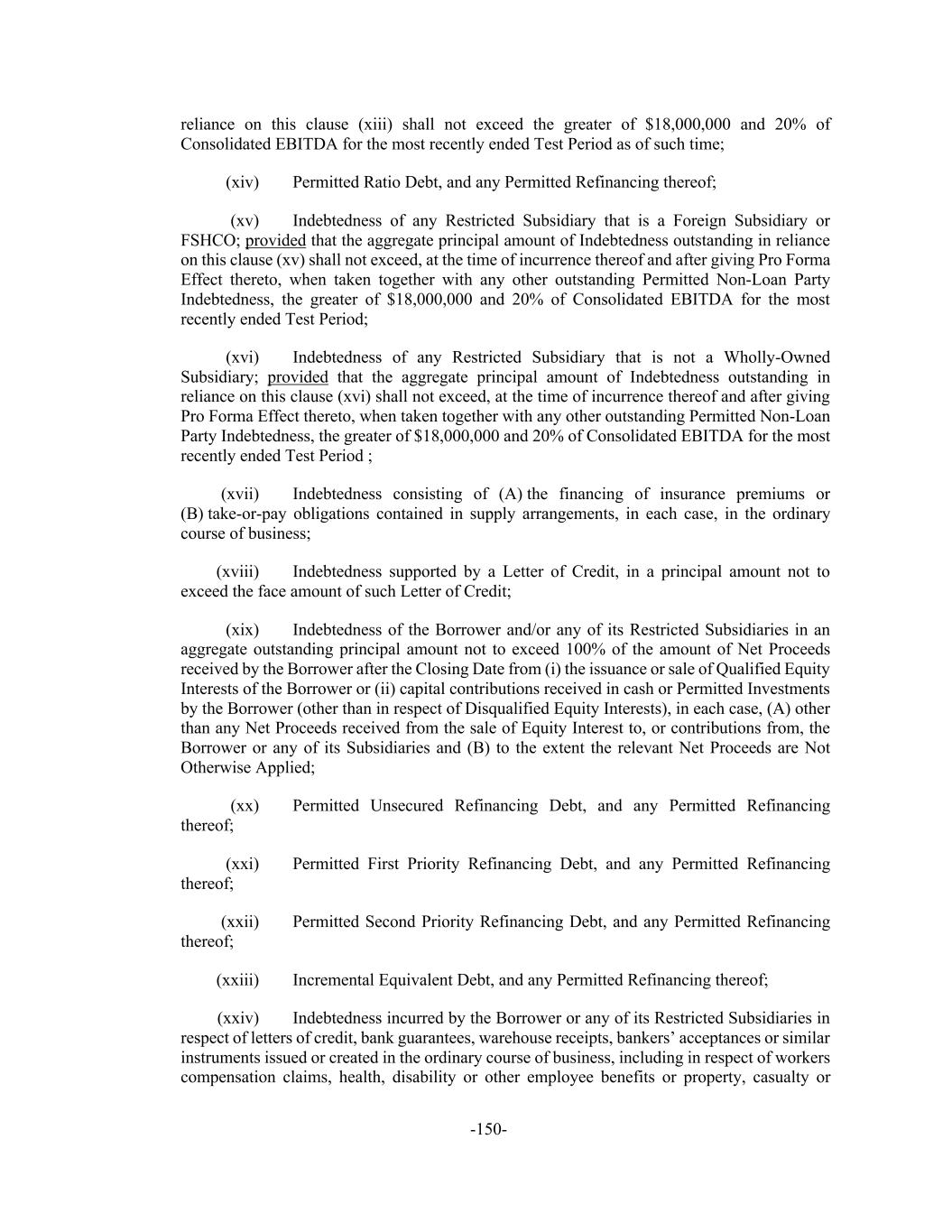 -150- reliance on this clause (xiii) shall not exceed the greater of $18,000,000 and 20% of Consolidated EBITDA for the most recently ended Test Period as of such time; (xiv) Permitted Ratio Debt, and any Permitted Refinancing thereof; (xv) Indebtedness of any Restricted Subsidiary that is a Foreign Subsidiary or FSHCO; provided that the aggregate principal amount of Indebtedness outstanding in reliance on this clause (xv) shall not exceed, at the time of incurrence thereof and after giving Pro Forma Effect thereto, when taken together with any other outstanding Permitted Non-Loan Party Indebtedness, the greater of $18,000,000 and 20% of Consolidated EBITDA for the most recently ended Test Period; (xvi) Indebtedness of any Restricted Subsidiary that is not a Wholly-Owned Subsidiary; provided that the aggregate principal amount of Indebtedness outstanding in reliance on this clause (xvi) shall not exceed, at the time of incurrence thereof and after giving Pro Forma Effect thereto, when taken together with any other outstanding Permitted Non-Loan Party Indebtedness, the greater of $18,000,000 and 20% of Consolidated EBITDA for the most recently ended Test Period ; (xvii) Indebtedness consisting of (A) the financing of insurance premiums or (B) take-or-pay obligations contained in supply arrangements, in each case, in the ordinary course of business; (xviii) Indebtedness supported by a Letter of Credit, in a principal amount not to exceed the face amount of such Letter of Credit; (xix) Indebtedness of the Borrower and/or any of its Restricted Subsidiaries in an aggregate outstanding principal amount not to exceed 100% of the amount of Net Proceeds received by the Borrower after the Closing Date from (i) the issuance or sale of Qualified Equity Interests of the Borrower or (ii) capital contributions received in cash or Permitted Investments by the Borrower (other than in respect of Disqualified Equity Interests), in each case, (A) other than any Net Proceeds received from the sale of Equity Interest to, or contributions from, the Borrower or any of its Subsidiaries and (B) to the extent the relevant Net Proceeds are Not Otherwise Applied; (xx) Permitted Unsecured Refinancing Debt, and any Permitted Refinancing thereof; (xxi) Permitted First Priority Refinancing Debt, and any Permitted Refinancing thereof; (xxii) Permitted Second Priority Refinancing Debt, and any Permitted Refinancing thereof; (xxiii) Incremental Equivalent Debt, and any Permitted Refinancing thereof; (xxiv) Indebtedness incurred by the Borrower or any of its Restricted Subsidiaries in respect of letters of credit, bank guarantees, warehouse receipts, bankers’ acceptances or similar instruments issued or created in the ordinary course of business, including in respect of workers compensation claims, health, disability or other employee benefits or property, casualty or