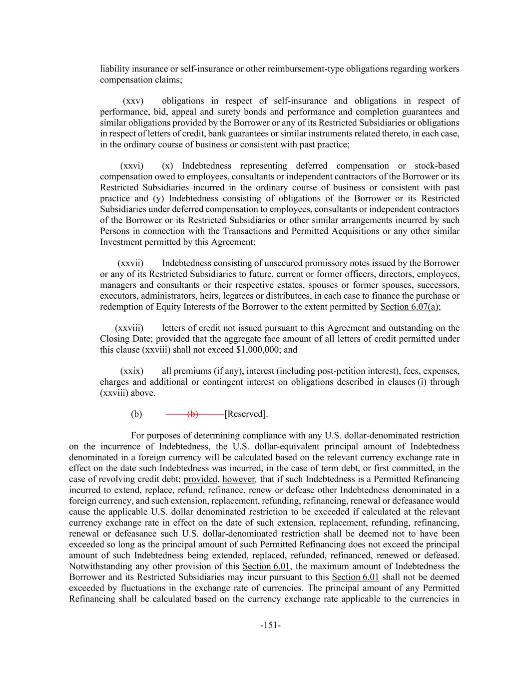 -151- liability insurance or self-insurance or other reimbursement-type obligations regarding workers compensation claims; (xxv) obligations in respect of self-insurance and obligations in respect of performance, bid, appeal and surety bonds and performance and completion guarantees and similar obligations provided by the Borrower or any of its Restricted Subsidiaries or obligations in respect of letters of credit, bank guarantees or similar instruments related thereto, in each case, in the ordinary course of business or consistent with past practice; (xxvi) (x) Indebtedness representing deferred compensation or stock-based compensation owed to employees, consultants or independent contractors of the Borrower or its Restricted Subsidiaries incurred in the ordinary course of business or consistent with past practice and (y) Indebtedness consisting of obligations of the Borrower or its Restricted Subsidiaries under deferred compensation to employees, consultants or independent contractors of the Borrower or its Restricted Subsidiaries or other similar arrangements incurred by such Persons in connection with the Transactions and Permitted Acquisitions or any other similar Investment permitted by this Agreement; (xxvii) Indebtedness consisting of unsecured promissory notes issued by the Borrower or any of its Restricted Subsidiaries to future, current or former officers, directors, employees, managers and consultants or their respective estates, spouses or former spouses, successors, executors, administrators, heirs, legatees or distributees, in each case to finance the purchase or redemption of Equity Interests of the Borrower to the extent permitted by Section 6.07(a); (xxviii) letters of credit not issued pursuant to this Agreement and outstanding on the Closing Date; provided that the aggregate face amount of all letters of credit permitted under this clause (xxviii) shall not exceed $1,000,000; and (xxix) all premiums (if any), interest (including post-petition interest), fees, expenses, charges and additional or contingent interest on obligations described in clauses (i) through (xxviii) above. (b) (b) [Reserved]. For purposes of determining compliance with any U.S. dollar-denominated restriction on the incurrence of Indebtedness, the U.S. dollar-equivalent principal amount of Indebtedness denominated in a foreign currency will be calculated based on the relevant currency exchange rate in effect on the date such Indebtedness was incurred, in the case of term debt, or first committed, in the case of revolving credit debt; provided, however, that if such Indebtedness is a Permitted Refinancing incurred to extend, replace, refund, refinance, renew or defease other Indebtedness denominated in a foreign currency, and such extension, replacement, refunding, refinancing, renewal or defeasance would cause the applicable U.S. dollar denominated restriction to be exceeded if calculated at the relevant currency exchange rate in effect on the date of such extension, replacement, refunding, refinancing, renewal or defeasance such U.S. dollar-denominated restriction shall be deemed not to have been exceeded so long as the principal amount of such Permitted Refinancing does not exceed the principal amount of such Indebtedness being extended, replaced, refunded, refinanced, renewed or defeased. Notwithstanding any other provision of this Section 6.01, the maximum amount of Indebtedness the Borrower and its Restricted Subsidiaries may incur pursuant to this Section 6.01 shall not be deemed exceeded by fluctuations in the exchange rate of currencies. The principal amount of any Permitted Refinancing shall be calculated based on the currency exchange rate applicable to the currencies in