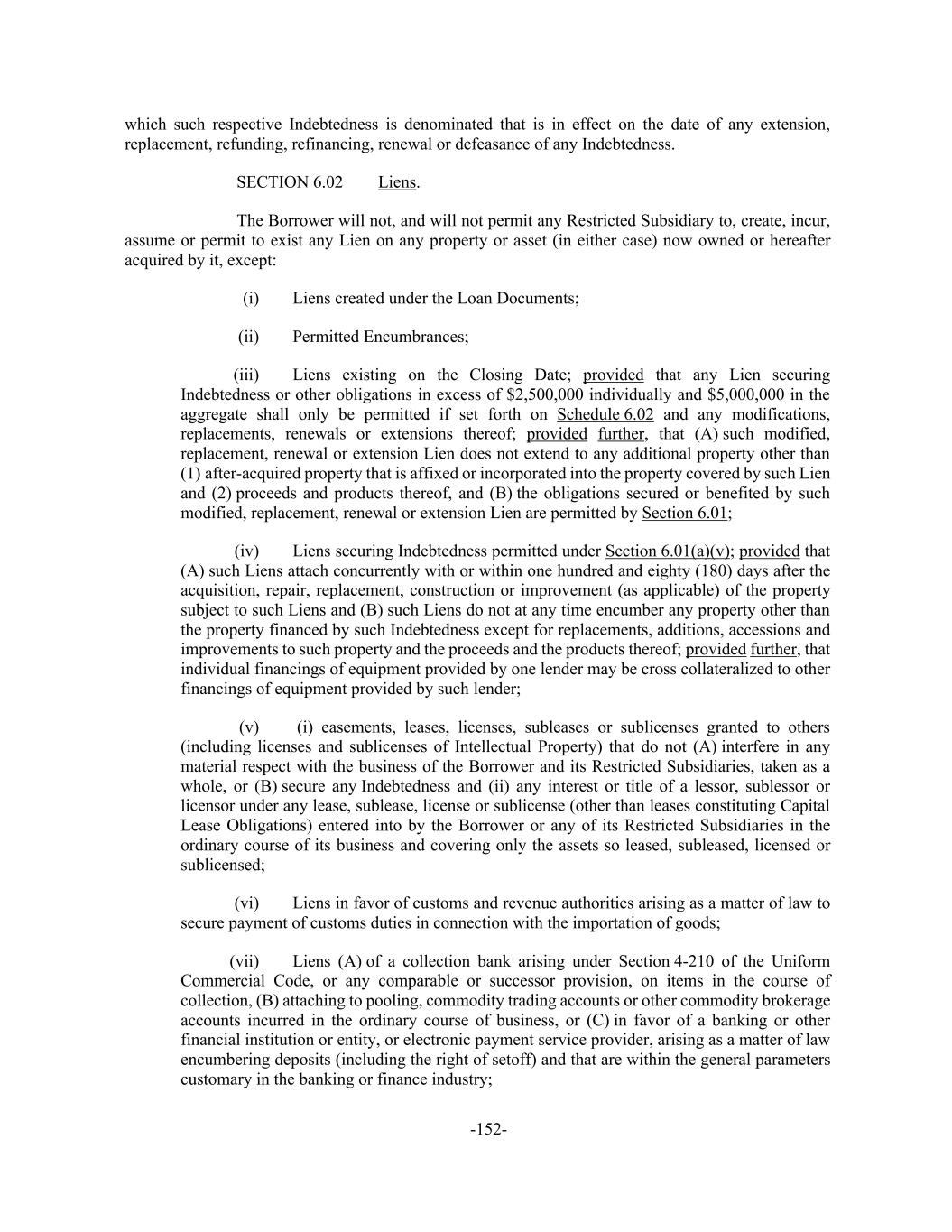 -152- which such respective Indebtedness is denominated that is in effect on the date of any extension, replacement, refunding, refinancing, renewal or defeasance of any Indebtedness. SECTION 6.02 Liens. The Borrower will not, and will not permit any Restricted Subsidiary to, create, incur, assume or permit to exist any Lien on any property or asset (in either case) now owned or hereafter acquired by it, except: (i) Liens created under the Loan Documents; (ii) Permitted Encumbrances; (iii) Liens existing on the Closing Date; provided that any Lien securing Indebtedness or other obligations in excess of $2,500,000 individually and $5,000,000 in the aggregate shall only be permitted if set forth on Schedule 6.02 and any modifications, replacements, renewals or extensions thereof; provided further, that (A) such modified, replacement, renewal or extension Lien does not extend to any additional property other than (1) after-acquired property that is affixed or incorporated into the property covered by such Lien and (2) proceeds and products thereof, and (B) the obligations secured or benefited by such modified, replacement, renewal or extension Lien are permitted by Section 6.01; (iv) Liens securing Indebtedness permitted under Section 6.01(a)(v); provided that (A) such Liens attach concurrently with or within one hundred and eighty (180) days after the acquisition, repair, replacement, construction or improvement (as applicable) of the property subject to such Liens and (B) such Liens do not at any time encumber any property other than the property financed by such Indebtedness except for replacements, additions, accessions and improvements to such property and the proceeds and the products thereof; provided further, that individual financings of equipment provided by one lender may be cross collateralized to other financings of equipment provided by such lender; (v) (i) easements, leases, licenses, subleases or sublicenses granted to others (including licenses and sublicenses of Intellectual Property) that do not (A) interfere in any material respect with the business of the Borrower and its Restricted Subsidiaries, taken as a whole, or (B) secure any Indebtedness and (ii) any interest or title of a lessor, sublessor or licensor under any lease, sublease, license or sublicense (other than leases constituting Capital Lease Obligations) entered into by the Borrower or any of its Restricted Subsidiaries in the ordinary course of its business and covering only the assets so leased, subleased, licensed or sublicensed; (vi) Liens in favor of customs and revenue authorities arising as a matter of law to secure payment of customs duties in connection with the importation of goods; (vii) Liens (A) of a collection bank arising under Section 4-210 of the Uniform Commercial Code, or any comparable or successor provision, on items in the course of collection, (B) attaching to pooling, commodity trading accounts or other commodity brokerage accounts incurred in the ordinary course of business, or (C) in favor of a banking or other financial institution or entity, or electronic payment service provider, arising as a matter of law encumbering deposits (including the right of setoff) and that are within the general parameters customary in the banking or finance industry;