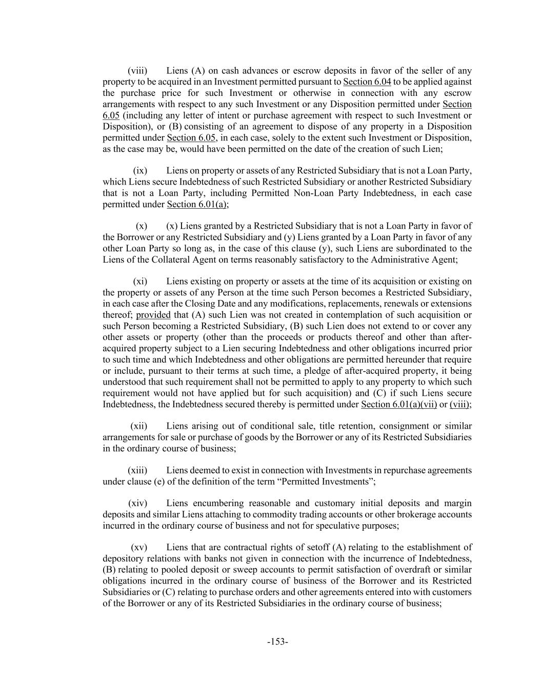 -153- (viii) Liens (A) on cash advances or escrow deposits in favor of the seller of any property to be acquired in an Investment permitted pursuant to Section 6.04 to be applied against the purchase price for such Investment or otherwise in connection with any escrow arrangements with respect to any such Investment or any Disposition permitted under Section 6.05 (including any letter of intent or purchase agreement with respect to such Investment or Disposition), or (B) consisting of an agreement to dispose of any property in a Disposition permitted under Section 6.05, in each case, solely to the extent such Investment or Disposition, as the case may be, would have been permitted on the date of the creation of such Lien; (ix) Liens on property or assets of any Restricted Subsidiary that is not a Loan Party, which Liens secure Indebtedness of such Restricted Subsidiary or another Restricted Subsidiary that is not a Loan Party, including Permitted Non-Loan Party Indebtedness, in each case permitted under Section 6.01(a); (x) (x) Liens granted by a Restricted Subsidiary that is not a Loan Party in favor of the Borrower or any Restricted Subsidiary and (y) Liens granted by a Loan Party in favor of any other Loan Party so long as, in the case of this clause (y), such Liens are subordinated to the Liens of the Collateral Agent on terms reasonably satisfactory to the Administrative Agent; (xi) Liens existing on property or assets at the time of its acquisition or existing on the property or assets of any Person at the time such Person becomes a Restricted Subsidiary, in each case after the Closing Date and any modifications, replacements, renewals or extensions thereof; provided that (A) such Lien was not created in contemplation of such acquisition or such Person becoming a Restricted Subsidiary, (B) such Lien does not extend to or cover any other assets or property (other than the proceeds or products thereof and other than after- acquired property subject to a Lien securing Indebtedness and other obligations incurred prior to such time and which Indebtedness and other obligations are permitted hereunder that require or include, pursuant to their terms at such time, a pledge of after-acquired property, it being understood that such requirement shall not be permitted to apply to any property to which such requirement would not have applied but for such acquisition) and (C) if such Liens secure Indebtedness, the Indebtedness secured thereby is permitted under Section 6.01(a)(vii) or (viii); (xii) Liens arising out of conditional sale, title retention, consignment or similar arrangements for sale or purchase of goods by the Borrower or any of its Restricted Subsidiaries in the ordinary course of business; (xiii) Liens deemed to exist in connection with Investments in repurchase agreements under clause (e) of the definition of the term “Permitted Investments”; (xiv) Liens encumbering reasonable and customary initial deposits and margin deposits and similar Liens attaching to commodity trading accounts or other brokerage accounts incurred in the ordinary course of business and not for speculative purposes; (xv) Liens that are contractual rights of setoff (A) relating to the establishment of depository relations with banks not given in connection with the incurrence of Indebtedness, (B) relating to pooled deposit or sweep accounts to permit satisfaction of overdraft or similar obligations incurred in the ordinary course of business of the Borrower and its Restricted Subsidiaries or (C) relating to purchase orders and other agreements entered into with customers of the Borrower or any of its Restricted Subsidiaries in the ordinary course of business;