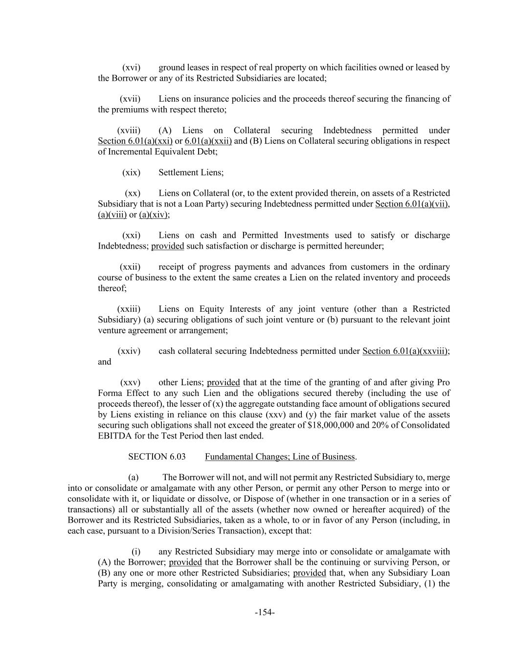 -154- (xvi) ground leases in respect of real property on which facilities owned or leased by the Borrower or any of its Restricted Subsidiaries are located; (xvii) Liens on insurance policies and the proceeds thereof securing the financing of the premiums with respect thereto; (xviii) (A) Liens on Collateral securing Indebtedness permitted under Section 6.01(a)(xxi) or 6.01(a)(xxii) and (B) Liens on Collateral securing obligations in respect of Incremental Equivalent Debt; (xix) Settlement Liens; (xx) Liens on Collateral (or, to the extent provided therein, on assets of a Restricted Subsidiary that is not a Loan Party) securing Indebtedness permitted under Section 6.01(a)(vii), (a)(viii) or (a)(xiv); (xxi) Liens on cash and Permitted Investments used to satisfy or discharge Indebtedness; provided such satisfaction or discharge is permitted hereunder; (xxii) receipt of progress payments and advances from customers in the ordinary course of business to the extent the same creates a Lien on the related inventory and proceeds thereof; (xxiii) Liens on Equity Interests of any joint venture (other than a Restricted Subsidiary) (a) securing obligations of such joint venture or (b) pursuant to the relevant joint venture agreement or arrangement; (xxiv) cash collateral securing Indebtedness permitted under Section 6.01(a)(xxviii); and (xxv) other Liens; provided that at the time of the granting of and after giving Pro Forma Effect to any such Lien and the obligations secured thereby (including the use of proceeds thereof), the lesser of (x) the aggregate outstanding face amount of obligations secured by Liens existing in reliance on this clause (xxv) and (y) the fair market value of the assets securing such obligations shall not exceed the greater of $18,000,000 and 20% of Consolidated EBITDA for the Test Period then last ended. SECTION 6.03 Fundamental Changes; Line of Business. (a) The Borrower will not, and will not permit any Restricted Subsidiary to, merge into or consolidate or amalgamate with any other Person, or permit any other Person to merge into or consolidate with it, or liquidate or dissolve, or Dispose of (whether in one transaction or in a series of transactions) all or substantially all of the assets (whether now owned or hereafter acquired) of the Borrower and its Restricted Subsidiaries, taken as a whole, to or in favor of any Person (including, in each case, pursuant to a Division/Series Transaction), except that: (i) any Restricted Subsidiary may merge into or consolidate or amalgamate with (A) the Borrower; provided that the Borrower shall be the continuing or surviving Person, or (B) any one or more other Restricted Subsidiaries; provided that, when any Subsidiary Loan Party is merging, consolidating or amalgamating with another Restricted Subsidiary, (1) the