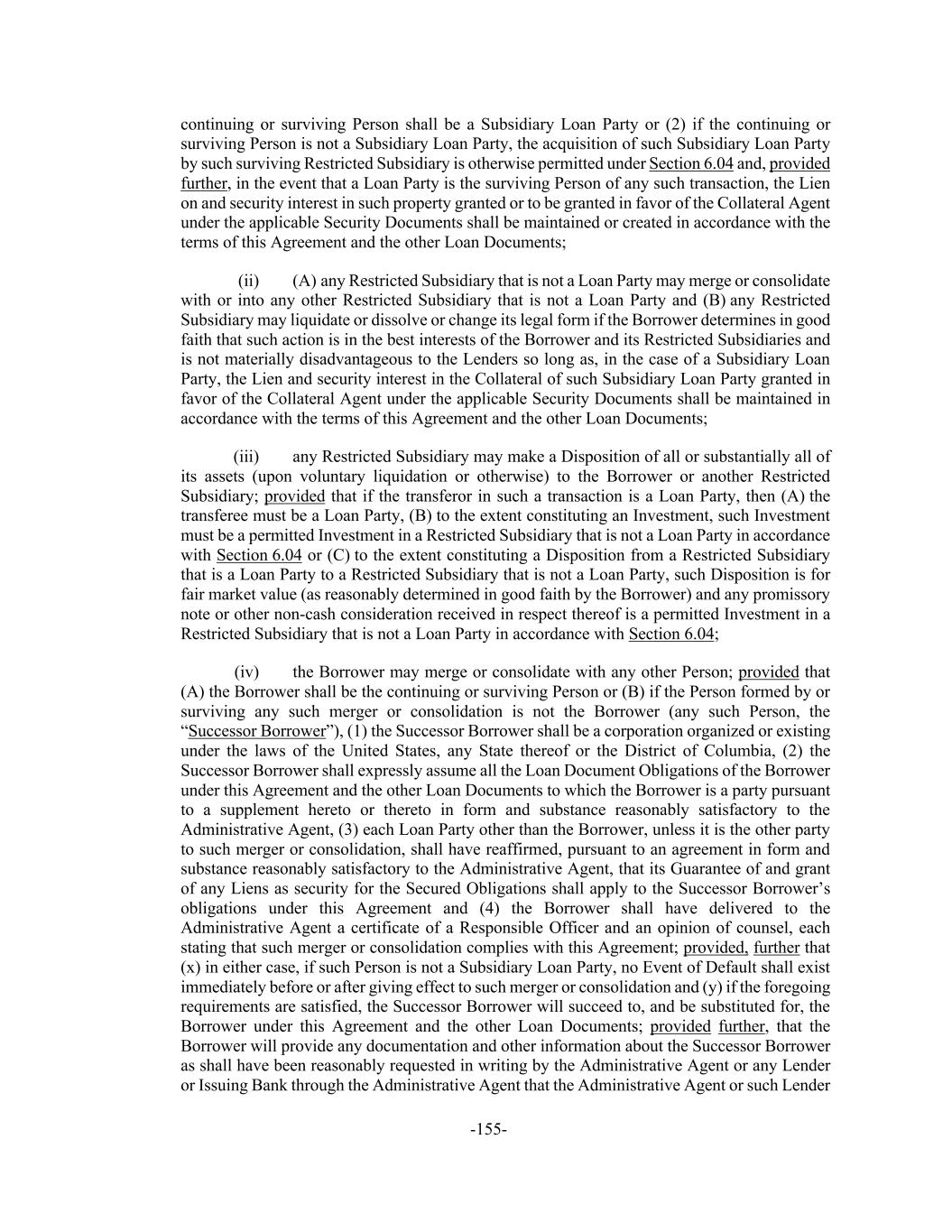 -155- continuing or surviving Person shall be a Subsidiary Loan Party or (2) if the continuing or surviving Person is not a Subsidiary Loan Party, the acquisition of such Subsidiary Loan Party by such surviving Restricted Subsidiary is otherwise permitted under Section 6.04 and, provided further, in the event that a Loan Party is the surviving Person of any such transaction, the Lien on and security interest in such property granted or to be granted in favor of the Collateral Agent under the applicable Security Documents shall be maintained or created in accordance with the terms of this Agreement and the other Loan Documents; (ii) (A) any Restricted Subsidiary that is not a Loan Party may merge or consolidate with or into any other Restricted Subsidiary that is not a Loan Party and (B) any Restricted Subsidiary may liquidate or dissolve or change its legal form if the Borrower determines in good faith that such action is in the best interests of the Borrower and its Restricted Subsidiaries and is not materially disadvantageous to the Lenders so long as, in the case of a Subsidiary Loan Party, the Lien and security interest in the Collateral of such Subsidiary Loan Party granted in favor of the Collateral Agent under the applicable Security Documents shall be maintained in accordance with the terms of this Agreement and the other Loan Documents; (iii) any Restricted Subsidiary may make a Disposition of all or substantially all of its assets (upon voluntary liquidation or otherwise) to the Borrower or another Restricted Subsidiary; provided that if the transferor in such a transaction is a Loan Party, then (A) the transferee must be a Loan Party, (B) to the extent constituting an Investment, such Investment must be a permitted Investment in a Restricted Subsidiary that is not a Loan Party in accordance with Section 6.04 or (C) to the extent constituting a Disposition from a Restricted Subsidiary that is a Loan Party to a Restricted Subsidiary that is not a Loan Party, such Disposition is for fair market value (as reasonably determined in good faith by the Borrower) and any promissory note or other non-cash consideration received in respect thereof is a permitted Investment in a Restricted Subsidiary that is not a Loan Party in accordance with Section 6.04; (iv) the Borrower may merge or consolidate with any other Person; provided that (A) the Borrower shall be the continuing or surviving Person or (B) if the Person formed by or surviving any such merger or consolidation is not the Borrower (any such Person, the “Successor Borrower”), (1) the Successor Borrower shall be a corporation organized or existing under the laws of the United States, any State thereof or the District of Columbia, (2) the Successor Borrower shall expressly assume all the Loan Document Obligations of the Borrower under this Agreement and the other Loan Documents to which the Borrower is a party pursuant to a supplement hereto or thereto in form and substance reasonably satisfactory to the Administrative Agent, (3) each Loan Party other than the Borrower, unless it is the other party to such merger or consolidation, shall have reaffirmed, pursuant to an agreement in form and substance reasonably satisfactory to the Administrative Agent, that its Guarantee of and grant of any Liens as security for the Secured Obligations shall apply to the Successor Borrower’s obligations under this Agreement and (4) the Borrower shall have delivered to the Administrative Agent a certificate of a Responsible Officer and an opinion of counsel, each stating that such merger or consolidation complies with this Agreement; provided, further that (x) in either case, if such Person is not a Subsidiary Loan Party, no Event of Default shall exist immediately before or after giving effect to such merger or consolidation and (y) if the foregoing requirements are satisfied, the Successor Borrower will succeed to, and be substituted for, the Borrower under this Agreement and the other Loan Documents; provided further, that the Borrower will provide any documentation and other information about the Successor Borrower as shall have been reasonably requested in writing by the Administrative Agent or any Lender or Issuing Bank through the Administrative Agent that the Administrative Agent or such Lender